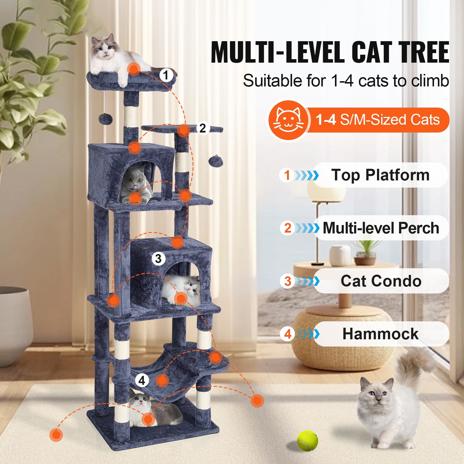 KFFKFF Cat Activity Center: This multi-level cat tree is designed for 1-4 small to medium-sized cats. With various height platforms, it allows cats to freely climb and explore, satisfying their natural instincts. Cats’ Cozy Haven: Our cat tower features 2 spacious cat condos, a top perch, and a comfortable hammock, providing a private and secure resting environment for your feline friends. Multiple platforms offer cats the freedom to choose their preferred play and rest spots. The soft plush surfaces are gentle on their skin and claws, ensuring a cozy lounging experience. Joyful Playtime for Cats: The hanging ball toys and spring balls on the cat scratching tree are designed to attract cats’ attention and stimulate their playfulness. The sisal-wrapped scratching posts allow cats to stretch and exercise, keeping them active, relieving boredom and stress, and preventing furniture damage. Easy Installation: Our cat tree for indoor cats comes with pre-drilled holes and detailed assembly instructions, making installation effortless. All necessary screws, bolts, wrenches, and expansion screw kits are included. Even first-time users of pet furniture can easily set it up, saving time and effort. Safe and Stable: Made of P2 grade particle board, this cat house ensures excellent stability with its wide base and thickened sisal poles. It also includes an anti-toppling strap for wall fixation, preventing tipping and ensuring the safety of your cats. Suitable for various locations such as living rooms, bedrooms, balconies, courtyards, as well as pet stores, veterinary clinics, and grooming salons.