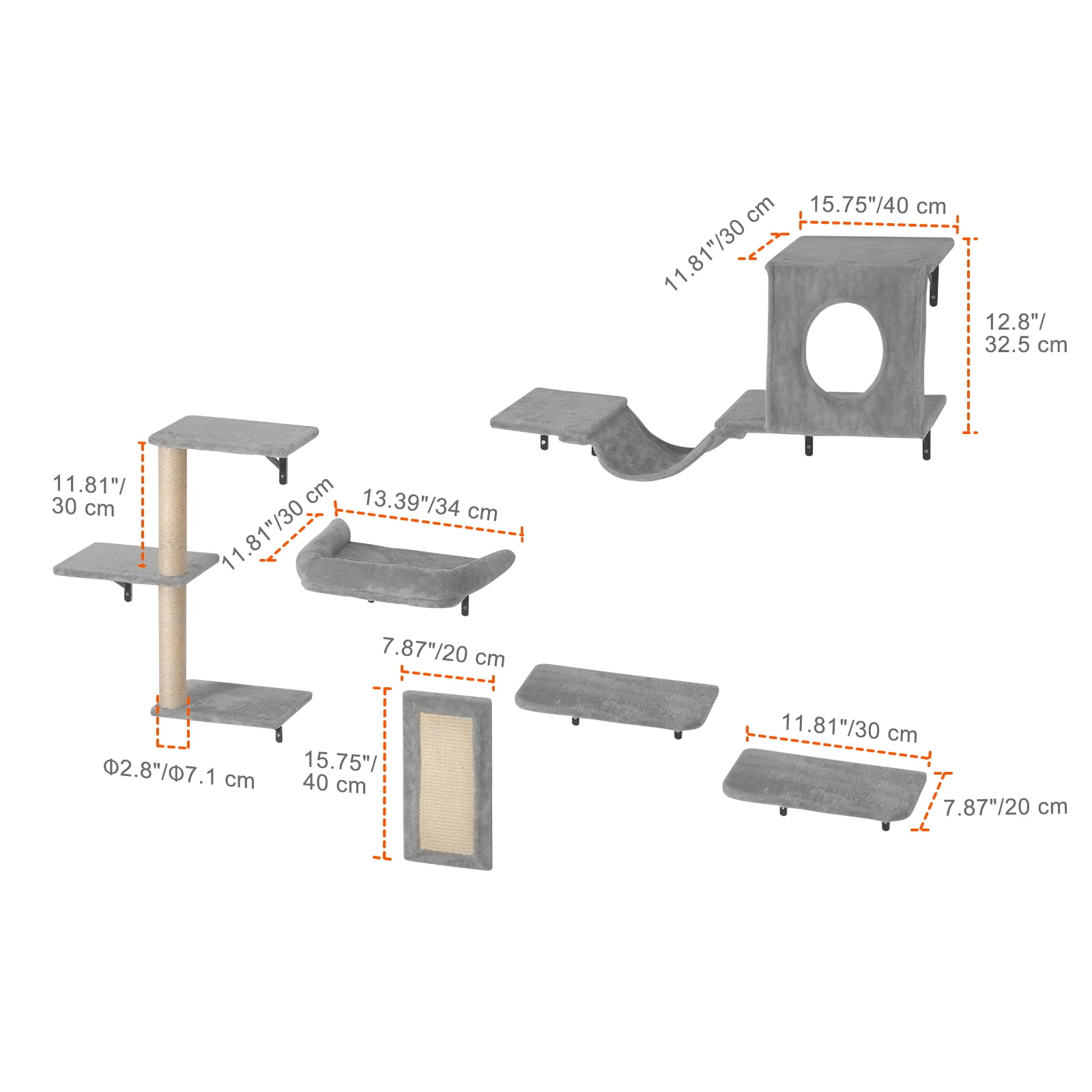KFFKFF Cat Wall Shelf Set: This cat playground includes 2 jumping boards, 1 hammock, 1 sofa, 1 cat tree & 1 cat grip, providing a variety of activities for your cat to climb, play, rest, and scratch. Your feline friend will have endless hours of fun and relaxation. Premium Quality and Comfort: Crafted from durable particle board and a sturdy metal frame, this wall mounted cat shelf can support up to 40 lbs (18.14 kg). The natural pine wood is safe and odorless, ensuring your cat’s safety while climbing and playing. The platform surface is covered with a plush pad for slip-resistance and softness, keeping your cat’s paws comfortable. Quick and Easy Installation: Our cat wall shelf set includes all necessary accessories and a detailed installation guide. Simply follow the steps, insert the expansion tubes into the wall, and secure the boards using screws. The straightforward installation process allows one person to set it up effortlessly in no time. Complete Mounting Accessories: We provide metal screws, expansion tubes, butterfly anchors, a screwdriver, T-shaped hex screwdriver, and an installation diagram for hassle-free mounting on various wall types. Everything you need is included in the package. Versatile and Stylish Design: Our cat wall shelf set can be arranged freely to fit different spaces and preferences. The minimalist and cute design of the wall-mounted setup saves valuable floor space and seamlessly blends with your home decor. Whether installed in the living room, bedroom, or patio wall, it will enhance the overall aesthetic of your space.