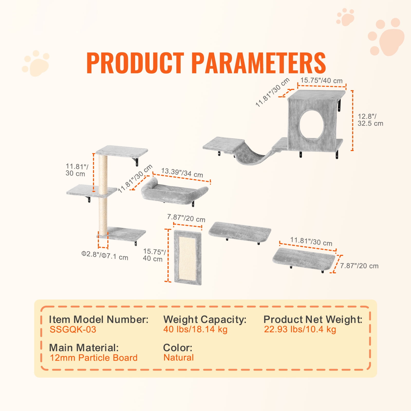 Product Description KFFKFF Wall-Mounted Cat Shelves- A Haven for Your Furry Friend! Indulge your beloved feline with our innovative wall-mounted cat shelves. These captivating shelves offer a plethora of exciting features including jumping boards, a cozy hammock, a comfortable sofa, a sturdy cat tree, and a secure cat grip. The possibilities are endless as you can effortlessly customize the setup to suit your cat’s preferences, allowing them to explore, play, and relax to their heart’s content. Crafted from premium pine wood, these shelves boast a robust and odor-free construction. Additionally, our shelves come with a wide range of mounting accessories that are compatible with various wall types, ensuring a hassle-free installation process. Stylish Cat Wall Shelves Introducing our innovative cat wall shelves that will revolutionize your feline friend’s playtime. This set includes 2 jumping boards, 1 hammock, 1 sofa, 1 cat tree, and 1 cat grip, providing endless opportunities for climbing, entertainment, resting, and scratching. Your cat will never get bored with these versatile and engaging shelves. Premium Quality and Safety Crafted with utmost care, our cat perches are constructed using high-quality particle board and a sturdy metal frame. This combination ensures exceptional stability, making it safe for your cat to explore and play. Rest assured, our materials are health-friendly and completely odorless, creating a secure and comfortable habitat for your beloved pet. Effortless Installation Setting up your cat’s new favorite hangout spot has never been easier. Our cat wall furniture set comes with a comprehensive range of accessories, allowing you to effortlessly mount it on any wall surface. Say goodbye to complicated installations and hello to convenience. Unmatched Comfort We understand the importance of comfort for your furry companion. That’s why we have enhanced the wooden surface of our shelves with a plush pad. This not only provides a strong slip-resistant surface but also ensures optimal comfort for your cat’s paws. Let your cat relax and enjoy their playtime to the fullest. Sleek and Functional Design Elevate your home decor with our sleek and functional cat wall shelves. The minimalist yet cute appearance seamlessly blends with any interior style, adding a touch of elegance to your living space. Let your cat’s play area become a stylish focal point in your home. Maximize Space with Ease Tired of cluttered floors? Our wall-mounted design allows you to maximize your space effortlessly. Create customizable DIY arrangements that suit your preferences and save valuable floor space. Give your cat the freedom to explore and play without compromising on your living area. Specifications Item Model Number: SSGQK-03 Main Material: 12mm Particle Board Weight Capacity: 40 lbs/18.14 kg Color: Natural Product Net Weight: 22.93 lbs/10.4 kg Jump Platform Size: 11.81″ x 7.87″/30 x 20 cm Cat House Size: 15.75″ x 11.81″ x 12.8″/40 x 30 x 32.5 cm Sofa Platform Size: 13.39″ x 11.81″ x 2.36″/34 x 30 x 6 cm Post Size: φ2.8″ x 11.81″/φ7.1 cm x 30 cm Cat Scratch Board Size: 15.75″ x 7.87″/40 x 20 cm Package Content 1 x Cat Wall Shelf Set