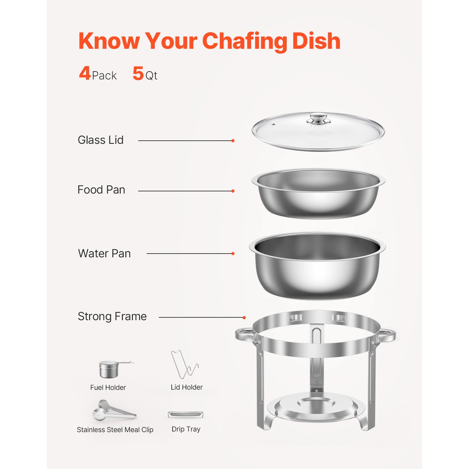 Product Description Enhance Your Food Presentation Introducing the KFFKFF chafing dish set, a must-have for caterers, event planners, and home entertainers. Crafted with high-quality stainless steel, this buffet warmer not only keeps your dishes at the perfect temperature but also adds a touch of elegance to your table setting. Its practical design ensures reliable and attractive food service, making it an essential item for any occasion. With a generous 5QT capacity, this chafing dish set allows you to serve ample amounts of food without compromising on style. Its space-saving design further adds to its appeal, making it a convenient choice for any event. Ample Space for Serving This chafing dish set offers a generous amount of space to accommodate food at parties and self-serve events, allowing you to serve at least 4 people with ease. Premium Quality Material Crafted with 201 stainless steel, this buffet chafing dish is not only resistant to rust but also effortless to clean. It ensures a stunning buffet setup that will impress your guests. Maintain Warm and Ready Food Equipped with fuel holders and pans, this chafing dish set allows you to heat water beneath the pans, ensuring a consistent temperature that keeps your food deliciously warm and ready to be savored by your guests. Transparent Glass Lid The clear glass window on the lid of this chafing dish allows your guests to peek inside without the need to open it, maintaining the warmth of the buffet without compromising presentation. Convenient Meal Clip As an added bonus, we provide you with a stainless steel meal clip that combines the functionality of a fork and spoon. This thoughtful tool enhances your dining experience by making it more convenient and enjoyable. Versatile Application Our chafer dish warmer is perfect for various settings, including restaurants, buffets, catering services, educational institutions, and corporate gatherings. It adds a touch of professionalism and elegance to the presentation of your cuisine. Specifications Item Model Number: JZYYXCL5LBL4 Quantity: 4 Color: Silver Material: Stainless Steel Food Pan Capacity: ≥5Qt / 4.7L Water Pan Capacity: ≥7Qt / 6.6L Heating Method: Fuel Product Weight: 27 lbs / 12.4 kg ±5 % Package Content 4 x Round Chafing Dishes 4 x Full-Size Food Pans 4 x Water Pans 4 x Drip Trays 4 x Fuel Holders 2 x Meal Clips (Stainless Steel) 4 x Frames (Lid & Fuel Tray Included) 4 x Handles 1 x Assembly Kit 1 x User Manual
