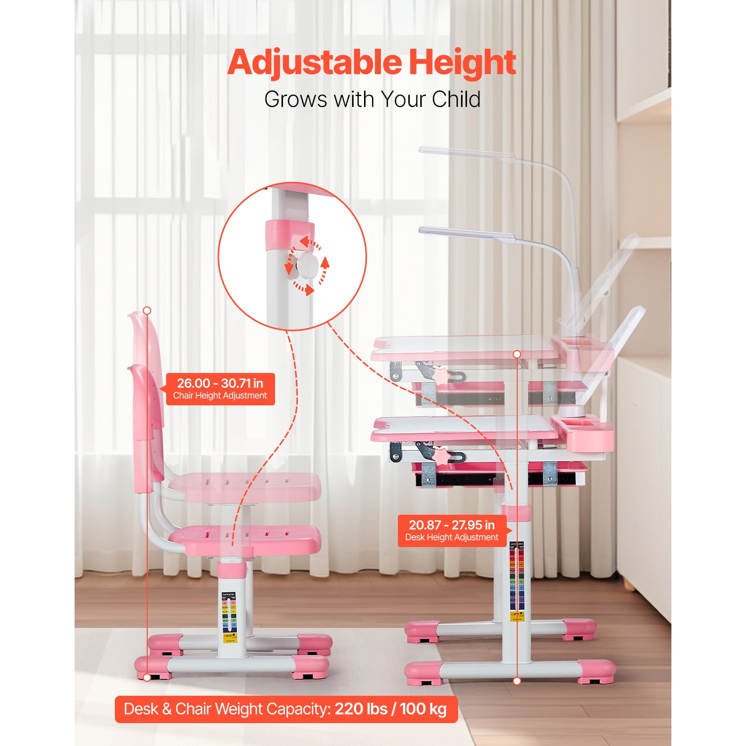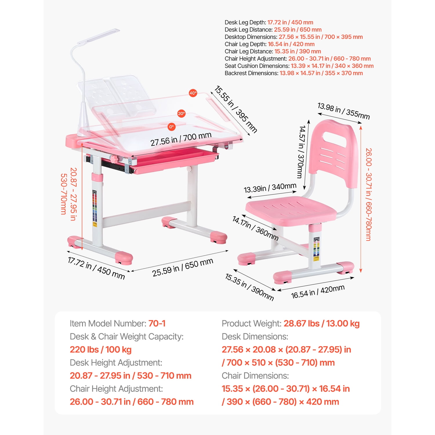 KFFKFF Children’s Stydying Table and Chair Set, Height from 20-27″ & 0-40° Tilt Desktop, Learning Table with Lamp for Bedroom, Study, Pink