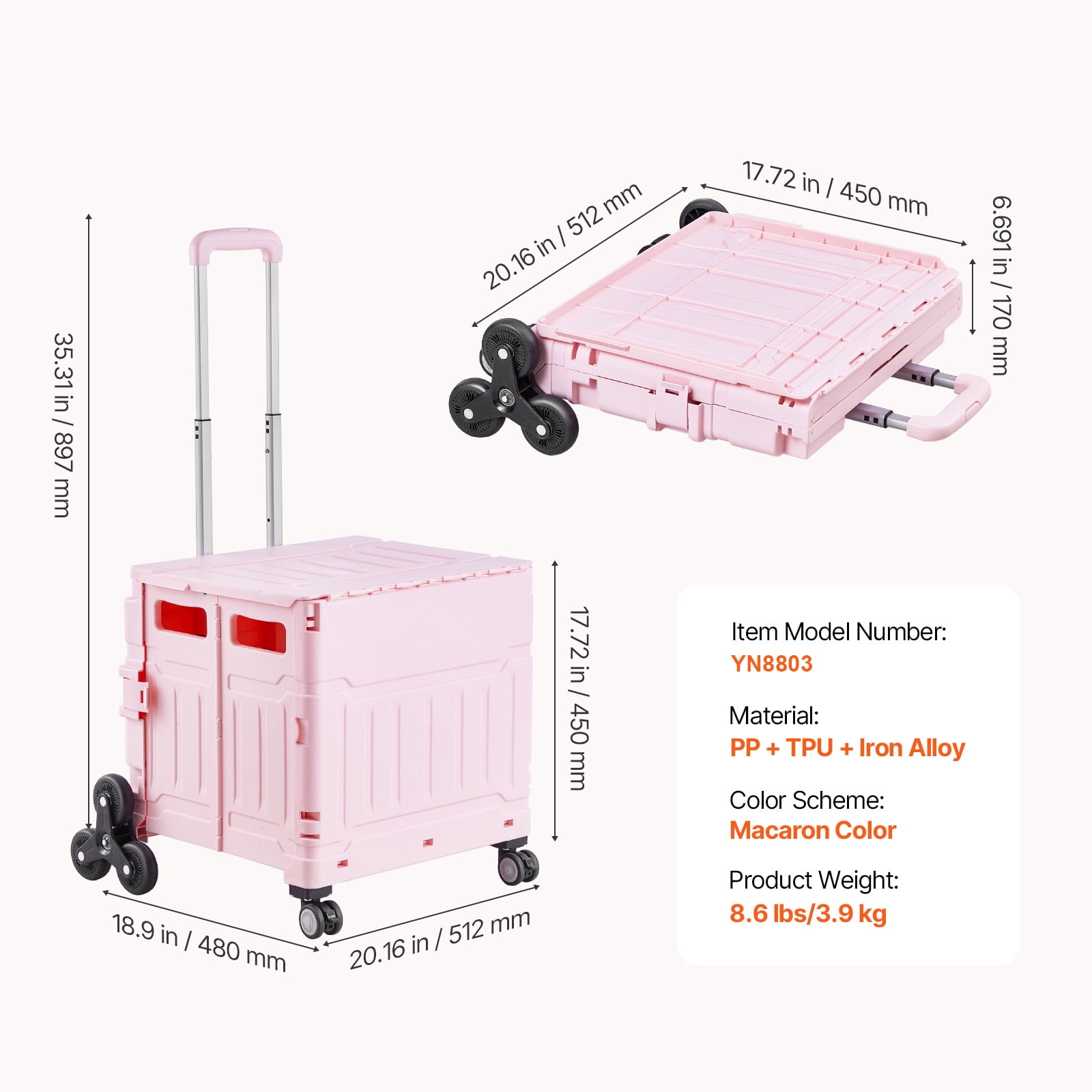 Product Description KFFKFF Stair Climbing Cart: The Ultimate Solution for Moving Day Introducing our innovative stair climbing cart, designed to make your moving day a breeze. Equipped with 6 climbing wheels and 4 universal wheels, this cart effortlessly maneuvers both up and down stairs as well as on the ground. Crafted from durable PP plastic, it offers exceptional stability, ensuring your load remains secure throughout the journey. The 2-level adjustable handle provides optimal comfort and convenience, allowing you to customize it according to your needs. When you’re finished, simply fold it up and effortlessly store it in your car trunk for easy transportation. With an impressive 65L capacity, this versatile cart serves as your reliable shopping companion, book transporter, toolbox, and camping storage solution all in one! Large Stair Climbing Cart with 65L Capacity Introducing the KFFKFF 65L Large Stair Climbing Cart, your ultimate companion for all your shopping and moving needs. With its spacious volume, this cart provides ample space to accommodate all your essentials. Effortless Maneuvering on Any Surface Experience smooth and hassle-free transportation with the KFFKFF Stair Cart. Equipped with a clever combination of 6 climbing wheels and 4 universal wheels, this cart allows for easy maneuvering on both flat surfaces and stairs. Customizable Handle Height Enjoy maximum comfort while pushing and pulling with the adjustable handle of our KFFKFF Stair Climbing Shopping Cart. With two different height options, you can customize it to your preferred level, ensuring a comfortable shopping experience. Convenient Folding and Storage Say goodbye to bulky carts that take up valuable space. The KFFKFF Stair Climber Cart can be easily folded up in a snap, allowing you to store it effortlessly in your car trunk, closet, or even under the bed. Experience the magic of space-saving! Versatile Cart for Every Occasion From mall shopping to home moving, toolbox storage to outdoor camping, the KFFKFF Stair Dolly is your go-to solution for any scenario. With its versatility, this cart offers infinite possibilities for all your needs. Easy to Clean and Maintain Cleaning and maintaining the KFFKFF Stair Climber Cart is a breeze. Its plastic surface is washable, allowing you to keep it spotless with minimal effort. Say goodbye to complicated maintenance routines and enjoy the simplicity and fun of keeping your cart clean. Specifications Item Model Number: YN8803 Load Capacity on Ground: 150 lbs/68 kg Load Capacity When Climbing: 55 lbs/25 kg Lid Load Capacity: 240 lbs/109 kg Material: PP + TPU + Iron Alloy Climbing Wheel Diameter: φ2.76″/70 mm Universal Wheel Diameter: φ1.77″/45 mm Volume: 65L Product Weight: 8.6 lbs/3.9 kg Folded Size: 20.16″ x 6.69″ x 17.72″/512 x 170 x 450 mm Fully Extended Size: 20.16″ x 18.9″ x 35.31″/512 x 480 x 897 mm Package Content 1 x Stair Climbing Cart 1 x User Manual