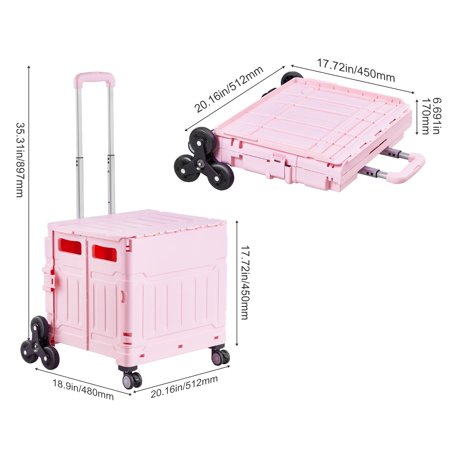 KFFKFF Collapsible Utility Cart, 65L Portable Folding Crate with Stair Navigating & 360° Rotating Wheels, Handheld Cart with Extendable Handle for Office Shopping Relocation Educator, Pink