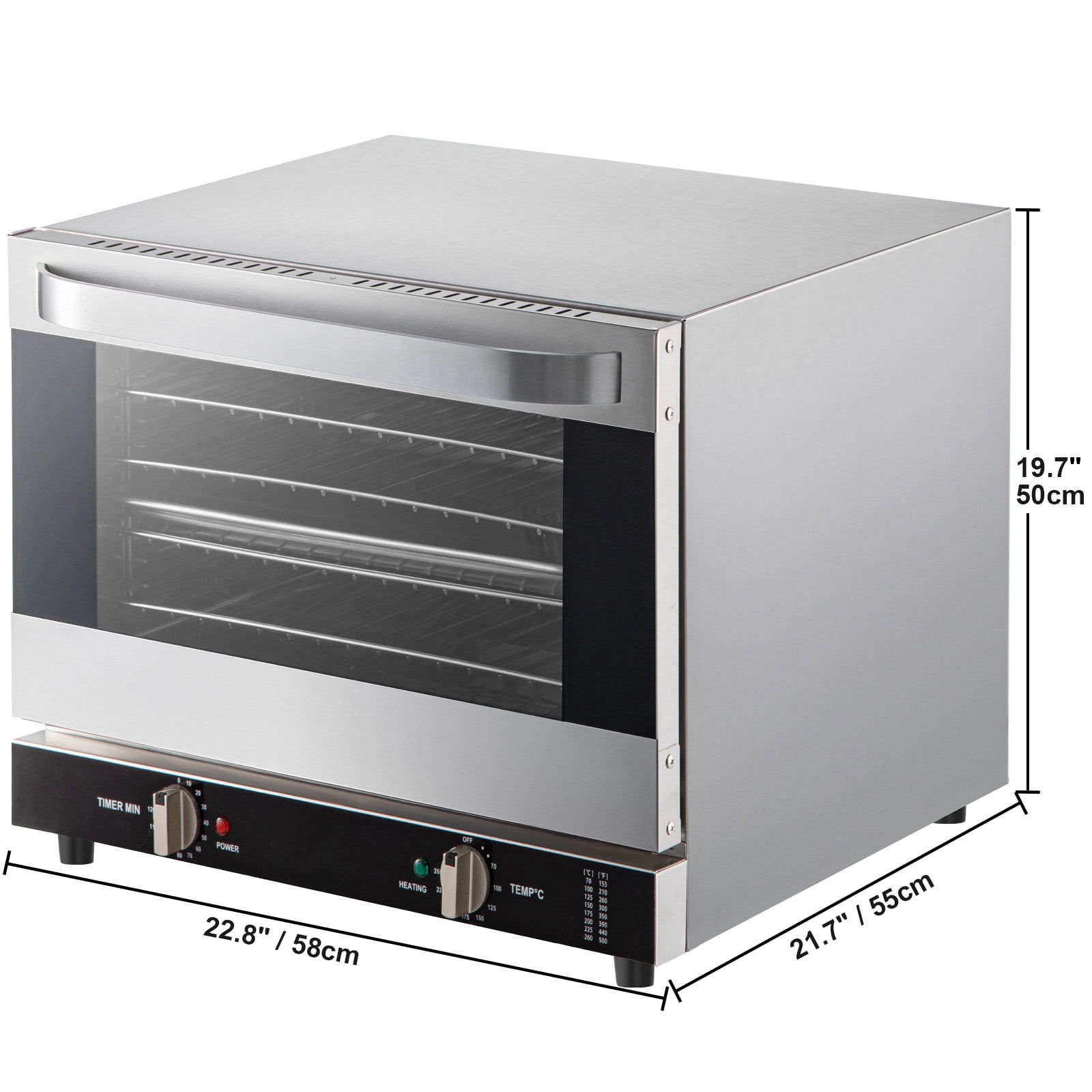 60Qt/66L Spacious Interior: Although compact, our commercial convection oven has an internal capacity of 60 quarts (66 liters), making it the perfect size for cooking large amounts of delicious food.The 4-layer interior measures 18.5″x15.4″x14.2″ (47x39x36 cm), making it ideal for party or commercial use. All-Round Hot Air Circulation: Baking with less oil can help you develop healthier eating habits than frying.With 1800W of power and a high-efficiency fan, our commercial countertop oven is sure to spread heat evenly throughout its body, baking food quickly.2 easy-to-operate knobs precisely control heating temperature and baking time.Heating temperature range: 150-500?F (65-250?C); Time setting: 0-120 minutes You can customize the cooking cycle to your specific needs. Stainless Body & Tempered Glass Door:The solid stainless steel interior and exterior are extremely durable, rust and corrosion resistant, and easy to clean.It also comes with a double-walled tempered glass door to prevent heat loss while allowing you to keep an eye on the cooking progress inside.The cool-touch aluminum handle is comfortable and secure to hold, and the oven light makes your food look attractive. Thoughtful Details & Accessories: Our ovens incorporate thoughtful details.Magnetic sealing strip locks in internal temperature, reducing heat loss.Dense vents promote air circulation and effectively dissipate heat.Under 4 feet enhances the stability of our machines on the tabletop.Plus, it comes complete with accessories for you to use right out of the box, including 4 grill racks (18.1″x13.0″), 1 food tray, 1 bread tong, and a pair of heat-resistant gloves. Applicable for Various Food Types: Our electric ovens are designed with dimensions of 22.8″x21.7″x19.7″ (580x550x500 mm), which are ideal for home and commercial use and are widely used in convenience stores, snack bars, kiosks, restaurants, off-site catering operations, etc.It bakes delicious pizza, bread, muffins, pastries, cookies, French fries, chicken and more quickly and easily.Additionally, the device requires a 120V power connection.