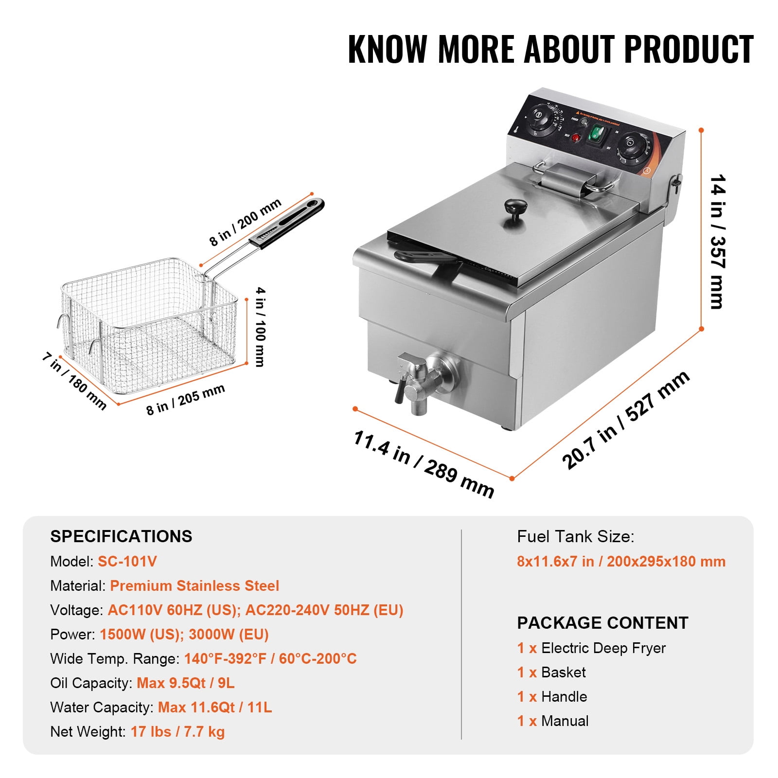 Spacious Design: Equipped with a 9.5Qt/9L oil reservoir (maximum water capacity: 11.6Qt/11L), this electric deep fryer is perfect for cooking a wide variety of foods and preserving their unique flavors. Ideal for delis, concession stands, snack bars and parties. Quickly Heat Your Meals: Tired of slow heating? This commercial electric deep fryer features a rugged heating element that quickly heats oil to your favorite temperature. Get ready for high temperatures! It allows you to cook your dishes quickly and evenly. Temperature & Timing Management: Effortlessly set the temperature between 140°F and 392°F (60-200°C) to suit your cooking needs. The fryer includes an automatic shut-off feature if the temperature exceeds 446℉ (230℃) or if the temperature controller malfunctions. Additionally, it comes with a built-in timer to ensure precise cooking. Thoughtful Design: The perfectly fitted lid reduces oil splatter effectively. Furthermore, the front hook allows for convenient hanging of the basket to expedite oil drainage. The indicator line helps you gauge the necessary amount of oil to add. Effortless Cleaning: The heating tube is designed to flip up conveniently, simplifying the cleaning process after each use. The stainless steel exterior allows for easy wiping, while the tank features a front-mounted drain valve for simple oil drainage. Note: 1. Remove any white plastic protective film from the surface. 2. Ensure the machine is cool and dry before storage.