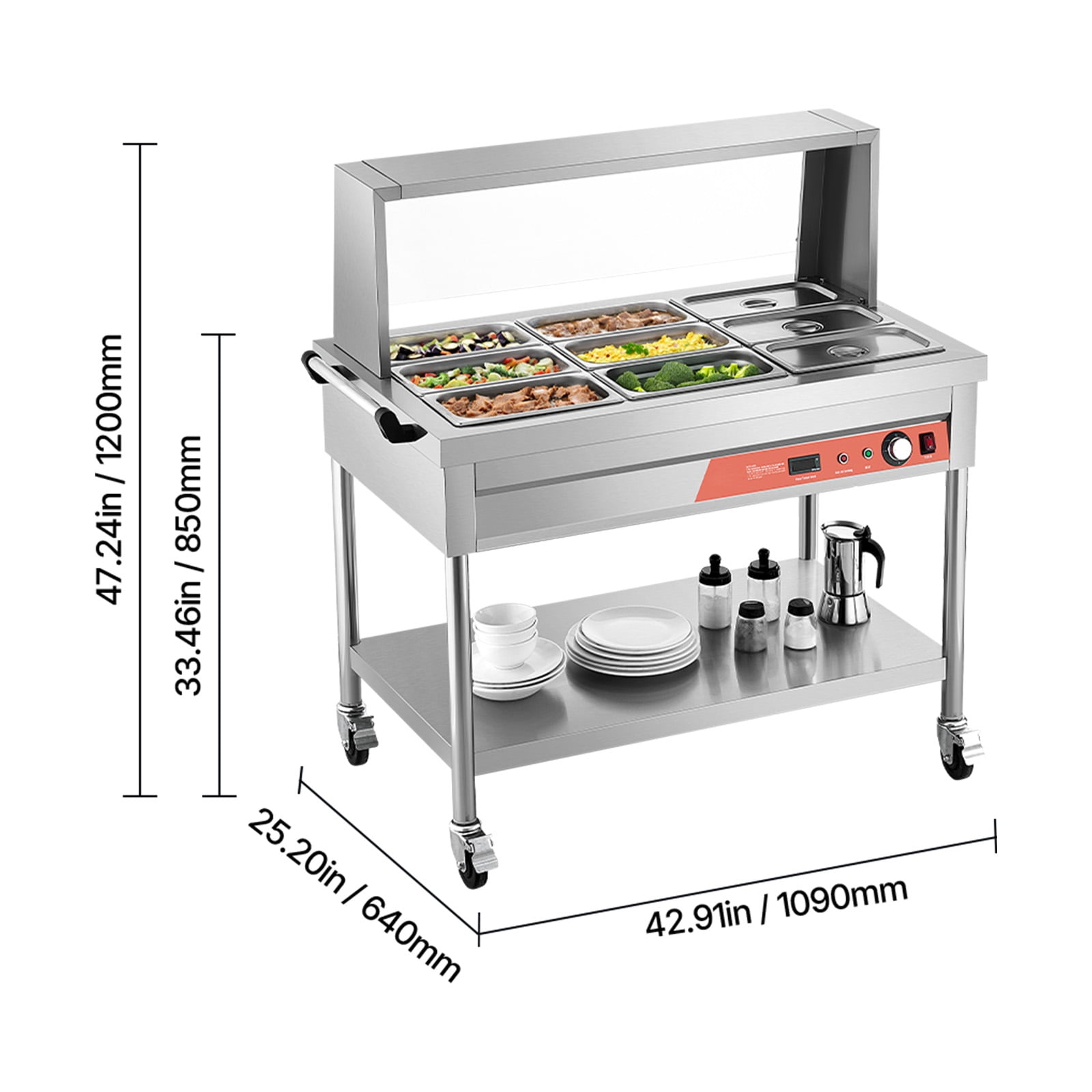 KFFKFF Commercial Food Heating Unit, Electric Steam Table with 9 x 1/3 Pans, 1500W, Professional Catering Food Heater with Protective Shield, Undershelf Wheels, and Stainless Steel Structure