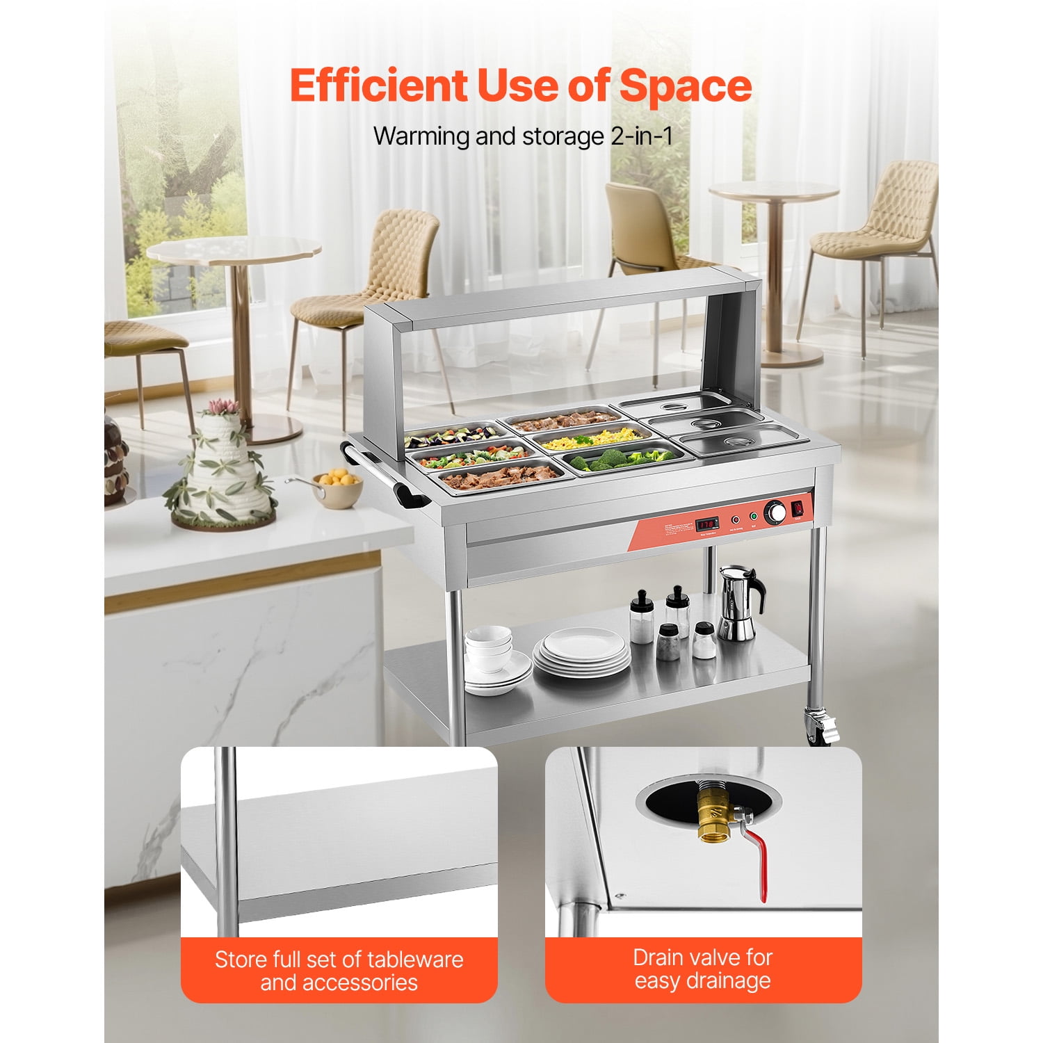 Efficient Heating: The built-in heating plate design ensures fast and even heating, creating better circulation for optimal food temperature. This commercial electric food warmer is perfect for keeping stews, pasta, congee, soup, and more at the ideal temperature. The built-in design makes cleaning the compartment easier and extends the service life. Commercial-Grade Large Capacity: Our steam table is designed to meet various dining needs with its nine 1/3-size pans. The standardized machine dimensions are compatible with all pans up to 5.9 inches in depth. Smart Temperature Control: Easily operate the control knob to set the temperature within the range of 86-190℉/30-85℃. The high-precision temperature display shows the internal temperature in real-time. For safe use, the electric food warmer must be used with water and includes a built-in anti-dry burning protection device. Premium Materials: Crafted entirely from stainless steel, this electric steam table offers corrosion resistance, durability, and easy cleaning. The high-quality, thick, and anti-cut pans can be directly washed in water. The mobile wheels and convenient handle allow for easy transportation, while the bottom drain valve facilitates water drainage. Thoughtful Details: The removable sneeze guard ensures customers can select food with security and reliability. The large undershelf provides ample storage space for extra tableware and utensils. With a 1.8m power cord and main power switch design, it eliminates distance limitations to outlets. This versatile food warmer is widely used in cafeterias, hotels, fast food restaurants, supermarkets, and more.
