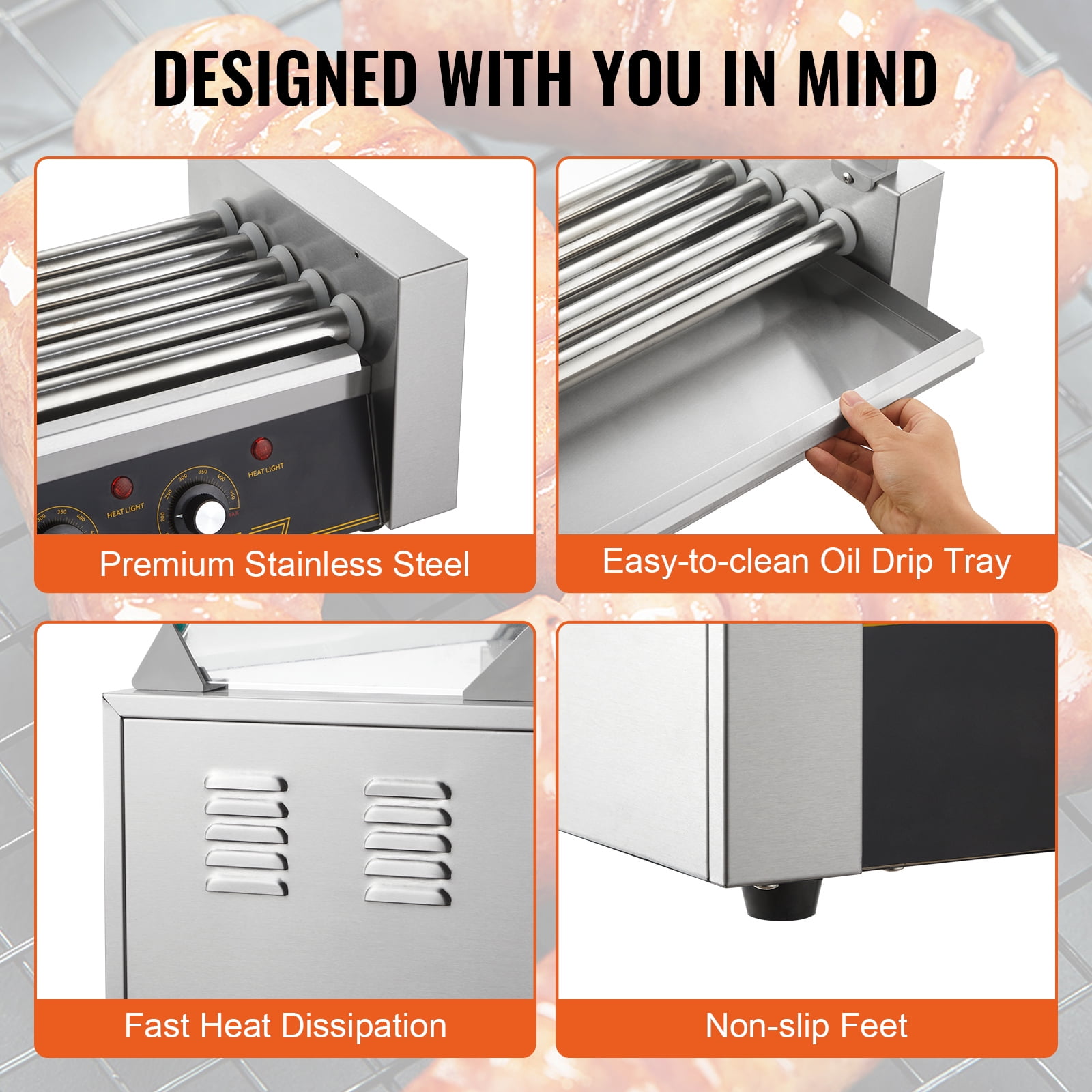 Grill Like a Pro: Cook up to 12 hot dogs at a time with our commercial grade stainless steel hot dog roller. It’s perfect for food stands, family gatherings and barbecues. Dual-Temperature Control: With individual knobs on the front and rear drums, it’s easy to adjust the cooking temperature up to 482° F. Keeps food piping hot and ready to serve. Optional Backsplash & Shelf: Extra backsplashes and shelves speed up cooking time. They are easy to assemble and disassemble to keep food warm and keep out dust. 360-Degree Cooking: The three-point chain design allows the rollers to rotate 360°, ensuring even cooking. The powerful 750W motor cooks hot dogs in just 15 minutes. Easy to Clean: Keep your kitchen clean with the removable drip tray and brushes. Simply wipe down or put them in the dishwasher for hassle-free cleaning.