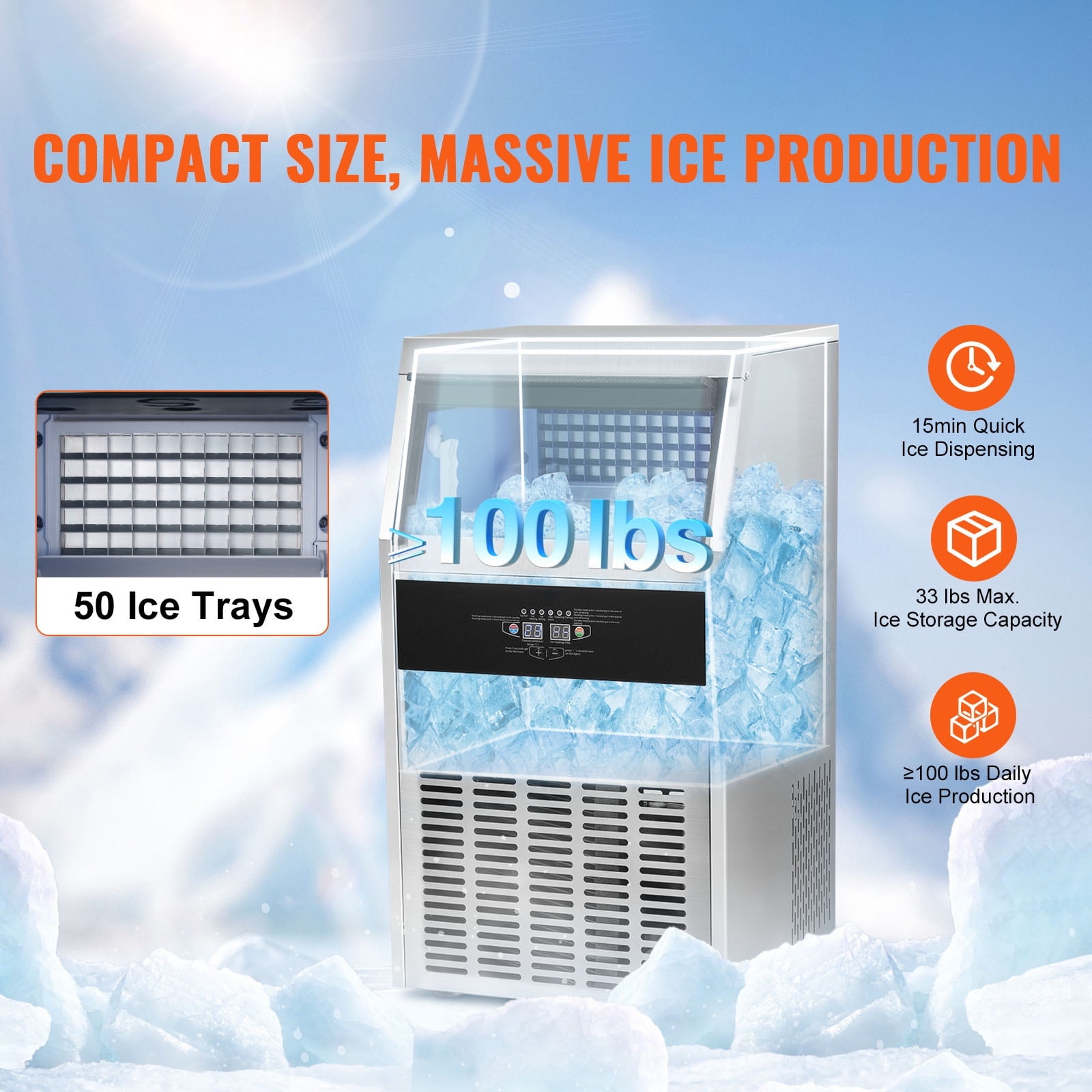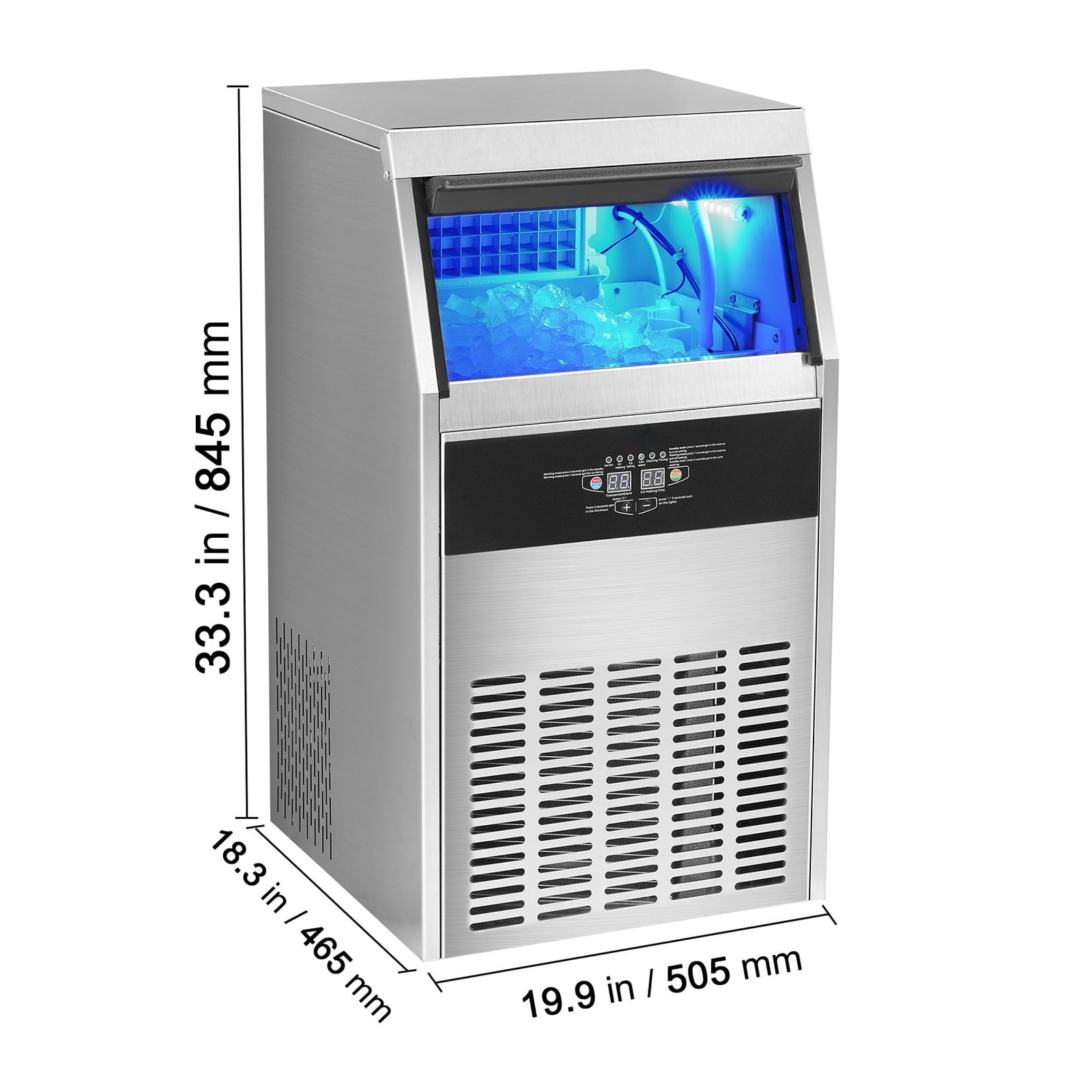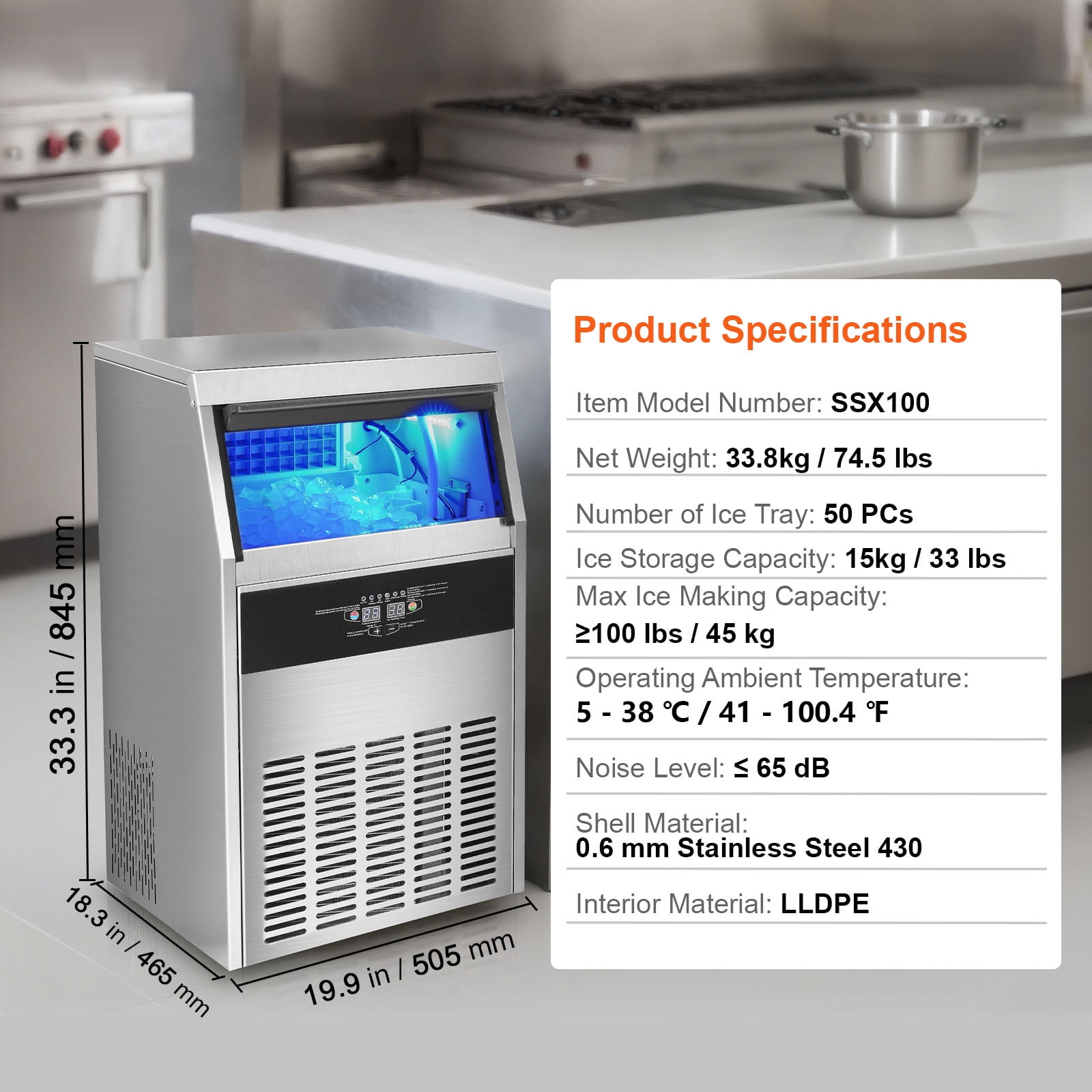 Product Description Light Commercial Ice Maker Our light commercial ice maker produces 100 lbs of ice cubes per day with a maximum ice storage capacity of 33 lbs and can keep your ice insulated for up to 8 hours. Never run out of ice again, and enjoy the convenience of fast ice production with our reliable commercial ice maker! Light Commercial Ice Maker Our light commercial ice maker produces 100 lbs of ice cubes daily. In actual test conditions, ice production capacity is up to 104 lbs/24 h at 21℃/70℉, 10℃/50℉ ambient/water temperature. It has a maximum ice storage capacity of 33 lbs and can keep your ice insulated for up to 8 hours. Rapid Ice Production Our commercial ice maker is equipped with 50 ice cubes, allowing you to adjust the ice thickness by extending or reducing the ice-making time. Thanks to its powerful compressor, this ice maker can produce ice cubes in just 12-15 minutes. Easy to Clean Our commercial ice maker machine comes with a convenient one-touch self-cleaning function, ensuring that your ice maker stays clean. Additionally, it includes a filter for the inlet water pipe, effectively filtering the water debris and providing clean water for ice production. One-Piece Construction Our ice maker features an integrated structure that makes installation a breeze. It effectively isolates external heat with a thickened cyclopentane insulation material and a stainless steel exterior casing. Even when it is not in operation, your ice cubes can remain frozen for 6-8 hours. Your Go-To Choice Our commercial ice maker operates with minimal noise, providing you with a comfortable environment. It’s suitable for home use, small restaurants, bars, coffee shops, and beverage stores, making every sip and every moment more enjoyable. User-Friendly Design With its one-piece structure, installation is a breeze, ensuring a hassle-free setup. It is equipped with a DC fan, which ensures rapid cooling, making it a user-friendly and efficient choice for all your cooling needs. Specifications Item Model Number: SSX100 Net Weight: 74.5 lbs / 33.8 kg Number of Ice Tray: 50 PCs Ice Storage Capacity: 33 lbs / 15 kg Max Ice Making Capacity: ≥100 lbs / 45 kg Operating Ambient Temperature: 41 to 100.4 ℉/5 to 38 ℃ Noise Level: ≤65 dB Shell Material: 0.6 mm Stainless Steel 430 Interior Material: LLDPE Product Dimensions: 19.9 x 18.3 x 33.3 in / 505 x 465 x 845 mm Package Content 1 x Commercial Ice Maker 1 x Water Filter 2 x Ice Maker Water Inlet Pipe 1 x Ice Maker Drainage Pipe 1 x Ice Scoop(Plastic PP) 1 x Plastic Connector 1 x Use Manual