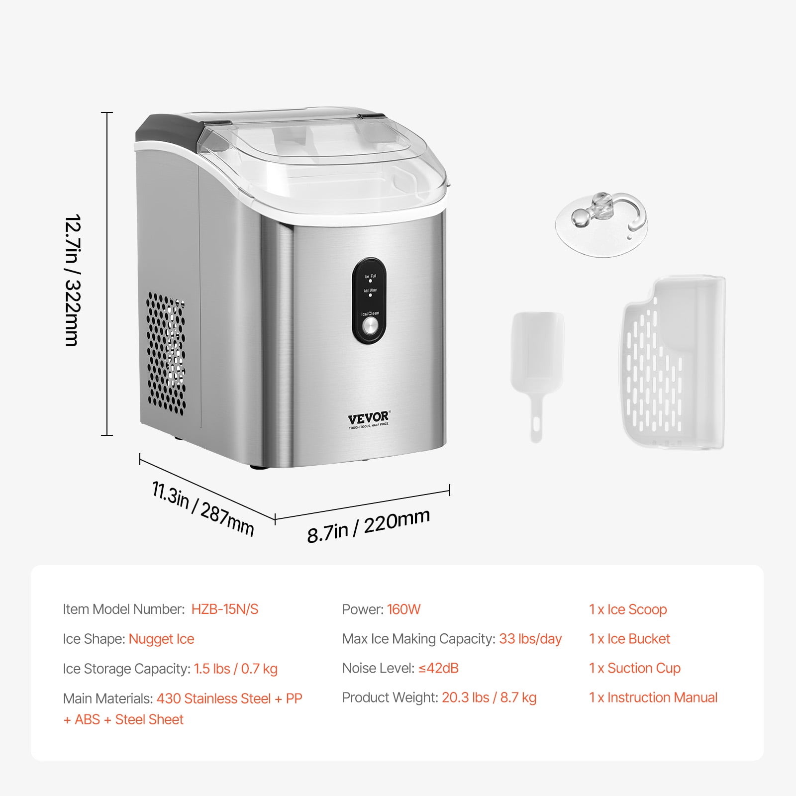 Product Description KFFKFF Countertop Ice Maker With a capacity to produce 33 lbs of nugget ice per day, this KFFKFF countertop ice maker is a convenient addition to any kitchen. The 1.5 lbs / 0.7kg ice capacity ensures that you always have enough ice on hand. The nugget ice produced by this ice maker is not only crispy but also chewable, providing long-lasting insulation for your drinks. Say goodbye to waiting for ice to freeze in the freezer, as this ice maker is always ready to provide clean ice whenever you need it. Enjoy the pleasure of chewable ice and cold drinks anytime with this KFFKFF countertop ice maker. KFFKFF Countertop Ice Maker Introducing the KFFKFF Countertop Ice Maker, a reliable and efficient ice-making solution. With a capacity to produce 33 lbs of nugget ice per 24 hours, this ice maker ensures a steady supply of crispy and chewable ice. Its 1.5 lbs / 0.7kg ice capacity guarantees long-lasting insulation, keeping your drinks cold for longer periods. Enjoy the convenience of clean and chewable ice whenever you desire. Versatile and Practical The KFFKFF Countertop Ice Maker is not just an ordinary ice maker. It is a versatile appliance that can cater to various needs. Whether you want ice for cold drinks, smoothies, or food preservation, this portable ice maker has got you covered. In emergency situations, it can even be used for first aid purposes, making it a truly multi-functional device. User-Friendly Operation Experience hassle-free ice making with the KFFKFF Countertop Ice Maker. Equipped with simple button controls and clear indicator lights, this ice machine is incredibly easy to operate. No complicated procedures or confusing settings. Just a straightforward and user-friendly design that allows you to enjoy ice-making without any hassle. Innovative Visual Design Say goodbye to constantly opening the lid to check the ice level. The KFFKFF Countertop Ice Maker features an innovative visual design that lets you monitor the ice-making process directly. This means you can keep an eye on the progress without interrupting the machine’s operation. Enjoy the convenience of a transparent and efficient ice-making experience. Portable and Convenient Take the KFFKFF Countertop Ice Maker with you wherever you go. Its portable and lightweight design makes it the perfect companion for parties, outdoor activities, offices, restaurants, and kitchens. Enjoy the luxury of having ice readily available wherever you need it, without any hassle or inconvenience. Versatile Applications The KFFKFF Countertop Ice Maker is a versatile appliance suitable for a wide range of applications. Whether you need ice for drinks, chilling food, or even first aid purposes, this portable ice maker has got you covered. It is perfect for use in restaurants, offices, parties, and outdoor settings. Experience the convenience and versatility of this exceptional ice-making solution. Specifications Item Model Number: HZB-15N/S Power: 160W Ice Shape: Nugget Ice Max Ice Making Capacity: 33 lbs/day Ice Storage Capacity: 1.5 lbs / 0.7 kg Noise Level: ≤42dB Main Materials: 430 Stainless Steel + PP + ABS + Steel Sheet Product Weight: 20.3 lbs / 9.2 kg Product Size: 8.7 x 11.3 x 12.7 inches / 220 x 287 x 322 mm Package Content 1 x Countertop Ice Maker 1 x Ice Scoop 1 x Ice Bucket 1 x Suction Cup 1 x Instruction Manual