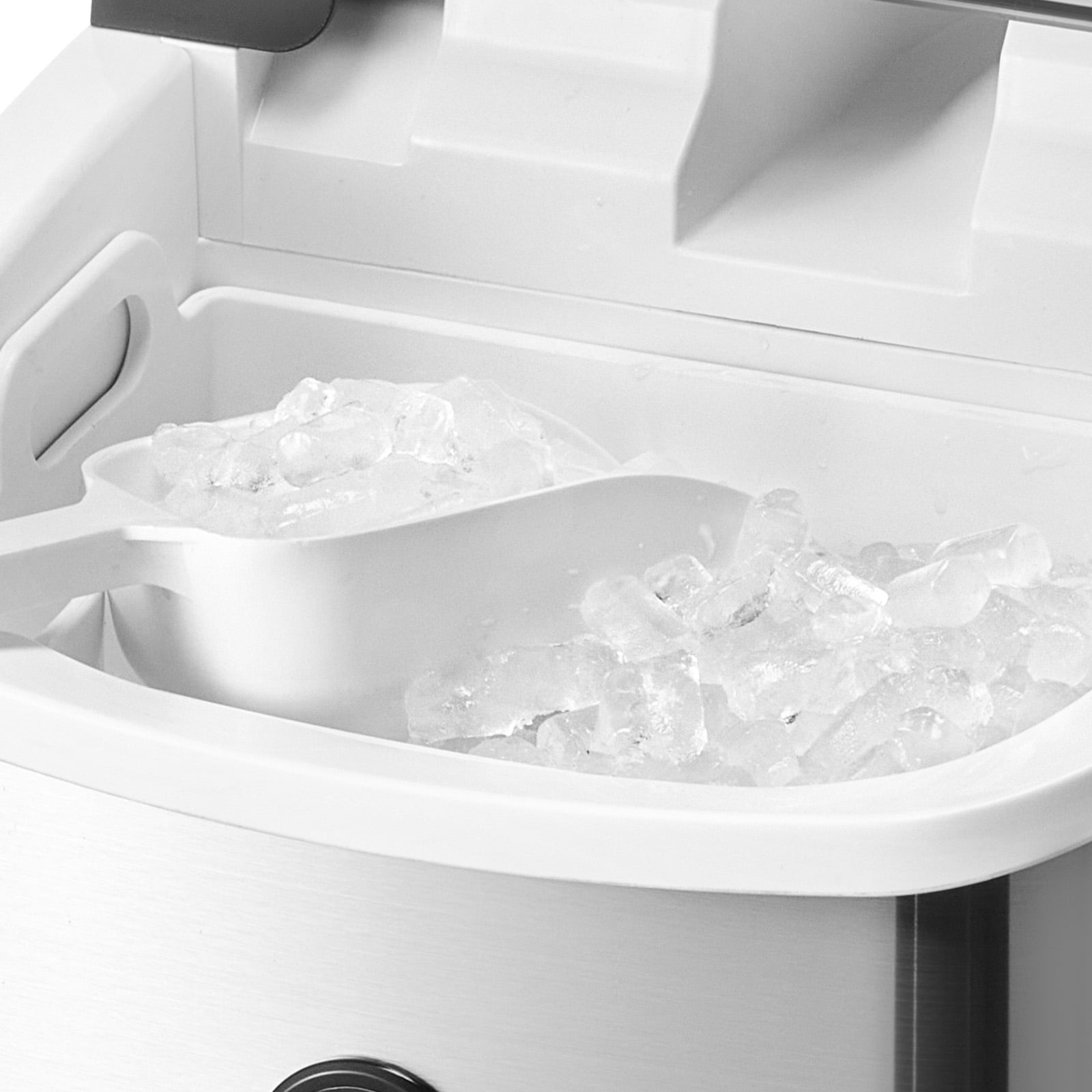 KFFKFF Ice Maker: This countertop ice maker has a water tank capacity of 1.1L / 1.16 QT and can produce up to 33 pounds of ice within 24 hours. Unique Nugget Ice: Our ice cubes are made from crushed ice cut with blades, resulting in brittle, chewable nuggets that preserve the original flavor of your drinks. Durable Stainless Steel Body: The KFFKFF ice maker features a stainless steel body that is not only durable but also easy to clean, ensuring long-lasting performance. Convenient Transparent Lid: With the transparent lid, you can easily monitor the ice-making process at any time, ensuring you never run out of ice. Easy Operation & Self-Cleaning: The control panel of this ice maker is designed for easy operation. Simply fill it with water, press the ice-making button, and let it do the rest. It also has a 30-minute self-cleaning mode for hassle-free maintenance.