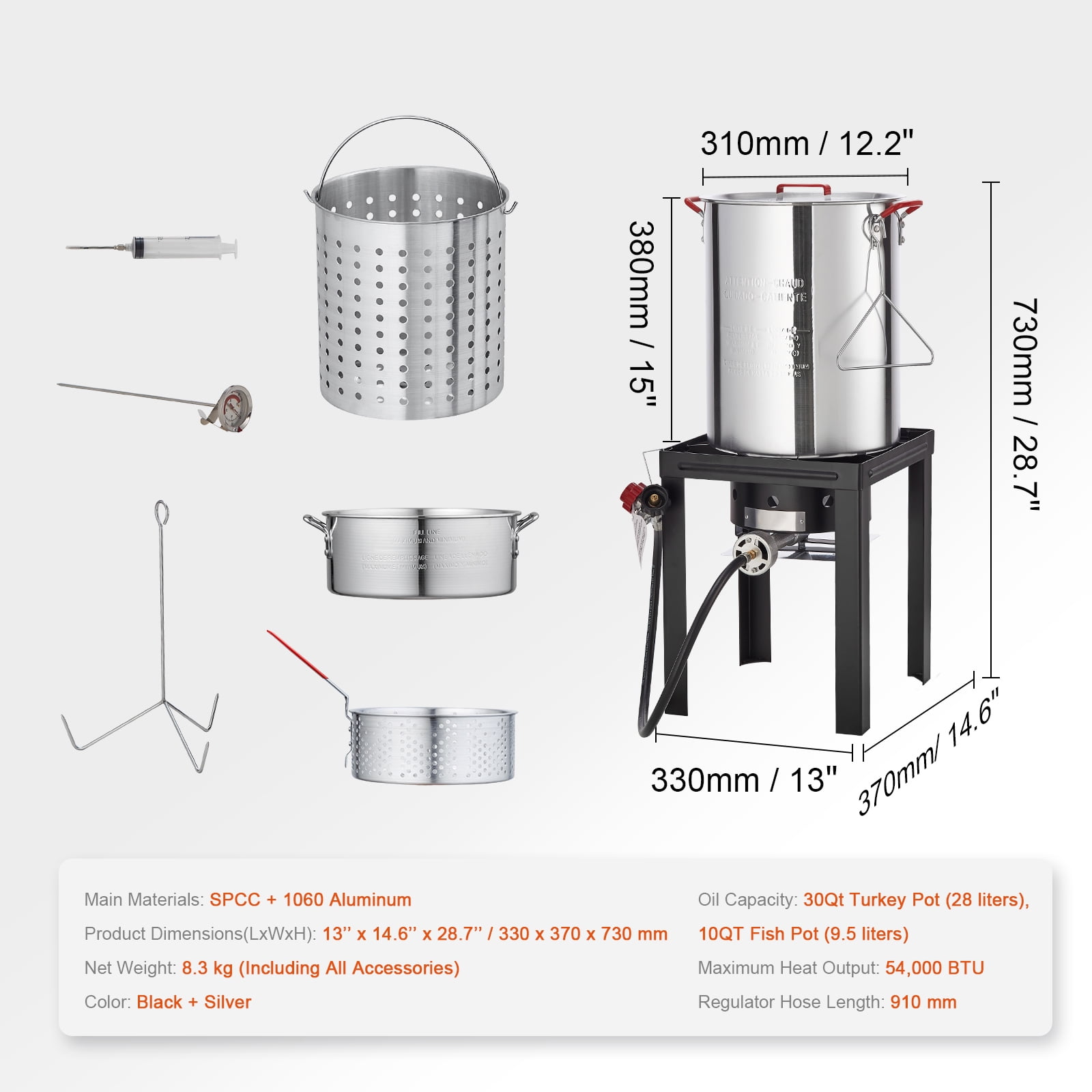 Product Description Versatile Outdoor Cooking Kit Introducing the all-in-one Turkey Deep Fryer Kit, a game-changer for your outdoor cooking adventures. This innovative kit is designed to solve all your cooking troubles with its multifunctional capabilities. Whether you’re frying, steaming, or boiling with water, this kit has got you covered. From frying a delicious Thanksgiving turkey to whipping up everyday meals like crispy fried fish, cooking seafood in the spring and summer, or grilling mouthwatering steaks on your backyard gas stove, this kit offers endless possibilities. It’s the perfect companion for all your outdoor cooking needs, bringing you a variety of family moments filled with flavor and joy. Versatile and Convenient 2-in-1 Multifunctional Pot Introducing the KFFKFF 2-in-1 Multifunctional Pot, designed to offer a combination of functions that make cooking a breeze. This highly cost-effective pot is perfect for all your culinary needs. With a 30-quart capacity, it can be used for frying or steaming turkey and seafood using the basket. Remove the basket and you have a pot ideal for making soup, stew, and mixed rice. Additionally, the 10 Qt. fish fryer allows you to fry fish, chicken wings, fries, and small items with ease. Complete Accessories and Reliable Material We understand the importance of having all the necessary accessories for a seamless cooking experience. That’s why the KFFKFF 2-in-1 Multifunctional Pot comes with a set of abundant accessories that solve all your cooking problems. Most of the parts have CSA certification, ensuring their quality and safety. The pot also features a thickened stand that provides a secure base and prevents tipping. Rest assured, the materials used in this pot are sturdy and safe, making it a reliable choice for your kitchen. Enhanced User-Friendly Design We have taken extra steps to make your cooking experience even better with the KFFKFF 2-in-1 Multifunctional Pot. The packaging and accessories have been upgraded to provide a more user-friendly product experience. The packaging is now strengthened to prevent any denting during transportation. With a maximum output of 54,000 BTU, this pot offers full firepower for quick and effortless cooking. We have also added warning stickers to prevent dry burning and plastic handles to enhance grip and improve heat resistance. Unleash Deliciousness with Creative Combinations Get ready to unleash the magic of deliciousness with the KFFKFF 2-in-1 Multifunctional Pot. This pot allows for creative assemblies that will take your flavors to the next level. Use the 10-quart fryer to turn fresh fish fillets into crispy golden pieces, or opt for the 30-quart fryer to fry a turkey to juicy perfection. The possibilities are endless, and your taste buds will thank you. Experience Culinary Delights with Ease With the KFFKFF 2-in-1 Multifunctional Pot, you can easily inject different flavored marinades to enhance the taste of your ingredients. The included probe thermometer helps you control the optimal oil temperature, ensuring that your dishes turn out delicious every time. Say goodbye to guesswork and hello to culinary delights. The Ultimate Companion for Outdoor Cooking Make your outdoor cooking experiences unforgettable with the KFFKFF 2-in-1 Multifunctional Pot. Whether it’s a barbecue, family party, or Thanksgiving event, this pot is an essential tool. Experience the joy of deep-frying like a professional and effortlessly create delicious dishes that will impress your guests. Get ready to elevate your outdoor cooking game with this perfect companion. Specifications Item Model Number: FCKIT-14 Main Materials: SPCC + 1060 Aluminum Color: Black + Silver Product Dimensions: 13×14.6×28.7 inch/ 330x370x730 mm Net Weight: 18.3 lbs / 8.3 kg Maximum Heat Output: 54,000 BTU Regulator Hose Length: 35.8 inch / 910 mm Package Content 1 x Turkey Deep Fryer 1 x Set of Accessories
