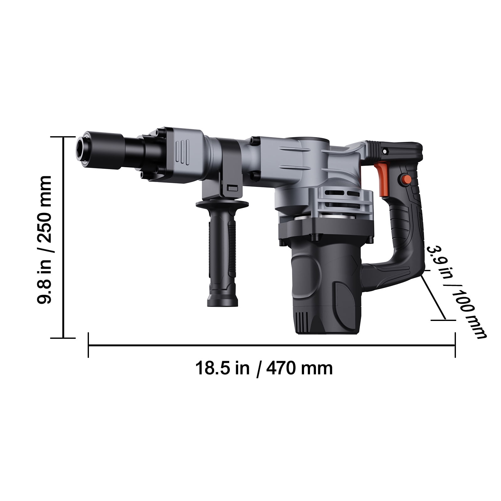 Superior Performance & Top Quality: The KFFKFF demolition hammer features a powerful 1400W industrial motor with 19J impact energy, allowing for quick and precise completion of concrete and metalworking projects. It is designed for both professionals and home users. The high-strength alloy chuck is highly durable and corrosion-resistant, ensuring long-term use. Shock Absorbing Handle: Our KFFKFF demolition hammer is equipped with an upgraded shock absorption structure that includes additional springs, providing enhanced effort-saving capabilities. The larger trigger switch offers a more comfortable control experience. The spring design is highly resistant to breakage, reducing the risk of hand injuries and ensuring maximum safety. Designed To Go Above And Beyond: We understand that continuous work can be exhausting. That’s why we have designed our KFFKFF demolition hammer with optimal comfort in mind. The 360° rotary handle helps reduce fatigue during prolonged work and allows for greater accuracy and precision in narrow spaces. Additionally, the demolition hammer comes with a convenient carrying suitcase. Stays Cool During Intense Work: Our KFFKFF demolition hammer features an efficient cooling system that effectively cools the motor, extending its lifespan. Even after a hard day of work, the engine remains at low temperatures, ensuring reliable performance. Wide Range of Applications: The KFFKFF demolition hammer operates on 110V power and includes two chisel bits (flat chisel and point chisel). It is perfect for various tasks such as demolition, trenching, chipping, and breaking holes in concrete, block, brick, and tile. It is also ideal for applications like pipeline work, mechanical installation, drainage facilities construction, interior decoration, and more!