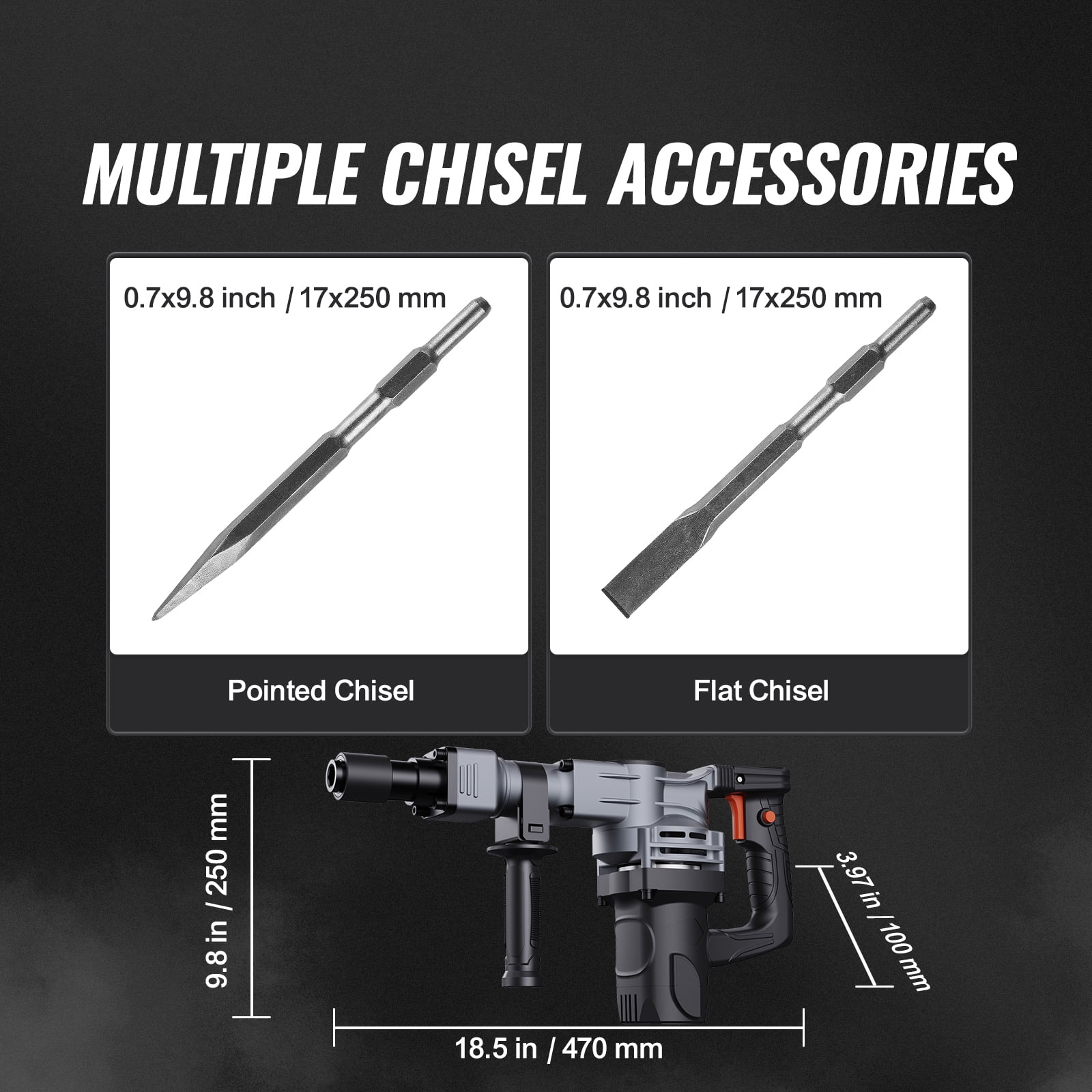 Superior Performance & Top Quality: A 1400W industrial motor with 19J impact energy is designed to complete concrete and metalworking projects quickly and precisely. It is intended for professionals and home users. This high-strength alloy chuck is highly durable, and is corrosion resistance for long-term use. Shock Absorbing Handle: The upgraded shock absorption structure, adding more springs, can save more effort. The bigger trigger switch provides you a more comfortable control experience. The spring design is not easy to break, avoiding hand injuries, and obtaining more safety. Designed To Go Above And Beyond: Continuously working can be tiring. That is why we provide you with optimal comfort! The 360??rotary handle reduces fatigue during prolonged work. It provides accuracy and precision in some relatively narrow places. The demolition hammer is also equipped with a suitcase for carrying conveniently. Stays Cool During Intense Work: The efficient cooling system effectively cools the motor to improve the concrete breaker’s life span. The engine will be at low temperatures even after a hard day at work! Wide Range of Applications: The 110V power demolition drills & hammers include 2 chisel bits (flat chisel and point chisel). It is perfect for demolition, trenching, chipping, and breaking holes in concrete, block, brick, and tile. It is also ideal for various applications such as pipeline, mechanical installation, drainage facilities construction, interior decoration, and much more!