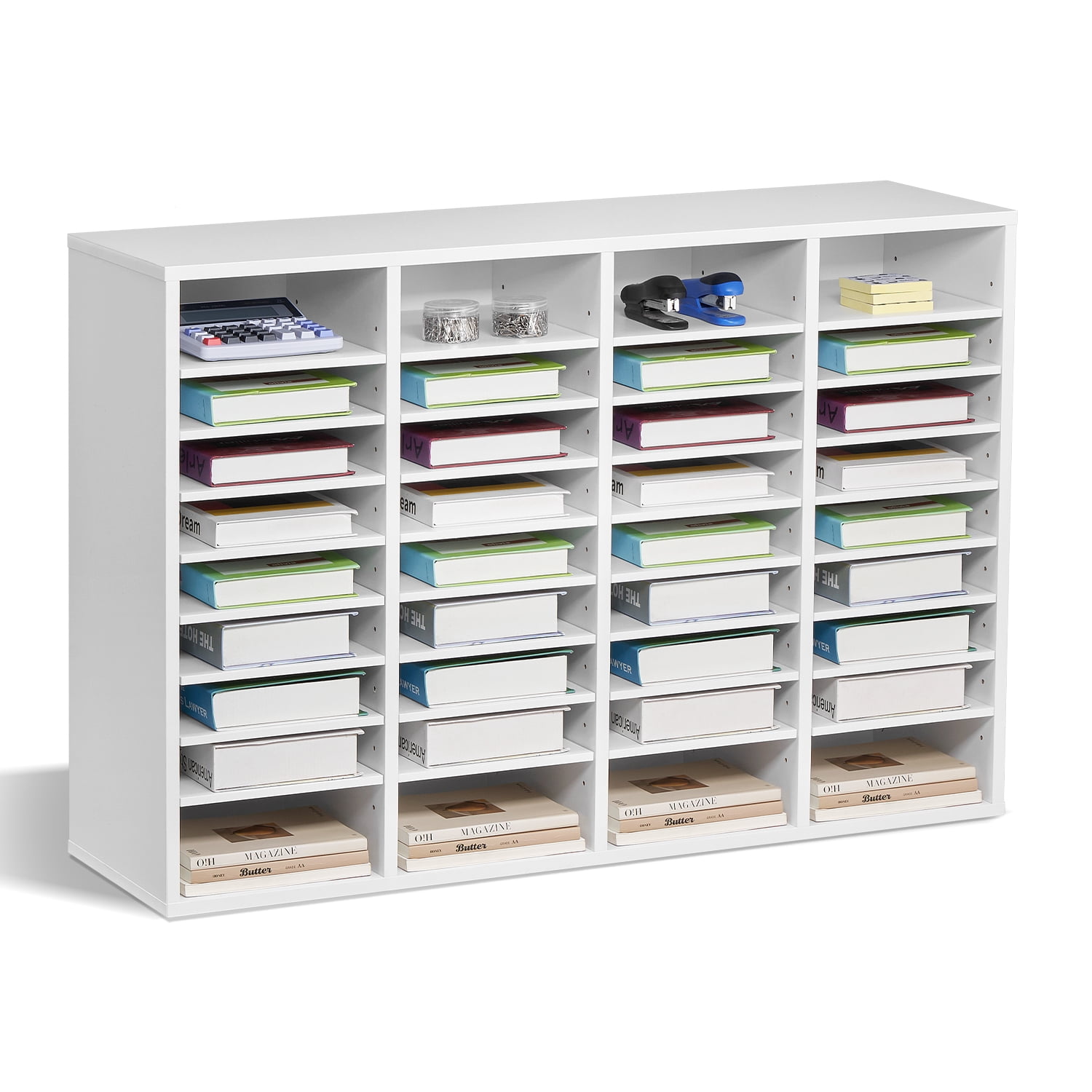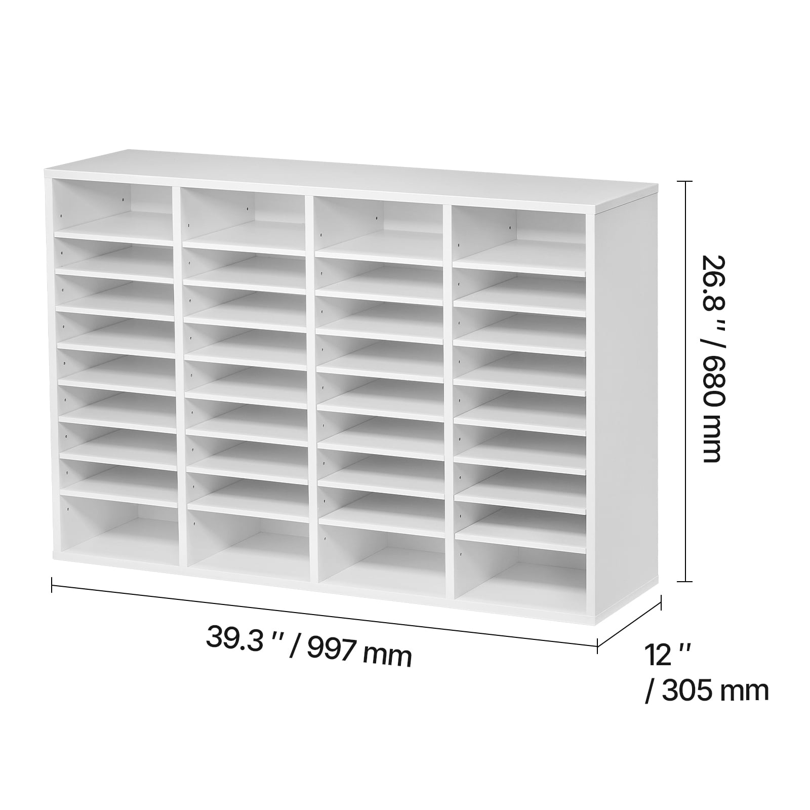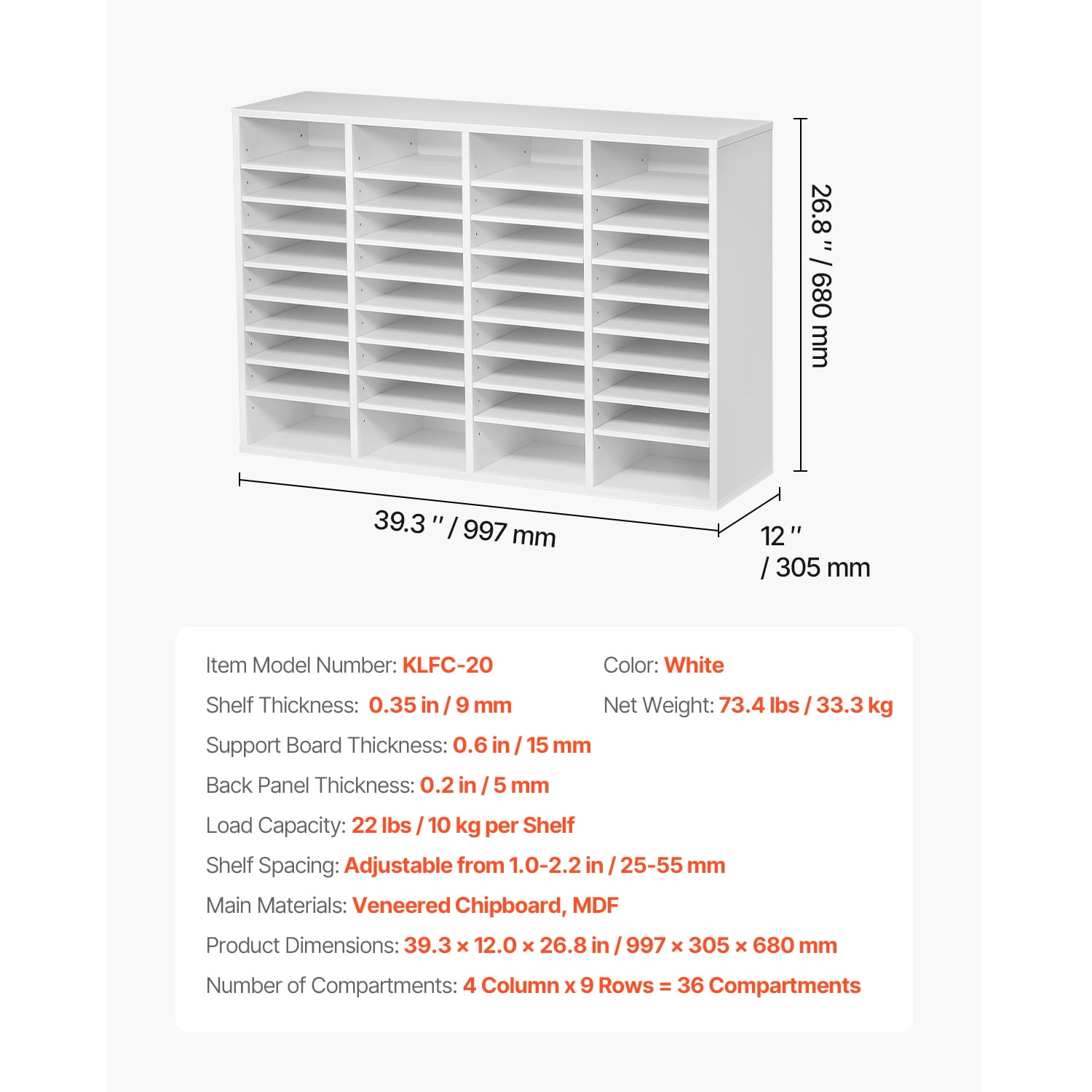 Product Description 36-Compartment Literature Organizer Tired of dealing with a cluttered workspace? Look no further! The literature organizer boasts an impressive 36 compartments, with each layer capable of supporting up to 22 lbs / 10 kg. Whether you’re drowning in paperwork at the office, struggling to keep track of students’ assignments in the classroom, or tired of tripping over scattered books, magazines, and toys at home, this organizer is here to save the day. It effortlessly streamlines your storage needs, transforming your space into a neat and orderly haven in no time at all! 36-Compartment Literature Organizer Declutter your desk with our KFFKFF literature organizer! With 36 spacious compartments arranged in a 4-column and 9-row configuration, you’ll have ample space to neatly store books, documents, magazines, and more. The included labels make it easy to access your files quickly. Robust Build Crafted from durable P2 particle board & MDF, our KFFKFF literature organizer ensures safety for you and your family. It is EPA certified and features a smooth, polished surface that is waterproof, scratch-resistant, and effortless to clean, making it ideal for busy workplaces. Ample Capacity Each shelf of our office mailbox can hold up to 22 lbs / 10 kg and accommodate 500 sheets of A4 paper. Whether you need to store heavy files or everyday office supplies, this organizer has got you covered. Flexible Storage Solutions Customize the layout of your KFFKFF file sorter by adjusting or removing shelves to accommodate larger files or office supplies. This flexibility allows you to effortlessly organize and store items of various sizes. Versatile Functionality Our office mail organizer is perfect for storing files in the office, organizing student assignments in the classroom, or keeping books, magazines, and toys tidy at home. It caters to all your storage needs. Enhanced Security Ensure a tidy and secure workspace with the KFFKFF wood file organizer’s three-sided protective baffles. These baffles prevent your documents and other items from falling out while you work. Additionally, you can utilize the top surface to place decorations, cups, and more, enhancing the organization and comfort of your office. Specifications Item Model Number: KLFC-20 Load Capacity: 22 lbs / 10 kg per Shelf Color: White Number of Compartments: 4 Columns x 9 Rows = 36 Compartments Support Board Thickness: 0.6 in / 15 mm Shelf Thickness: 0.35 in / 9 mm Back Panel Thickness: 0.2 in / 5 mm Shelf Spacing: Adjustable from 1.0-2.2 in / 25-55 mm Main Materials: Veneered Chipboard, MDF Product Dimensions: 39.3 x 12.0 x 26.8 in / 997 x 305 x 680 mm Net Weight: 73.4 lbs / 33.3 kg Package Content 1 x Literature Organizer