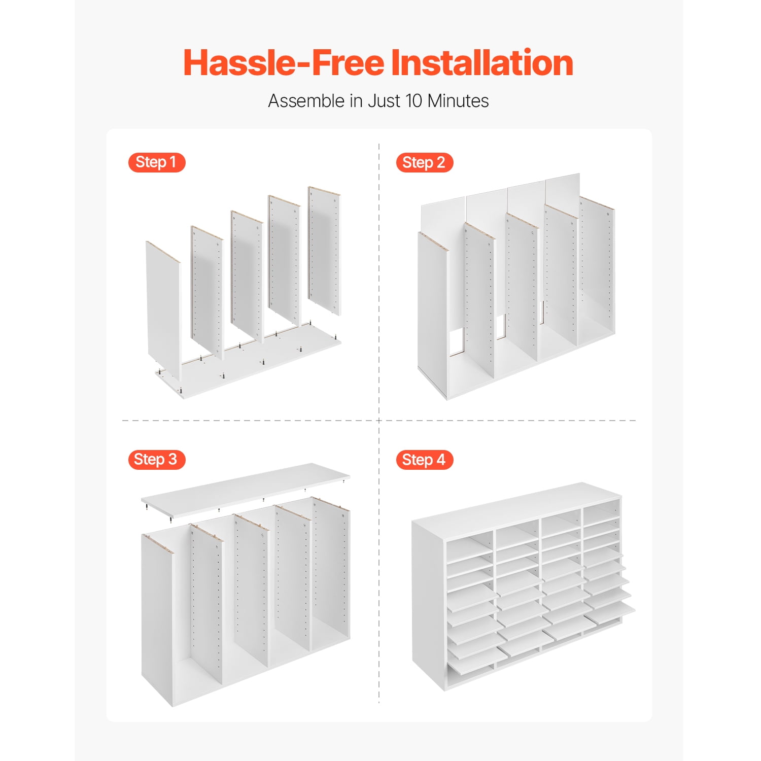 Introducing the KFFKFF literature organizer—a must-have for a clutter-free workspace! With 36 spacious compartments arranged in a 4 column and 9 row design, you’ll have ample room to store books, documents, magazines, and more. Crafted from durable P2 particle board and MDF, our wood literature organizer is built to last. Each shelf can hold up to 22 lbs / 10 kg, making it perfect for heavy files or everyday items. It’s also EPA certified for added security. The smooth, polished surface is waterproof, scratch-resistant, and easy to clean. Customize the storage space to suit your needs! Each compartment measures 9.2 x 11.1 x 2.2 inches / 234 x 282 x 56 mm and can hold up to 500 sheets of A4 paper. The adjustable shelf heights (ranging from 1.0-2.2 inches / 2.5-5.5 cm) allow you to easily modify or remove shelves to accommodate larger files or office supplies. No hassle, no fuss! The KFFKFF wood file sorter features a straightforward panel design and clear instructions, making assembly a breeze. In just 10 minutes, you can have your space organized and ready to go. Adaptable to various settings, the KFFKFF office mail organizer is perfect for the office, classroom, or home use. Keep your files sorted at work, organize student assignments in the classroom, or tidy up books, magazines, and toys at home. It’s a versatile addition to any space!