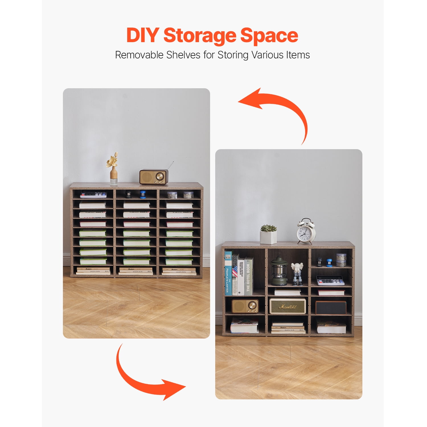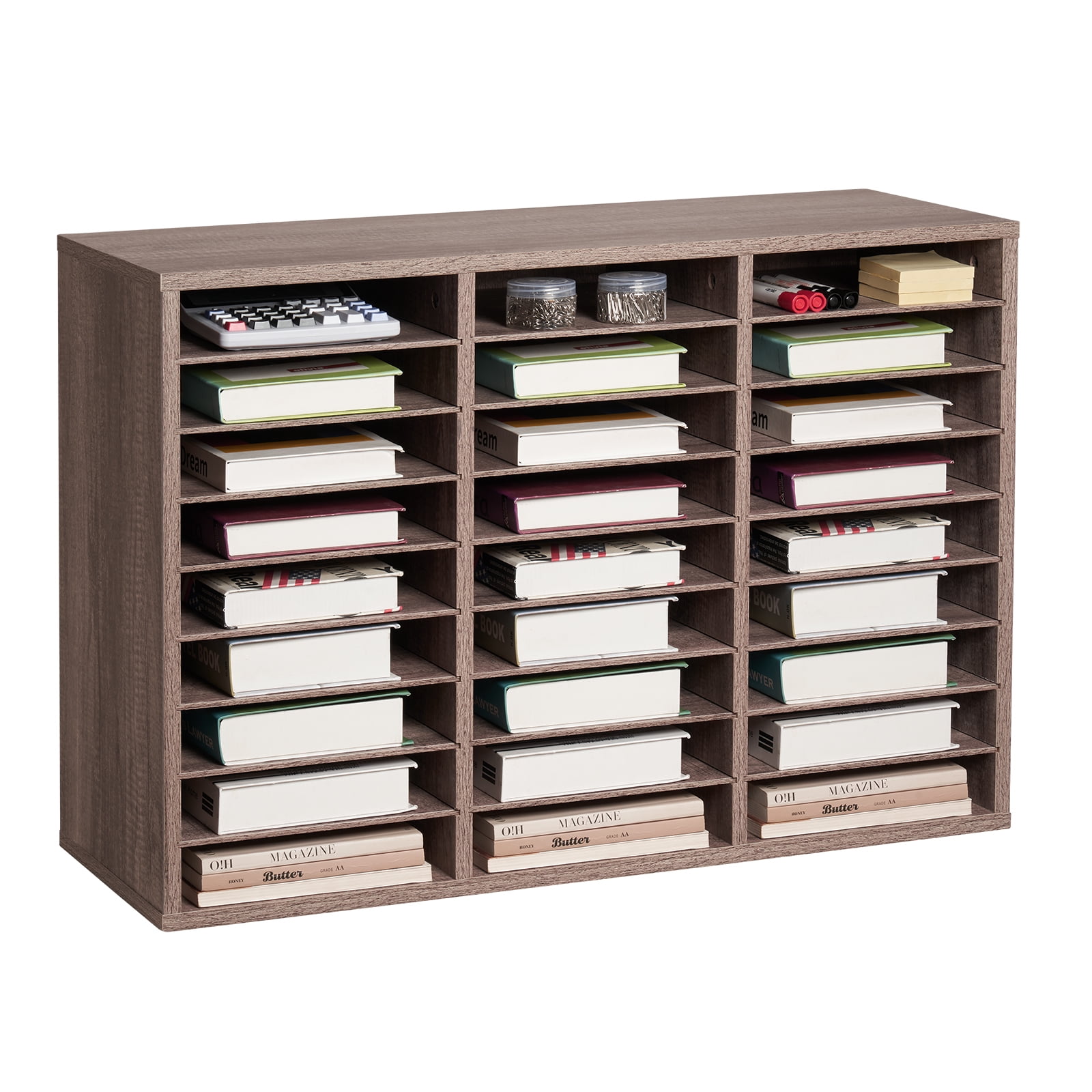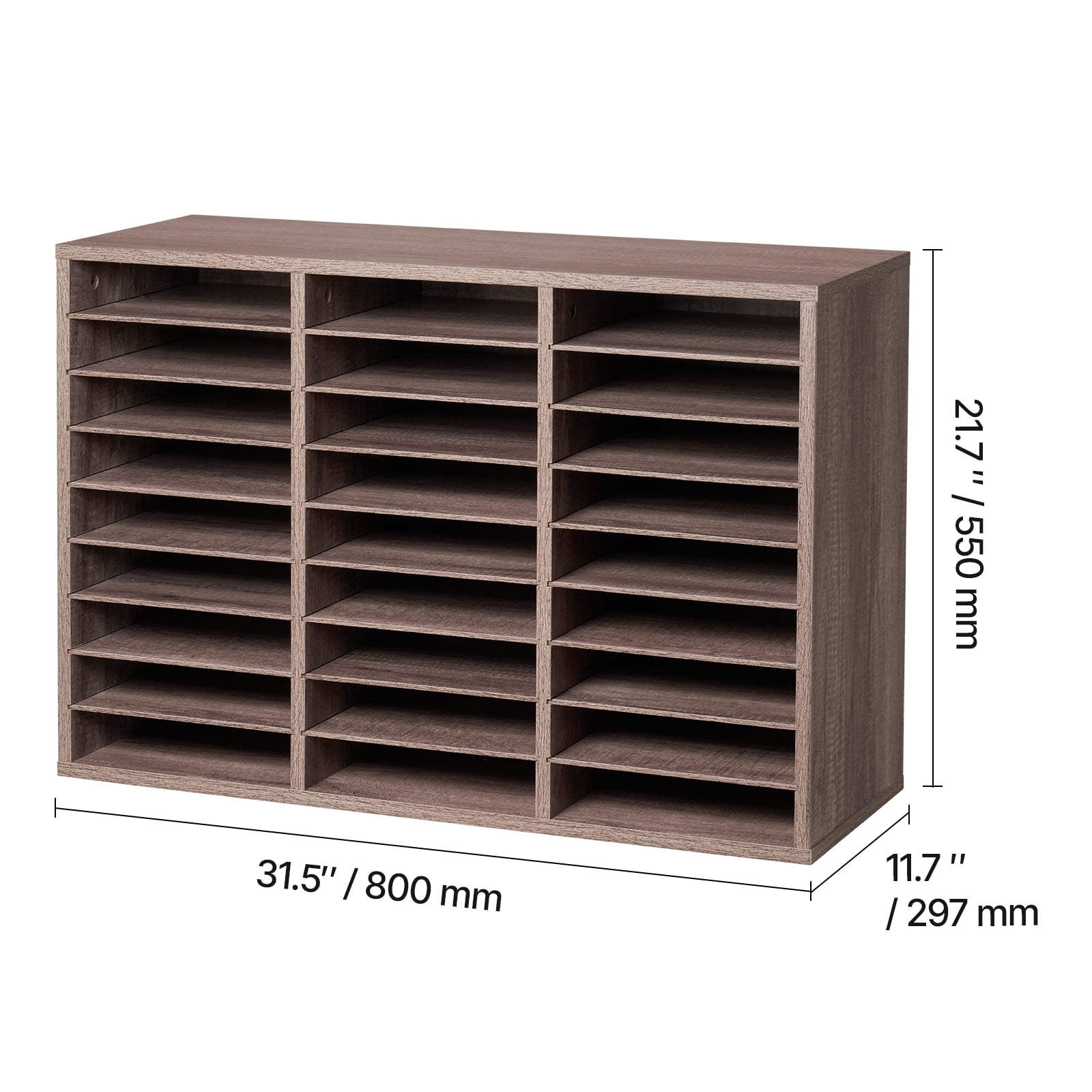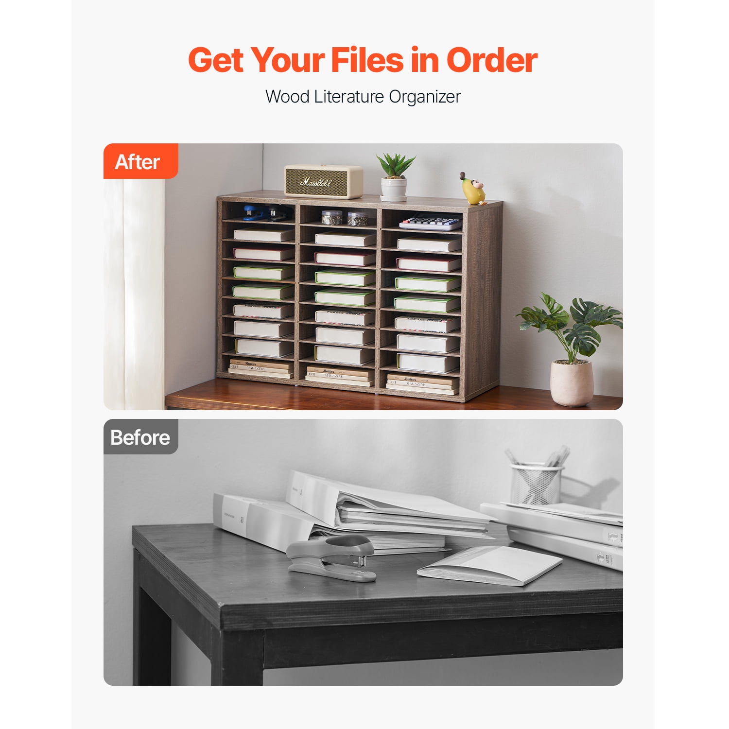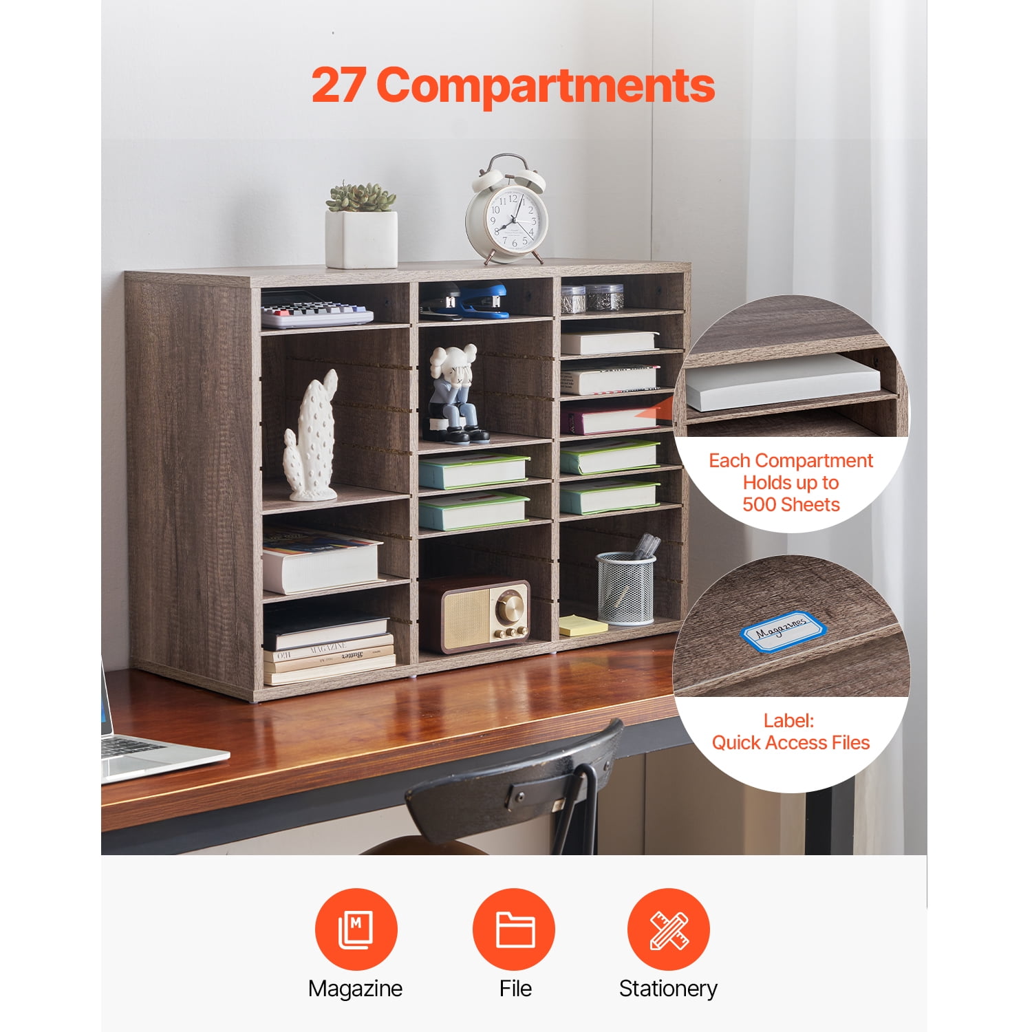27-Compartment Large Capacity: Keep your desk organized with our literature organizer. With 27 spacious compartments arranged in 3 columns and 9 rows, you’ll have ample space to store books, documents, magazines, and more. The included labels ensure easy file retrieval without wasting time. Sturdy Structure: Our wood literature organizer is built to handle all your storage needs. Crafted from durable P2 particle board, each shelf can support heavy items, ensuring long-lasting use. It’s EPA certified for your peace of mind. The smooth, polished surface is waterproof, scratch-resistant, and easy to clean. Flexible Storage: Customize your storage with our office mailbox. Each compartment measures 10.0 x 11.0 x 2.1 inches / 254 x 279 x 533 mm and can hold up to 500 sheets of A4 paper. Need more space for larger files or office supplies? Simply remove the shelves to accommodate your requirements. Quick Assembly: Get organized in no time with our wood file sorter. Its simple panel design and clear instructions allow for easy assembly in just 10 minutes. No hassle, no fuss—just a tidy and efficient workspace. Versatile Uses: Our wood file sorter is suitable for various settings, including offices, classrooms, and homes. Use it to store files at work, organize student assignments in the classroom, or keep books, magazines, and toys neatly arranged at home. It’s a versatile solution for any space!