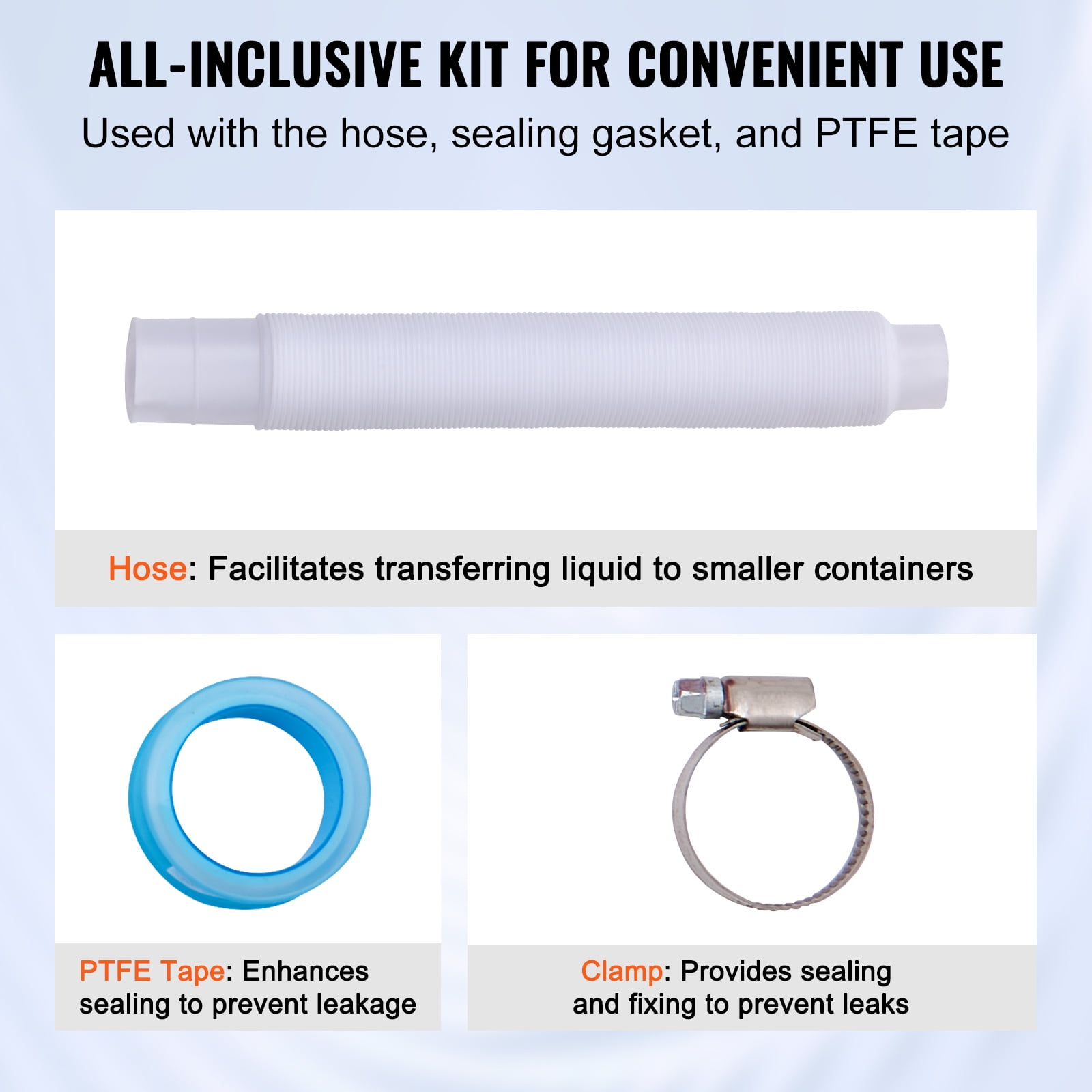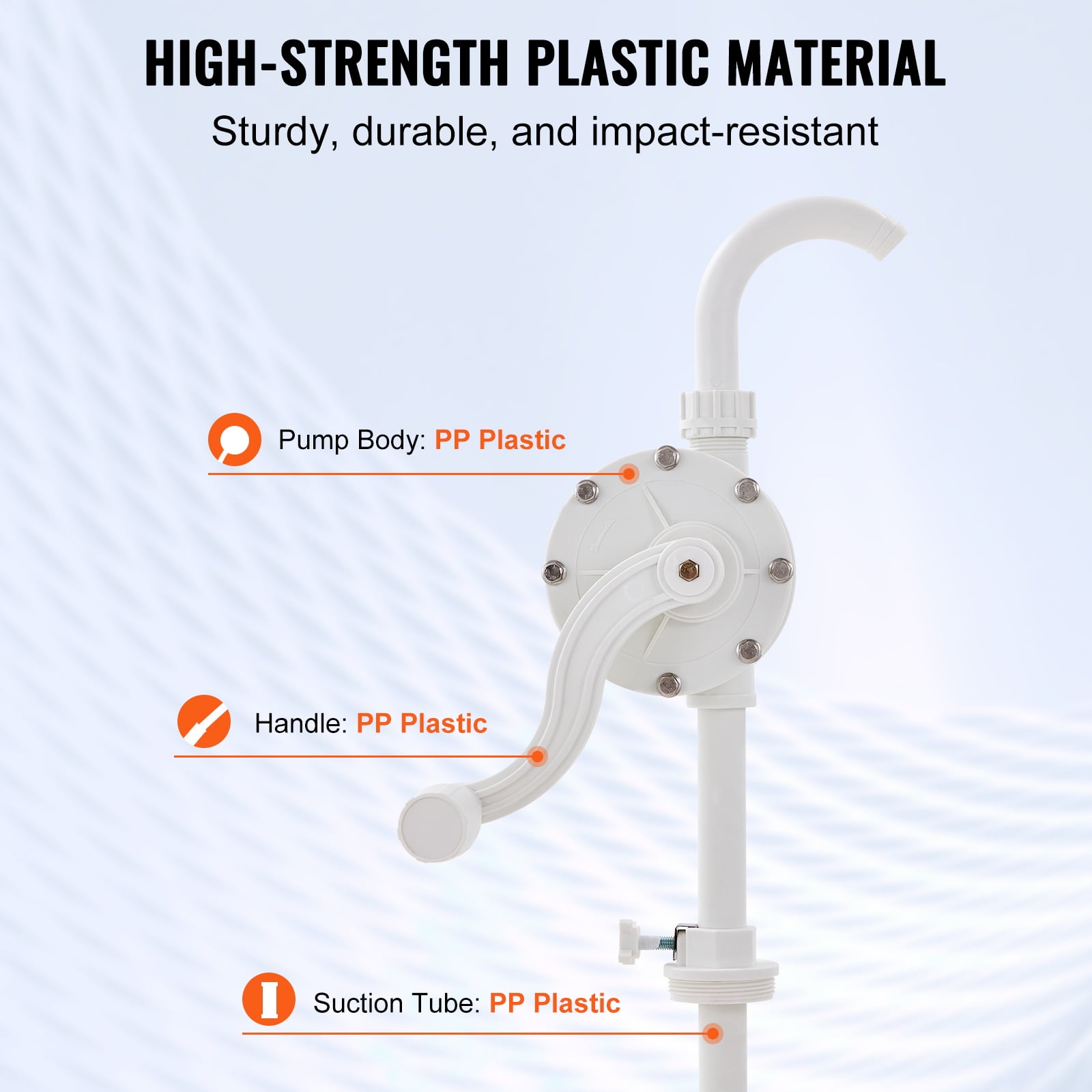 Supercharge Your Extraction: Pump with gusto! Our drum pump delivers 6.5 gallons per minute, ensuring your liquids – be it water, alcohol, antifreeze, DEF, or corrosive liquids – zip right out. Just remember, our pump prefers not to mingle with diesel, kerosene, engine oil, or gasoline. Simplicity at Its Best: Toss aside those operation manuals! Our barrel pump features an ergonomic handle that fits comfortably in your hand, ensuring a non-slip grip. With a rotary hand crank, you’ll have those liquids transferred before you know it. Fits Like a Glove: Fear not about sizes! This hand pump sports a 2″ NPT universal threading and a 3-section suction tube (outer diameter: 1″/25 mm, total length: 40.2″/1020 mm). Whether your drum’s 5 gallons or a whopping 55, we’ve got you covered. Durability You Can Trust: This isn’t just a pump; it’s an investment. Crafted from high-strength PP plastic, this 55 gallon barrel pump laughs in the face of wear and impact. Get ready for a long and prosperous pumping journey. An Ensemble of Extras: No more surprise trips to the hardware store. Our pail pump comes with a hose, hose clamp, and PTFE tape, ensuring an airtight seal to prevent any pesky leaks. All you need for a smooth and seamless liquid transfer experience.