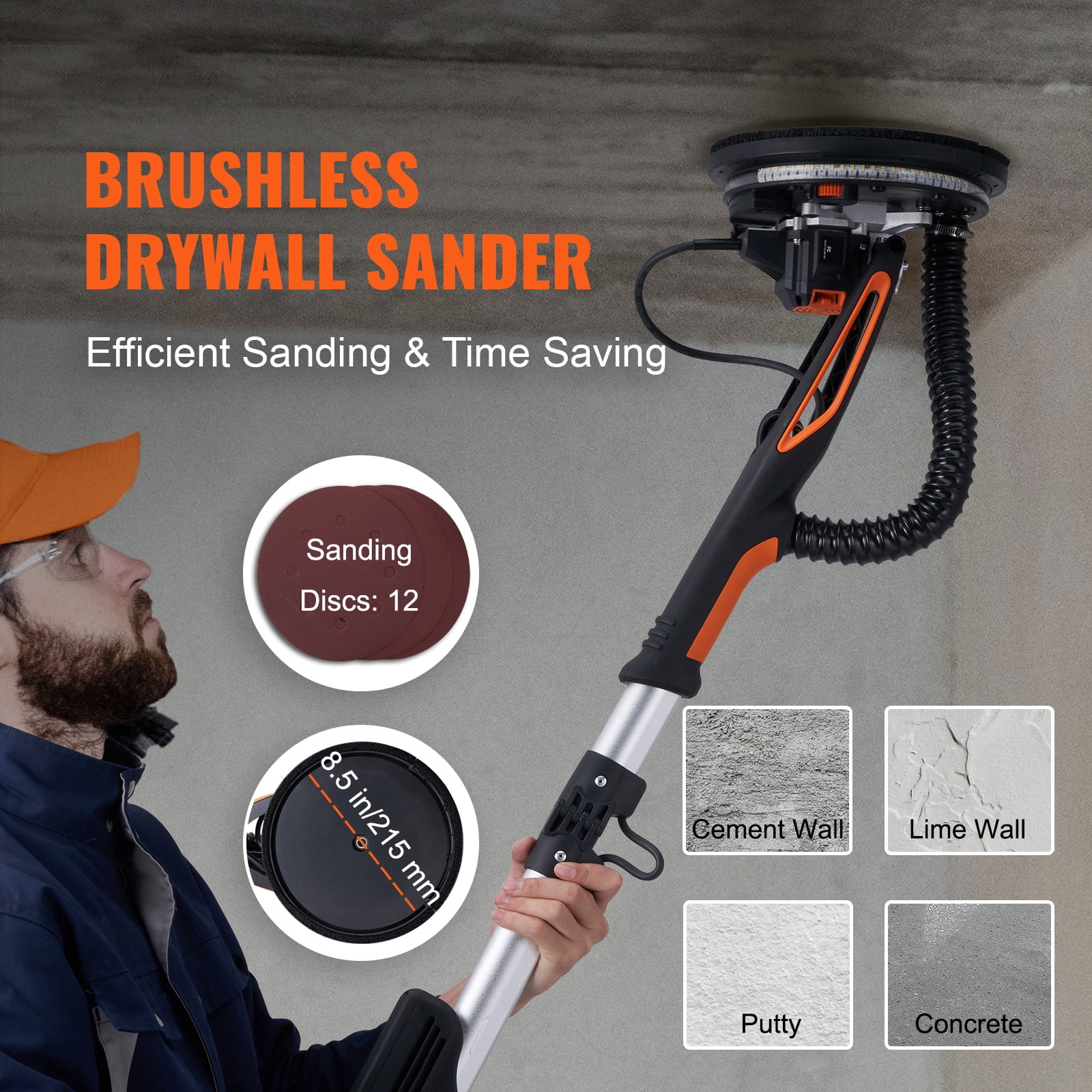 Product Description 800W Brushless Drywall Sander The 800W brushless motor greatly improves the grinding and dust collection efficiency. The body is light, weighing only 3.1KG, with a golden weight ratio, and the head-to-tail weight ratio is 3:7, effectively reducing labor intensity. Very suitable for home improvement, professional decoration, construction activities. 800W Brushless Motor The grinding effect is increased by 25%, while the dust collection effect is increased by 50%. LED Light Switch The fully enclosed widened LED strip provides a full 360-degree lighting cover, making the work area completely bright. Telescopic Lock Knob The telescopic rod can not only adjust the length according to the height, but also can be freely folded for easy storage. 3:7 Head-to-tail Weight Ratio Achieve a golden weight ratio, enhance weight distribution, and minimize physical exertion. Large Size Millstone The large 215mm grinding disc supports efficient grinding, and the 360-degree surround brush prevents dust from flying. Fixed Angle Design The best working Angle can be found by swinging the equipment at a large Angle. Specifications Voltage: 120V/60Hz Rated Power: 800W Motor Type: Brushless Motor Speed Adjustment: 1000-2300RPM Sanding Head: PC+Sponge Head Diameter: 8.5 in/215 mm Cord Length: 13.1 ft/4 m Product Size: 47.6x10x5.3 in/1210x255x135 mm Product Weight: 6.8 lbs/3.1 kg Package Content 1 x S5 Hex Wrench 1 x Dust Collection Hose 12 x Sandpaper 1 x Instruction Manual 1 x 35 Connector 1 x 35/37 Adapter Assembly 1 x Extension Rod