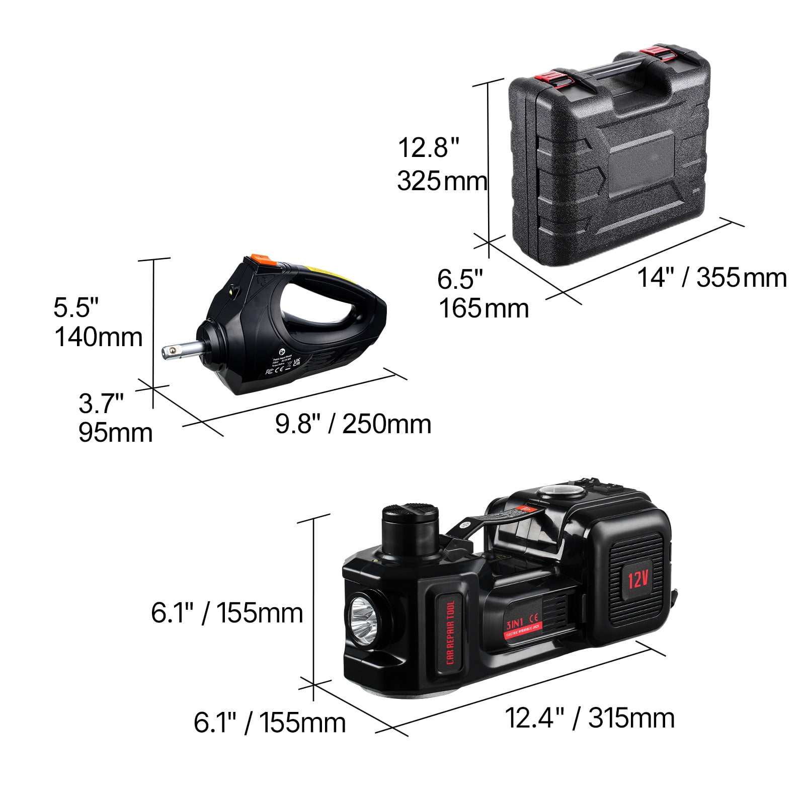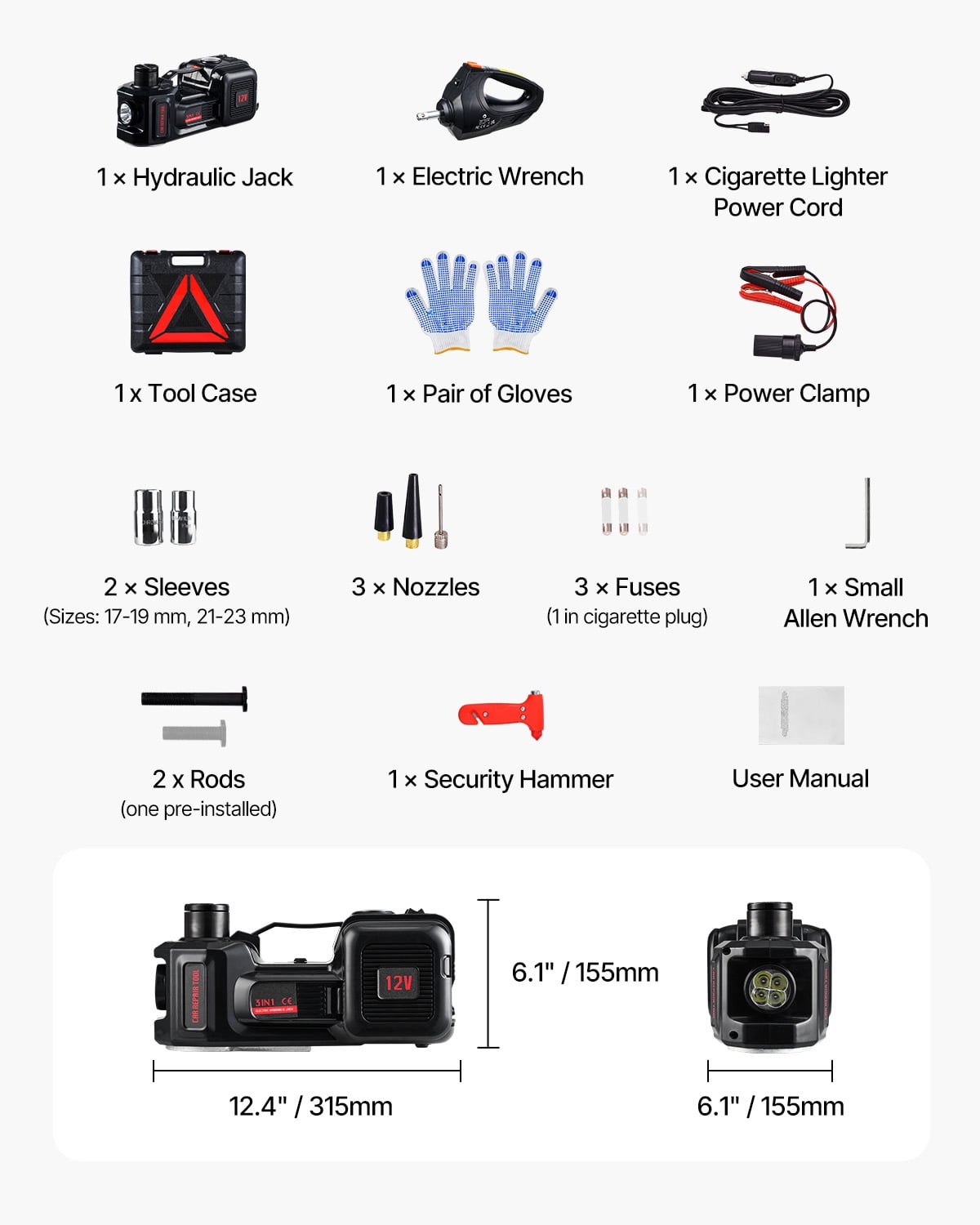 Product Description 3-in-1 Tire Change Assistant When you find yourself with a flat tire while on the road, our electric car jack kit provides unparalleled assistance. With its inflation device, this jack utilizes a top-notch hydraulic structure and a robust motor to effortlessly lift your vehicle in just 2 minutes, while swiftly removing tire bolts in a matter of seconds. Adjustable to Various Heights Experience the convenience of our KFFKFF electric car jack kit, which can be easily controlled via remote to lift your vehicle to the desired height. This versatile jack is suitable for vehicles with different chassis, making it a must-have for any car owner. Give our electric car jack a try today! Please note: Avoid working under the car after it has been lifted for safety reasons. Versatile and Reliable Designed to cater to your diverse needs, our KFFKFF electric car jack kit is perfect for lifting cars, SUVs, trucks, and more. Its hydraulic structure ensures smooth and efficient lifting, allowing you to reach full height in just 2 minutes. Whether you’re facing an emergency or performing routine maintenance, this jack will save you valuable time and effort. Enhanced Visibility Equipped with powerful LED lights, our KFFKFF electric car jack kit ensures optimal visibility even in low light conditions. Say goodbye to struggling in the dark! These lights not only help you locate the correct lifting points but also serve as emergency lights during nighttime tire repairs. Stay prepared and confident with our electric car jack. Secure and Stable Our KFFKFF electric jack features a cross-groove design on the top head, providing a secure grip and preventing slipping during lifting. You can trust its stability, making your car lifting experience safer and worry-free. Say goodbye to accidents and enjoy peace of mind with our reliable electric car jack. Effortless Remote Control Experience the convenience of our KFFKFF electric car jack kit, complete with an easy-to-use remote control. Adjust the lifting height effortlessly for tire changes or repairs. Whether you’re a professional or a DIY enthusiast, this remote control feature enhances convenience and ensures smooth and efficient operation every time. Durable and Leak-Proof Crafted with seamless steel tubes and a robust, leak-proof structure, our KFFKFF electric car jack kit guarantees long-lasting durability and reliable performance. Its aluminum alloy base plate provides exceptional support, allowing it to handle heavy loads with ease. Invest in our electric car jack and enjoy years of dependable service. Specifications Item Model Number: ZSY01-3 Net Weight: 20.9 lbs / 9.5 kg(including all accessories) Input Voltage: DC 12V Max Input Power: 180W Product Dimensions Tool Case: 14.0 x 6.5 x 12.8 in / 355 x 165 x 325 mm Jack: 12.4 x 6.1 x 6.1 in / 315 x 155 x 155 mm Wrench: 9.8 x 3.7 x 5.5 in / 250 x 95 x 140 mm Package Content 1 x Hydraulic Jack 1 x Electric Wrench 1 x Cigarette Lighter Power Cord 1 x Pair of Gloves 3 x Fuses (1 in cigarette plug, 2 in jack side compartment) 1 x Power Clamp 2 x Sleeves (Sizes: 17-19 mm, 21-23 mm) 3 x Nozzles 1 x Small Allen Wrench 1 x Security Hammer 1 x Tool Case 2 x Rods (one pre-installed, one extension rod) 1 x User Manual