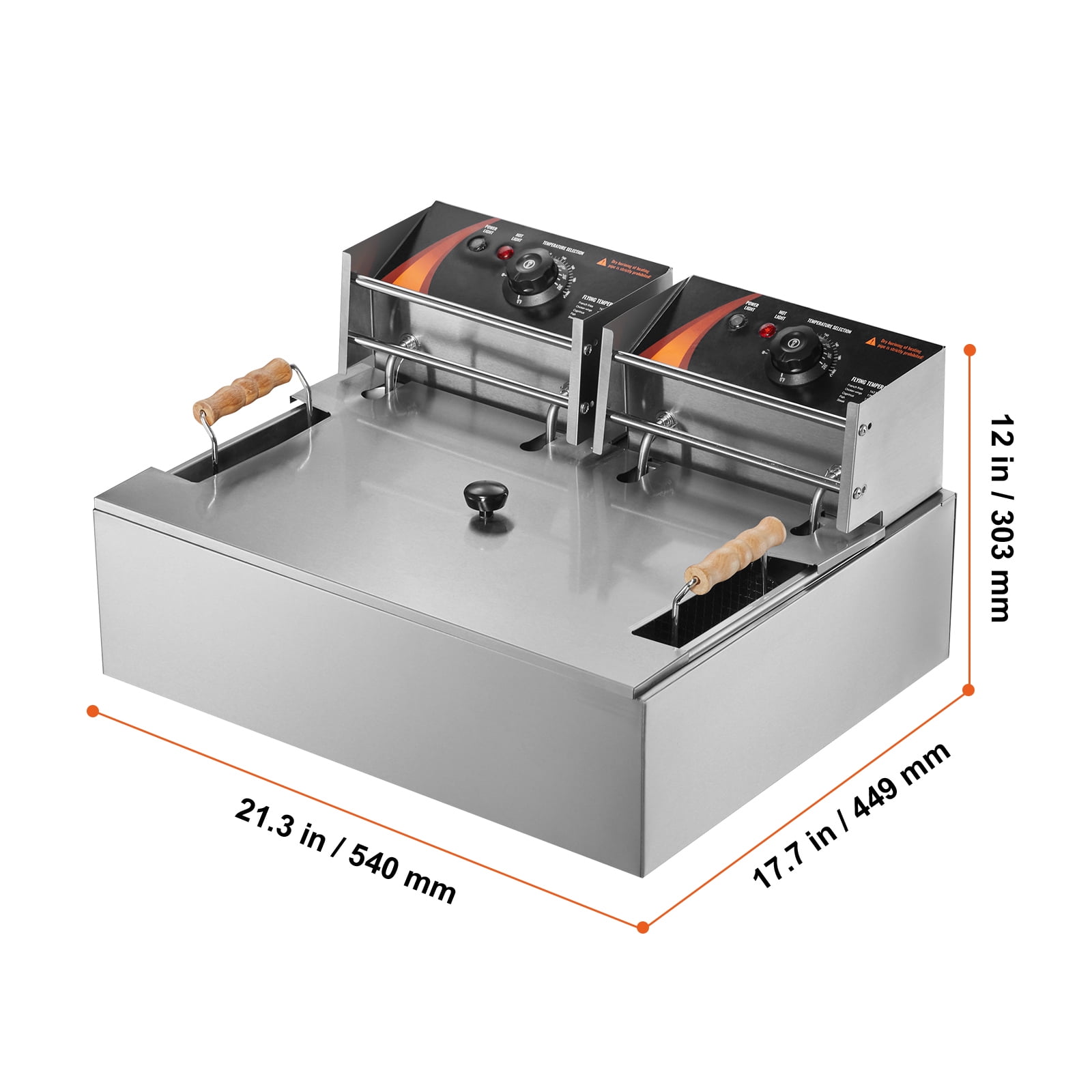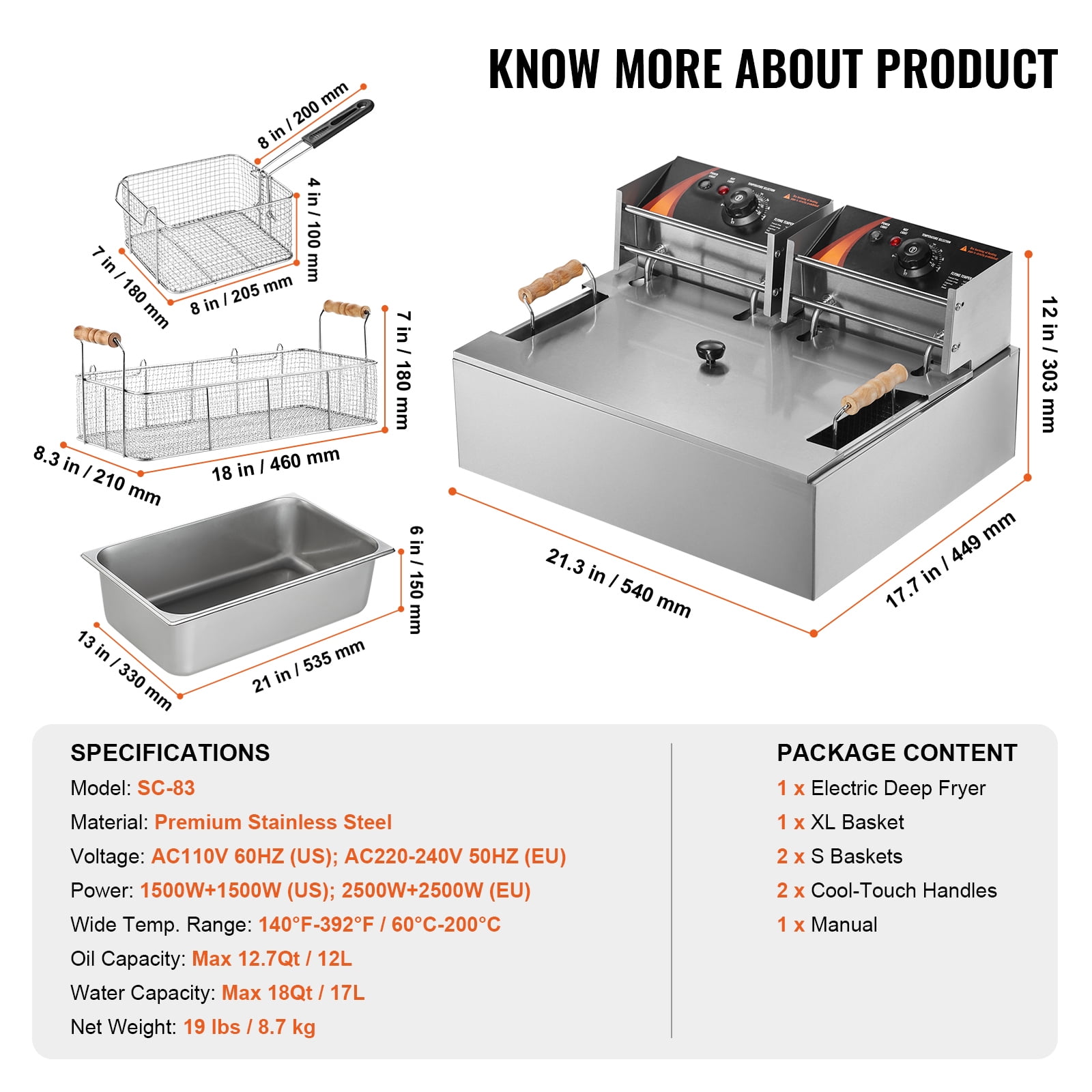 Product Description KFFKFF Commercial Deep Fryer Looking to elevate your culinary skills? Look no further! The KFFKFF commercial electric deep fryer is expertly crafted to enhance productivity, making it the perfect addition to your small business. Whether you own a snack bar, concession stand, or any other food establishment, this fryer is a game-changer. Prepare delectable dishes like never before – from crispy french fries and succulent shrimp rolls to gooey mozzarella sticks and flavorful fried chicken. Order yours today and experience culinary excellence! Large Capacity for Versatile Cooking The KFFKFF commercial electric deep fryer offers an enhanced capacity that allows you to fry large quantities of food. With its spacious basket, you can easily fry 2 whole chickens or other large foods. Additionally, it comes with 2 removable baskets, perfect for frying different foods separately, ensuring optimal taste and texture. Efficient and Fast Heating Experience rapid heating with the KFFKFF commercial electric fryer. Equipped with dual heating elements, this fryer quickly heats the oil to your desired temperature, ensuring fast and thorough cooking. Say goodbye to long waiting times and enjoy deliciously crispy results in no time. Customizable Temperature Control Take control of your cooking with the precise temperature control feature of the KFFKFF commercial deep fryer. With independent thermostatic controls, you can easily adjust the temperature from 140°F to 392°F (60-200°C) to achieve the perfect cooking results. For added safety, the fryer automatically shuts off if the temperature exceeds 446°F (230°C) or if there’s a malfunction with the temperature controller. Easy to Clean and Maintain Simplify your cleaning routine with the KFFKFF commercial fryer. All parts, including the oil tank, are easily removable, making cleaning a breeze. The stainless steel exterior not only adds a sleek touch to your kitchen but also simplifies wiping down after use, ensuring a hygienic cooking environment. Specifications Item Model Number: SC-83 Material: Premium Stainless Steel Voltage: AC110V 60HZ Power: 1500W+1500W Wide Temp. Range: 140°F-392°F / 60°C-200°C Oil Capacity: Max 12.7Qt / 12L Water Capacity: Max 18Qt / 17L Net Weight: 19 lbs / 8.7 kg Package Content 1 x Electric Deep Fryer 1 x XL Basket 2 x S Baskets 2 x Cool-Touch Handles 1 x Manual