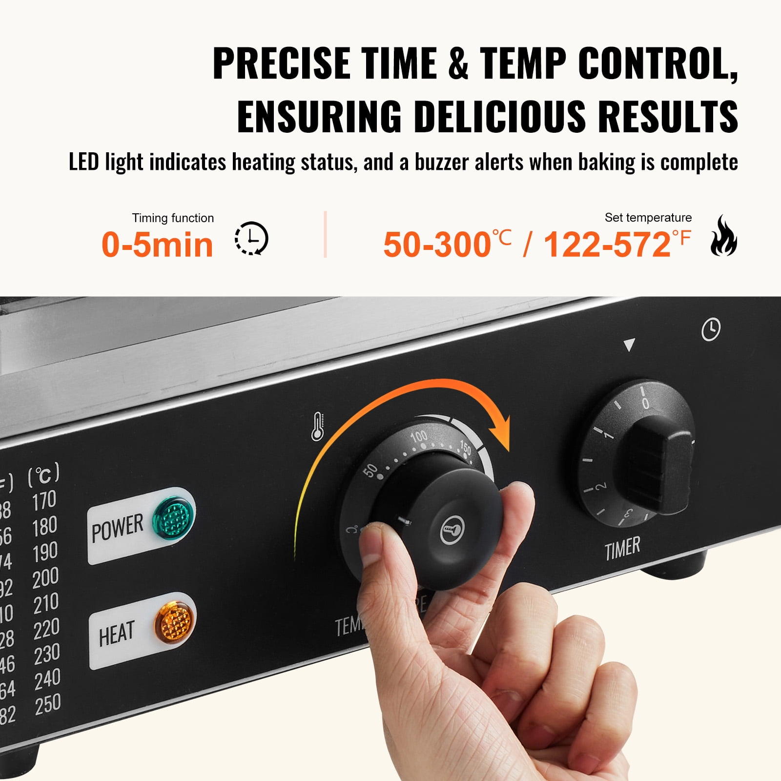 Crafted with high-quality stainless steel and cast aluminum for durability and resistance to rust and corrosion. The Teflon-coated baking plate ensures easy cleaning and perfectly shaped donuts. The double-sided heating flat pan ensures even baking, allowing you to make 12 donuts at a time. The non-stick PTFE coating facilitates quick cooking and effortless cleaning. Easily control the time and temperature with the 0-5 minute timer and temperature adjustment knob (50-300℃ /122-572°F). LED lights indicate the heating status, and a buzzer signals when the donuts are ready. Designed with user convenience in mind, featuring a heat-resistant stainless steel handle to prevent burns. The detachable drip tray makes cleaning a breeze. Side vents ensure efficient cooling, and anti-slip feet provide stability. Create delicious donuts with a soft interior and crispy exterior. Add your favorite decorations like chocolate and candies for a variety of flavors. Perfect for bakeries, hotels, restaurants, snack bars, and more.