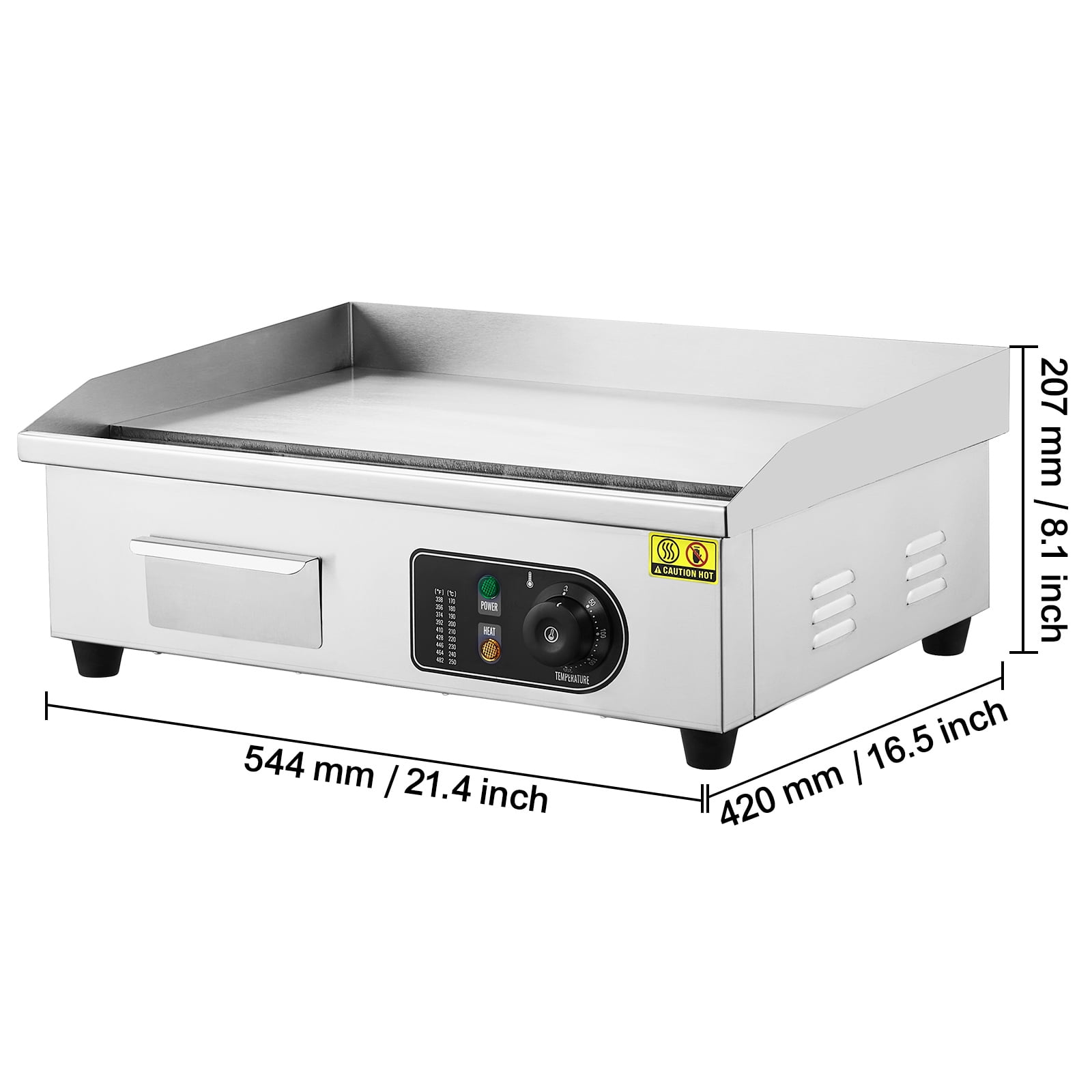 Consistent Heat Distribution: The KFFKFF commercial electric griddle is designed with a thickened 10mm / 0.39in iron cooking plate, ensuring even heating across the entire grill. The U-shaped heating tubes further enhance temperature uniformity, allowing for rapid food heating. Ample Cooking Space: Our commercial griddle features a high-quality A3 iron plate with a non-stick and cast iron cooking surface. With a spacious cooking area measuring 21.26 x 11.81 inches, you can easily cook multiple dishes simultaneously, making it perfect for fast-paced and high-volume demands. Adjustable Temperature Control: The electric commercial griddle offers a temperature range of 122 – 536 °F (50 – 280°C), providing precise control over the heat. With multiple temperature settings, you can easily adjust the temperature according to your dish’s requirements, ensuring perfect cooking results every time. Convenient Features: The flat top electric griddle is equipped with a widened oil drain hole, making it effortless to remove waste oil. The oil collection tray conveniently gathers waste oil and food debris, simplifying the disposal process. Rubber feet ensure stability, while the raised oil baffle prevents oil splashes. Versatile Usage: The electric commercial flat top grill is suitable for various settings, including both home and commercial environments such as restaurants, shops, roadside stands, and snack bars. It is the ideal choice for preparing a wide range of delicious dishes, including pancakes, crispy bacon, grilled cheese, hearty breakfasts, fried dishes, omelets, pizzas, steaks, and burgers.