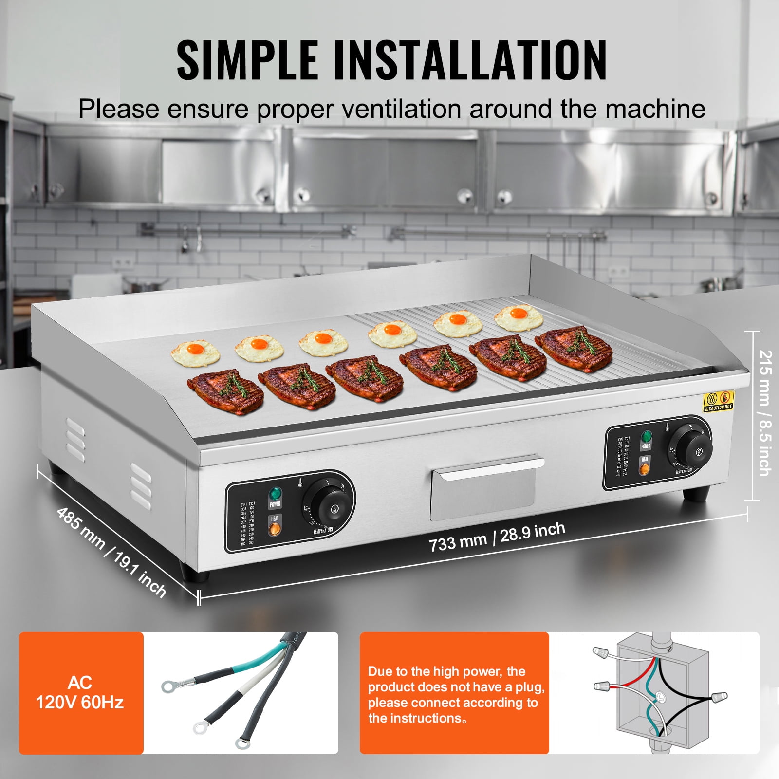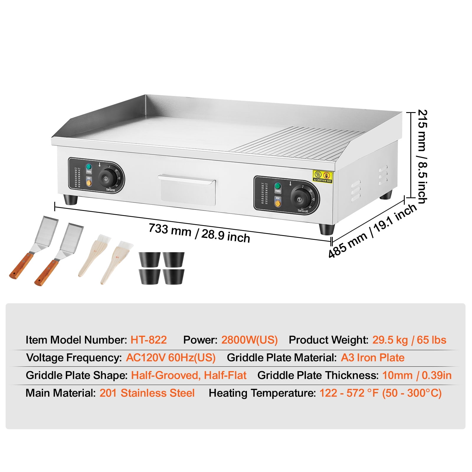Product Description KFFKFF Electric Griddle Introducing the KFFKFF Electric Griddle, a game-changer in the world of cooking appliances. Crafted with a thickened and widened A3 iron plate, this commercial griddle ensures even and precise temperature control, guaranteeing deliciously cooked food every time. Evenly Distributed Heat Experience the magic of evenly distributed heat with the KFFKFF commercial griddle. Its adjustable temperature range of 122 ~ 572 ℉ (50 – 300°C) allows you to achieve the perfect cooking temperature for various foods. Maintaining the KFFKFF commercial flat top grill is a breeze. After each use, simply keep it at a temperature of 300℉ and wipe it clean with the included grill brush or brick. Versatile Cooking Unlock a world of culinary possibilities with the KFFKFF flat top electric griddle. From juicy meats to fluffy pancakes, sizzling steaks to perfectly cooked eggs, this griddle can handle it all. Hassle-Free Installation Setting up the KFFKFF electric commercial griddle is a breeze. Simply install it on a heat-resistant workbench, ensuring enough space for the power cord. Effortless Cleaning Cleaning the KFFKFF teppanyaki grill is a breeze. Its surface is designed to be easy to clean, and the oil collection box allows for quick removal of waste oil and food debris. Specifications Item Model Number: HT-822 Voltage Frequency: AC120V 60Hz(US), AC220-240V 50Hz(EU) Power: 2800W(US), 4400W(EU) Griddle Plate Material: A3 Iron Plate Griddle Plate Shape: Half-Grooved, Half-Flat Griddle Plate Thickness: 10mm / 0.39in Main Material: 201 Stainless Steel Heating Temperature: 122 – 572 °F (50 – 300°C) Product Weight: 29.5 kg / 65 lbs(US), 29.75 kg / 65.6 lbs(EU) Package Content 1 x Commercial Electric Griddle 2 x Spatulas 2 x Brushes 4 x Foot Pads