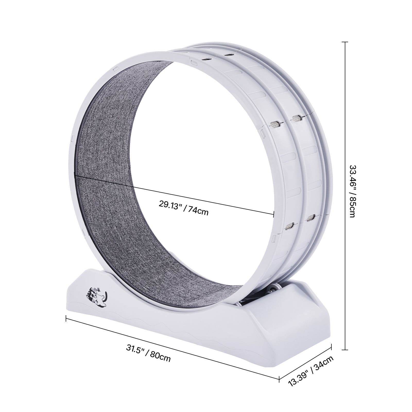 Product Description KFFKFF Cat Treadmill: Enhance Your Pets’ Well-being! Created with the well-being of your furry friends in mind, this durable and lightweight cat treadmill boasts smooth and noiseless rollers, ensuring a comfortable running experience. Its roomy interior can easily accommodate cats of all sizes, while the use of easy-to-clean materials simplifies maintenance. This multi-functional treadmill can also double as a cozy resting spot or an engaging play area, providing endless entertainment for your beloved pets. Unmatched Comfort and Security Introducing our exceptional cat wheel that prioritizes your feline’s comfort and safety above all. Crafted with a sturdy construction and a wide 13.4-inch base, this wheel offers a stable running surface, granting your cat the confidence to dash and play without any worries. Give your beloved pet the support they deserve! Unleash Ultimate Freedom with Ample Space Experience the epitome of freedom for your cat with our spacious cat running wheel. Boasting a generous internal diameter, this wheel provides abundant room for your furry friend to exercise with utmost comfort. Designed to accommodate cats weighing up to 8.8 lbs, it offers the perfect space for them to stretch their legs and indulge in an exhilarating workout session! Effortless Installation for Your Convenience Begin the fun-filled journey with your cat in no time! Our kitty treadmill arrives with a comprehensive set of accessories and clear instructions, ensuring a hassle-free assembly process. Spend less time on setup and more time relishing the sight of your kitty joyfully engaging with their new toy! Simplicity in Cleaning and Storage Cleaning becomes a breeze with the ingenious removable inner mat design of our cat exercise wheel. Additionally, the lightweight and compact structure allows for effortless storage, saving valuable space in your home while ensuring that it’s always prepared for your cat’s next invigorating workout! Versatility Meets Coziness Prepare to be amazed by the versatility of our treadmill, which doubles as a cozy cat bed! Enhance the comfort by placing a soft mat, blanket, or cushion on top, transforming it into a warm and inviting resting spot for your furry companion. It’s the perfect amalgamation of playfulness and relaxation, catering to all your cat’s needs! Peace of Mind with a Secure Lock Equipped with a reliable wheel lock feature, our cat treadmill remains firmly in place when not in use. This additional safety measure ensures that your cat won’t accidentally activate the treadmill or encounter any injuries, significantly minimizing potential risks and granting you peace of mind. Specifications Item Model Number: Small 80cm Model Material: PP Runway Width: 10.24 in (260 mm) Base Dimensions (W x L): 13.39 x 31.1 in (340 x 795 mm) Suitable Cat Weight: Up to 8.8 lbs Product Weight: 15.87 lbs (7.2 kg) Product Dimensions: 31.5 x 13.39 x 33.46 in (800 x 340 x 850 mm) Outer Diameter: 31.5 in (800 mm) Inner Diameter: 29.13 in (740 mm) Package Content 1 x Screw 1 x Installation Guide