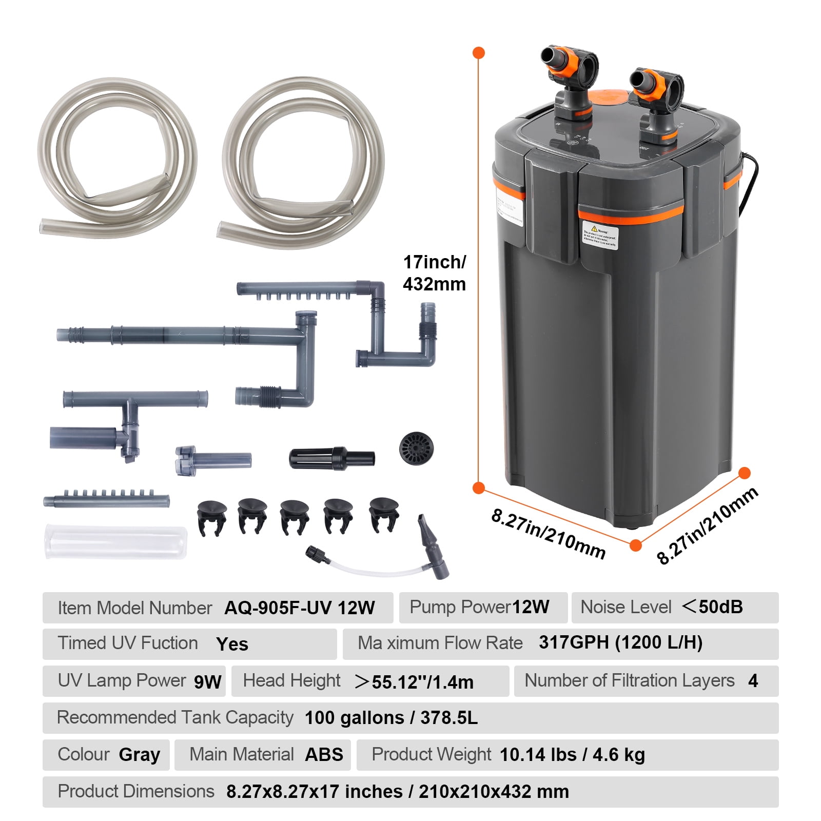 Product Description KFFKFF Aquarium Filter, Purify Water Quality with Ease Experience the optimal filtration performance with the KFFKFF Aquarium Filter. Equipped with a robust motor, this filter ensures a steady flow of water, effectively maintaining a healthy and pristine environment for your beloved aquatic companions. Silent Operation with Built-in Pure Copper Brushless Motor Experience a truly quiet and peaceful environment with the KFFKFF aquarium filter. Our innovative design incorporates a pure copper brushless motor that operates silently, ensuring a noise-free experience. Unlike other filters, our advanced technology eliminates the presence of air, resulting in low power consumption and high flow rates. With a sound level of less than 50 decibels, you can enjoy a serene and comfortable atmosphere in your aquarium. User-Friendly Design for Ultimate Convenience At KFFKFF, we prioritize your convenience. Our aquarium filter is thoughtfully designed with various user-friendly features. The UV protection lamp comes with automatic timer settings, allowing you to effortlessly maintain a healthy environment for your aquatic pets. The flow adjustment valve enables customizable water flow, ensuring optimal conditions for your fish. Additionally, the dual quick-release head design simplifies cleaning and maintenance, saving you time and effort. Leak-Proof and Secure with Multiple Sealing Mechanisms Rest assured knowing that the KFFKFF aquarium filter is equipped with multiple sealing mechanisms to prevent any leaks. Our quick-release joint design ensures a tight and secure connection, while the thickened waterproof rubber rings provide an extra layer of protection. The sealed inlet and locking clasp design further enhance the filter’s reliability, giving you peace of mind and a worry-free aquarium experience. Suitable for Various Settings and Applications The KFFKFF aquarium filter is not limited to one setting. Its versatile design makes it suitable for a wide range of applications. Whether you have a home aquarium, a backyard fish pond, an aquarium exhibition tank, or even a tank in a flower and bird market, our filter is the perfect choice. It effectively maintains clear water and ensures adequate oxygen levels, creating a healthy and thriving environment for your aquatic companions. Maintain Balanced Water Quality with Upgrade UV Lamp Timer With the KFFKFF aquarium filter, maintaining a balanced and healthy water quality has never been easier. Our filter comes with an upgrade UV lamp that can be conveniently set to automatically turn on and off at specific times. This feature ensures consistent exposure to UV light, effectively eliminating harmful bacteria and algae. Say goodbye to cloudy water and hello to crystal-clear, pristine conditions for your fish. Convenient Operation with Adjustable Exhaust Valve Design Experience hassle-free operation with the KFFKFF aquarium filter’s adjustable exhaust valve design. Unlike traditional filters that require water addition, our innovative design allows you to activate the filter simply by pulling up the exhaust valve. This convenient feature saves you time and effort, making maintenance a breeze. Enjoy a seamless and effortless filtration process with KFFKFF. Specifications Model: AQ-905F-UV 12W Pump Power: 12W Timed UV Function: Yes Noise Level: 55.12”/1.4m Number of Filtration Layers: 4 Recommended Tank Capacity: 100 gallons / 378.5L Color: Gray Main Material: ABS Product Weight: 10.14 lbs / 4.6 kg Product Dimensions: 8.27×8.27×14.65 inches / 210x210x372 mm Package Content 1 x Aquarium Filter 2 x Inlet/Outlet Components 2 x PVC Hoses 47.24”/1.2m 1 x Inlet Hose 1 x Inlet Adjustment Switch 1 x New Oil Film Remover 1 x Oil Film Remover Adjustment Switch 1 x Float Head 1 x Extension Tube 1 x Telescopic Tube 1 x Basket 1 1 x Outlet Hose 1 x Outlet Adjustment Switch 1 x Elbow Tube 1 x Air Flow Regulator 1 x Air Tube 1 x Outlet Nozzle 1 x Basket 2 1 x Plug 5 Suction Cups 2 x Rainfall Pipes 1 x UV Lamp Glass Tube 1 x User Manual