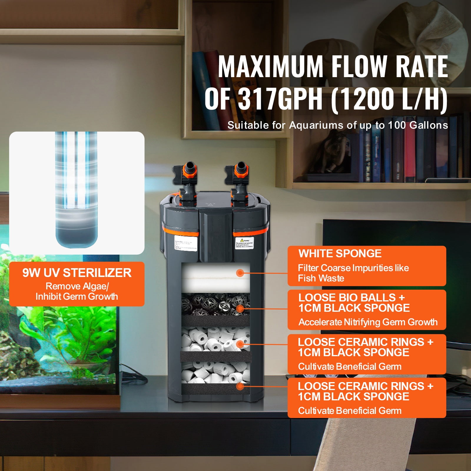 Efficient Filtration: The built-in pump has a maximum flow rate of 317GPH (1200 L/H) with a power of 12W, suitable for 100-gallon freshwater aquariums, turtle tanks, and fish tanks. It effectively filters water, ensuring a clean aquatic environment. The sponge layers, ceramic rings, and bio-balls provide excellent filtration. Silent Operation: Equipped with a pure copper brushless motor, this filter operates silently. It eliminates air inside the filter, resulting in low power consumption and high flow rate without any noise. The sound level is below 50 decibels, ensuring a peaceful home environment while effectively purifying water. User-Friendly: The UV lamp comes with a timer upgrade, allowing for automatic on/off settings at 4/8/24-hour intervals. It also features a flow adjustment valve to regulate water flow from maximum to minimum, and even shut it off completely if desired. The dual quick-release head design simplifies cleaning and maintenance, while the oil film removal feature ensures sufficient oxygen in the fish tank. High Sealing: The quick-release joint design enhances port sealing, making disassembly and cleaning more convenient. The leak-proof design is further optimized with a thickened and tightened silicone ring. The rotor structure has been improved for a longer lifespan, with both ends of the rotor integrated for better performance. Versatile Application: This aquarium filter effectively removes debris and waste from fish and turtles in aquariums, maintaining clear and oxygenated water. It is suitable for various settings, including home aquariums, exhibition tanks, and market tanks. A must-have for aquarium enthusiasts. Friendly Note: Tested flow rates are under no-load conditions and may decrease with filter use and height differences.