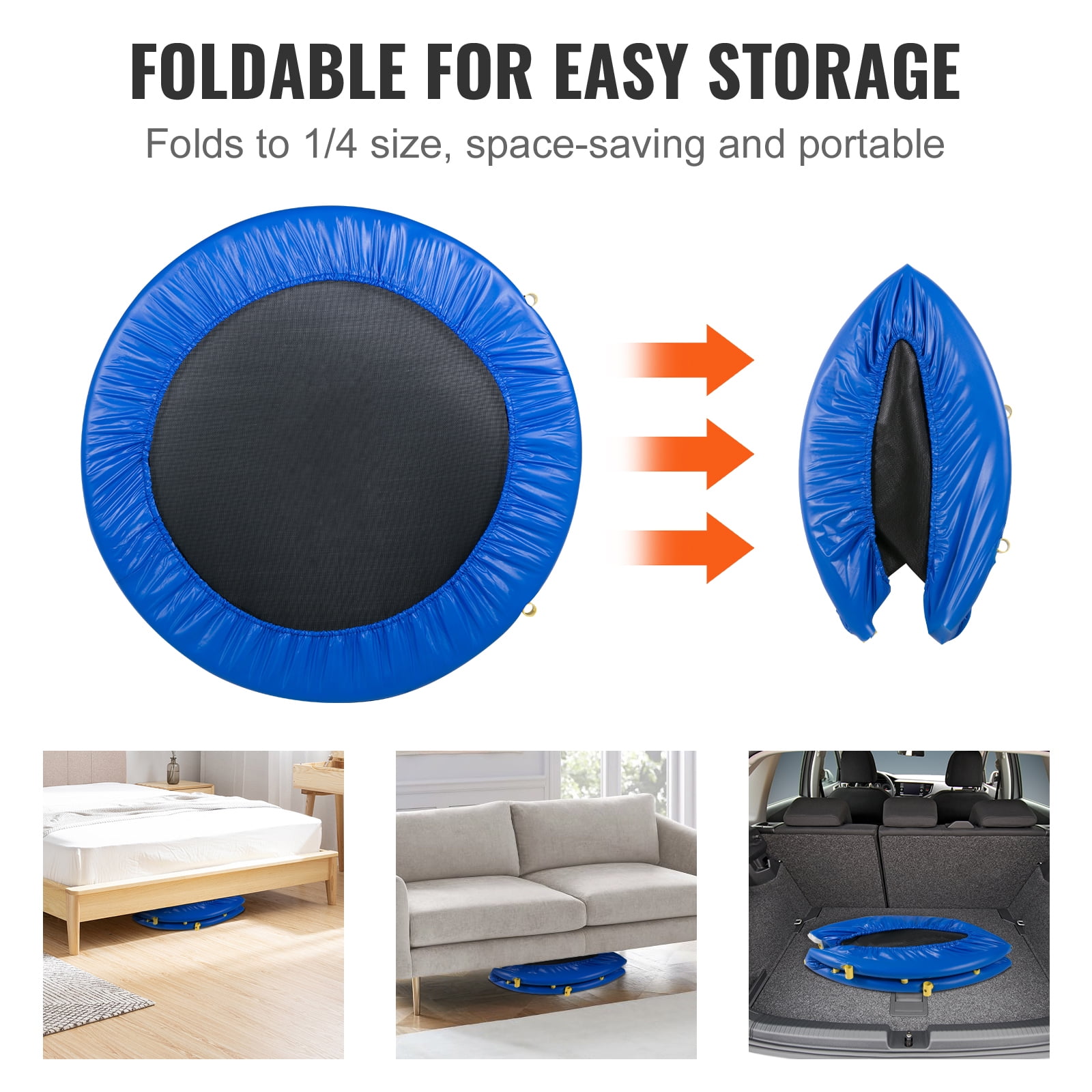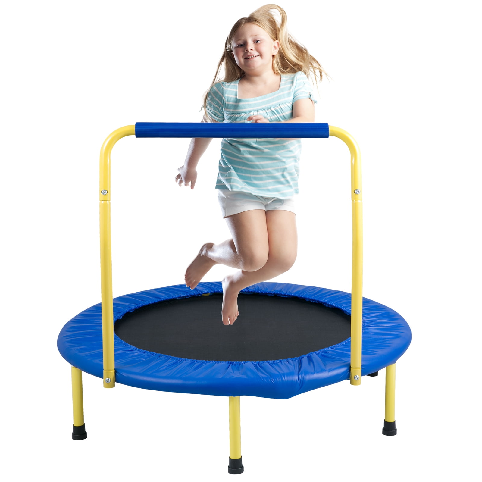 SKYSHALO Foldable Bouncer Kids Trampoline with Foam Handle, Blue, 31.89″ x 36.22″ x 36.22″ Scientific Growth Exercise: Designed for children, this 3-foot trampoline promotes physical fitness, endurance, and coordination while providing a fun indoor activity. Suitable for ages 3 years and above Sturdy, Stable, Safe: Features all-steel construction with an upgraded coating that resists bending and deformation. Foam handles ensure comfort, while rubber feet prevent slipping and reduce noise. The waterproof PP mat is easy to clean Safety First: Reinforced with 28 elastic tough straps, the trampoline has a maximum load capacity of 130 pounds and is recommended for single-person use. The 0.24-inch-thick spring foam protection ensures a safe bounce Foldable and Easy to Store: Folds in just 3 seconds for convenient storage under sofas or in car trunks. Its portable design allows kids to bounce anywhere they like Quick Assembly: Easy to assemble with just one adult. Follow the instructions to secure the frame and legs with precise holes and threads