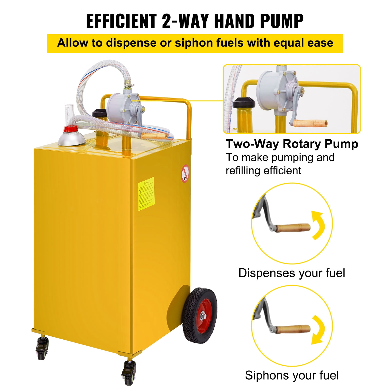 KFFKFF 35 Gallon Fuel Caddy: Easily maneuverable and efficient, our 35-gallon fuel caddy allows you to bring fuel directly to where it’s needed. Perfect for auto repair, farms, lawns, gardens, and marine uses. Effortless Fuel Dispensing: The bi-directional hand rotary pump allows for easy fuel dispensing or siphoning, making refilling quick and hassle-free. No more sweating while transferring fuel. Convenient and User-Friendly: Equipped with an anti-static ground clamp to prevent static discharges, an accurate fill gauge for easy fuel level monitoring, and heavy-duty wheels for smooth transportation on any terrain. Speedy Refueling: The 9.8 ft kink-free hose with nozzle ensures maximum flow and fast refueling. The wide diameter neck prevents spills and wastage. Includes a hose hanger for convenient storage. Durable Steel Tank: Crafted from robust 201 stainless steel, our fuel tank is built to withstand various weather conditions, UV radiation, and dents. Enjoy a long service life with this high-quality material.