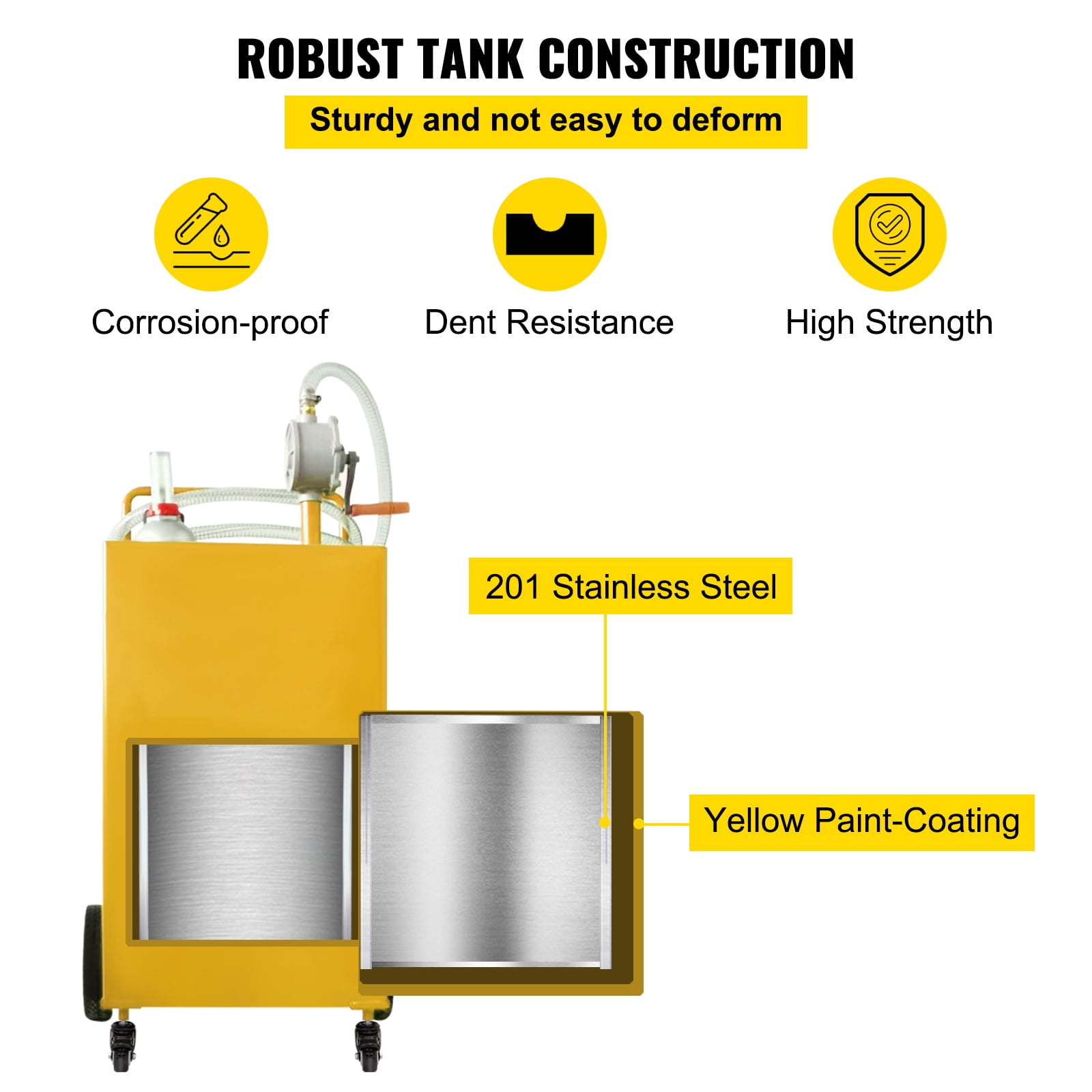 Product Description 35 Gallon Fuel Caddy Effortlessly refuel during various applications with this 35-gallon fuel caddy. Its large capacity and maneuverability ensure efficient fuel transfer, minimizing spills and waste. This versatile equipment is perfect for auto repairs, farms, gardens, small engines, motorcycle/ATV, marine uses, and more. Experience the convenience of this quick and clean fuel caddy, a reliable companion in any condition. 35 Gallon Fuel Tank – Versatile and Reliable Introducing our KFFKFF portable gas tank, a reliable solution for all your refueling needs. This large capacity caddy is designed to safely store and dispense up to 30 gallons of gasoline, diesel, and kerosene fuels. Whether you’re refueling vehicles, machinery, or equipment, this tank is built to handle the job with ease. Efficient Bi-Directional Pump – Easy Fuel Dispensing Our KFFKFF gas caddy features an efficient bi-directional pump that allows you to easily dispense or siphon fuel by simply changing the rotation of the crank handle. This innovative design eliminates the risk of overfilling tanks by pulling excess gas or diesel back into the caddy. Say goodbye to messy spills and wasted fuel. Premium Structure for Convenience and Safety Designed with your convenience and safety in mind, our KFFKFF gas caddy is equipped with a range of premium features. It boasts 8″ large wheels and 2″ small wheels for easy maneuverability, an anti-static ground clamp for added safety, a filler neck with gas cap for secure storage, a handy tube holder for easy access, and an easy leverage push handle for effortless transportation. With these thoughtful designs, you can expect efficient and secure work every time. Durable High-Strength Steel Tank Crafted from high-quality 201 stainless steel material, our 35 gallon diesel tank offers exceptional strength and durability. This premium material provides excellent resistance against mechanical damage and corrosion, ensuring long-lasting performance even in demanding environments. Invest in a tank that will stand the test of time. Efficient and Safe Fueling Fueling has never been easier with our KFFKFF gas caddy. The 9.8 FT automotive-grade rubber hose allows for efficient and safe fueling, while the heavy-duty nozzle supports fast fuel delivery. Simply open the clip and let the fuel flow. With this efficient system, you can quickly fill your fuel tank in minutes, saving you time and effort. Versatile and Reliable for Various Applications Our portable gas tank is designed to meet the fuel transportation needs of various industries. Whether you’re in the tanker truck business, shipping industry, outdoor sector, or construction field, this tank is the perfect solution. Its versatility makes it a valuable asset for any job site or project. Trust in the reliability of our KFFKFF gas caddy. Specifications Model: 35 Gallon Fuel Caddy Tank Size: 41.7 x 20.9 x 20.9 in/ 106 x 53 x 53 cm Fuel Type: Gasoline, Diesel, Kerosene Pump Type: Two Way Rotary Pump Hose Length: 9.8 ft/ 3 m Material: 201 Stainless Steel Big Tire Diameter: 8 in/ 20.3 cm Small Tire Diameter: 2 in/ 5.1 cm Product Color: Yellow Package Content 1 x Fuel Caddy