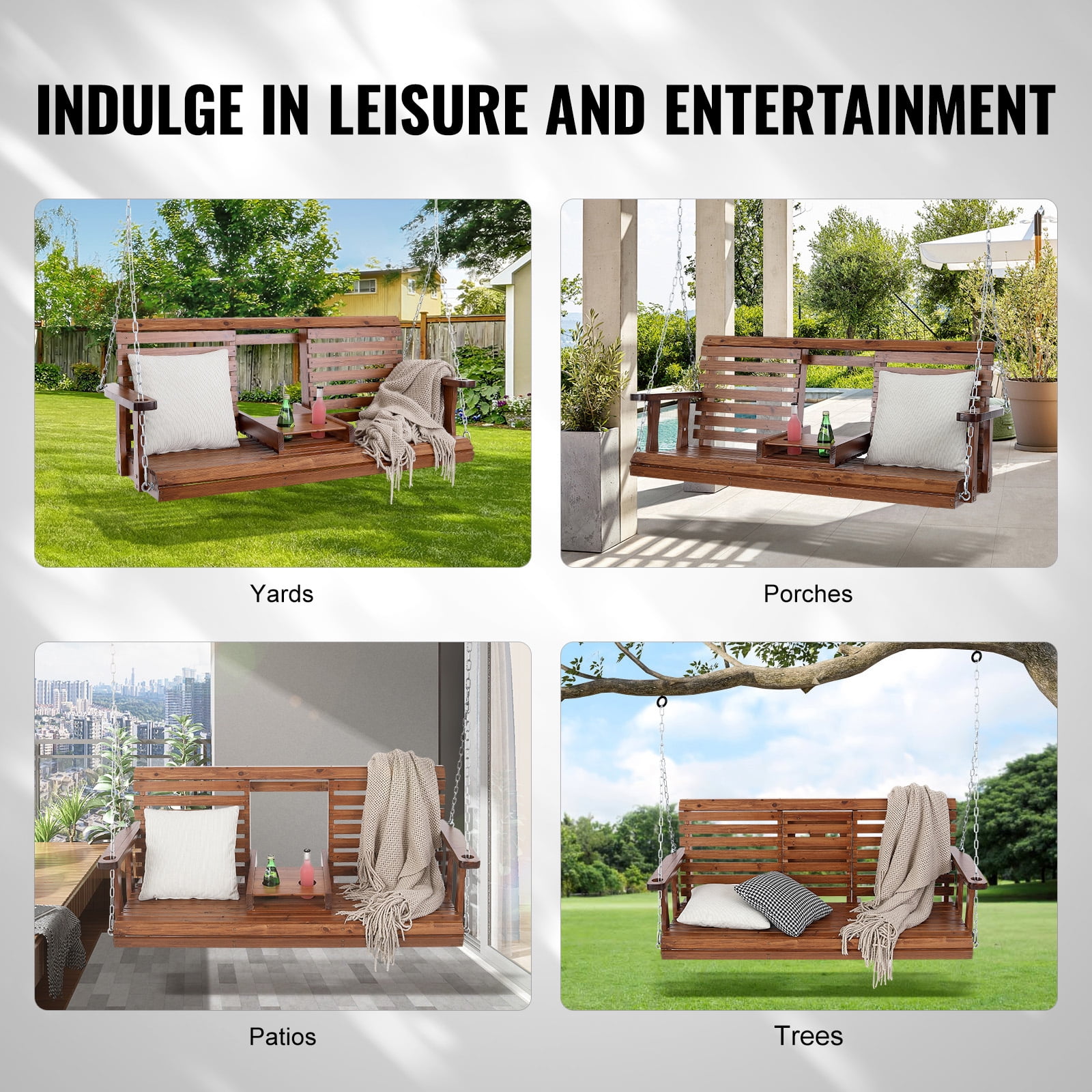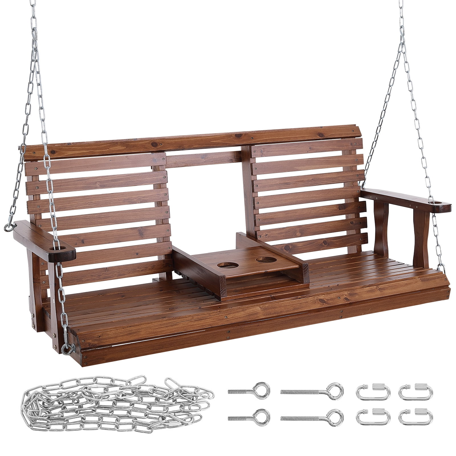 Sturdy & Stable: Made of pure fir wood and supported by galvanized steel chains, this porch swing ensures durability and stability with a load-bearing capacity of up to 880 pounds Weatherproof Durability: Coated with three layers of PU paint, the swing surface is smooth, scratch-resistant, and highly waterproof. The galvanized steel chain is weather-resistant, ensuring long-term use without rusting Comfort: Ergonomically designed with a sloped back to ease the load on your knees. Features a foldable cup holder for convenient drink storage and an adjustable steel chain with a safety lock for stable suspension Easy Installation: Pre-drilled holes and included fasteners make installation straightforward. with just two people, you can set it up in about 20 minutes on your patio, porch, yard, or even hang it from a tree Classic Design: The timeless combination of solid wood and metal chain adds vintage charm to your outdoor space. Dimensions: 67x28x23.6 inches; Seat size: 55x19x23 inches, accommodating 2-3 people