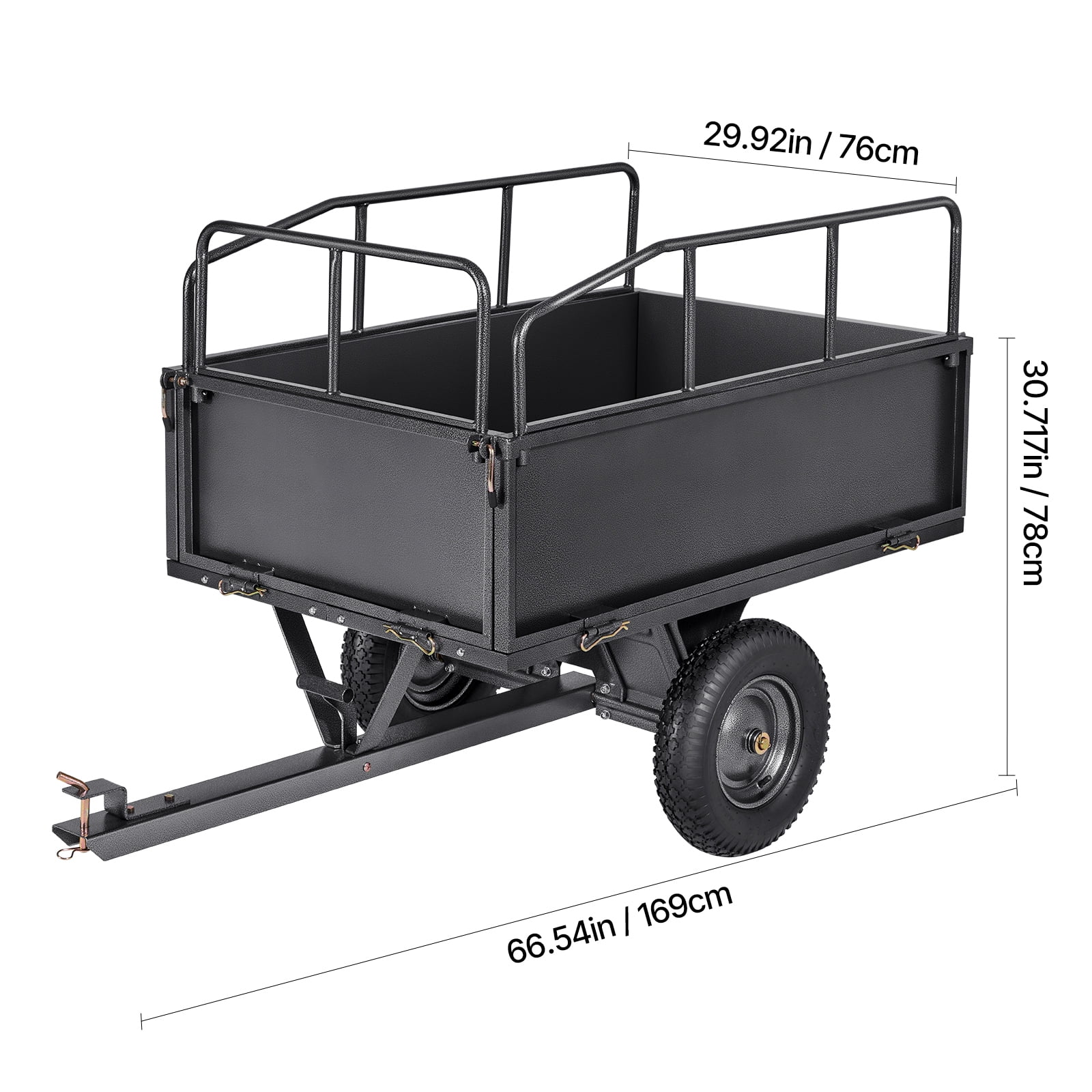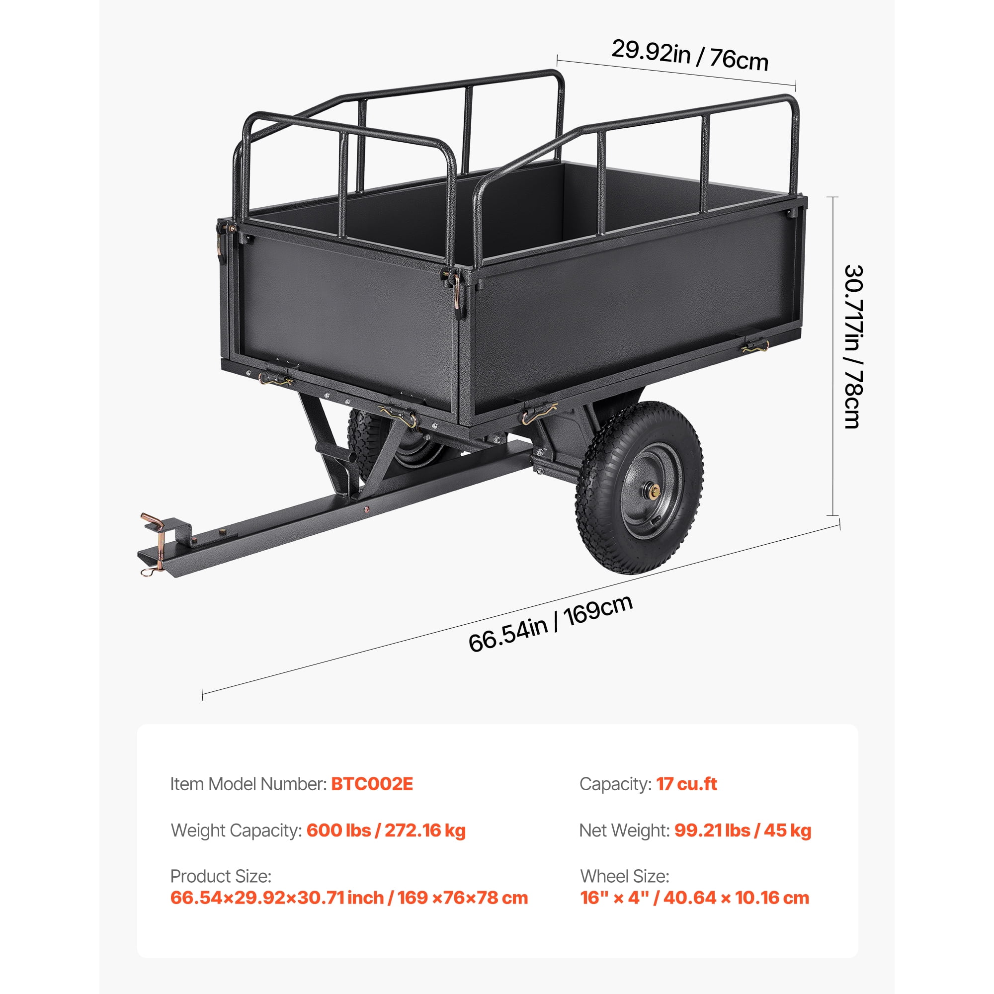Product Description Utility Trailer with 600lbs Capacity and 17 Cubic Feet Storage for ATV and Lawn Equipment This 600-pound capacity garden trailer is compatible with a range of vehicles, such as tractors, ATVs, and lawnmowers. Constructed with a durable steel frame, reinforced support bars, and equipped with pneumatic tires, it provides a spacious 17 cubic feet of storage. The 16-inch tires are designed to navigate smoothly across grass and muddy terrain, making it a practical solution for gardening tasks. Tow Bar Handle Constructed with 2″ / 50mm durable metal, ensuring enhanced stability during use. Pin Dimensions 12mm (0.47 inches) size, suitable for a wide range of vehicles Protective Panels Constructed from durable Q195 metal, offering enhanced security and reliability. Offers Dual Disposal Methods This product provides two convenient unloading methods: hand-pull and foot-pedal. The hand-pull option allows for controlled and accurate unloading, while the foot-pedal method is designed for faster handling of bulkier items, helping you save effort and time. Improved Functionality for Greater Convenience This 2″/50mm robust metal hitch provides reliable and secure performance. Its 0.47″/12mm pin diameter is compatible with various vehicle models, ensuring effortless attachment. The sturdy steel guardrails enhance safety by keeping items securely in place during transit. Oversized Wheels Fitted with 16″×4″ oversized tires, this trailer ensures reliable grip and stable movement, making it suitable for navigating uneven terrains like grass, mud, sand, and gravel. Specifications Item Model Number: BTC002E Capacity: 17 cu.ft Weight Capacity: 600 lbs / 272.16 kg Wheel Size: 16″ × 4″ / 40.64 × 10.16 cm Product Size: 66.54×29.92×30.71 inch / 169 ×76×78 cm Net Weight: 99.21 lbs / 45 kg Package Content 1 x Dump Trailer