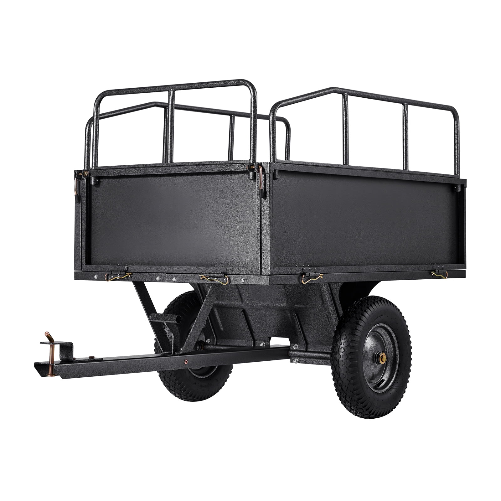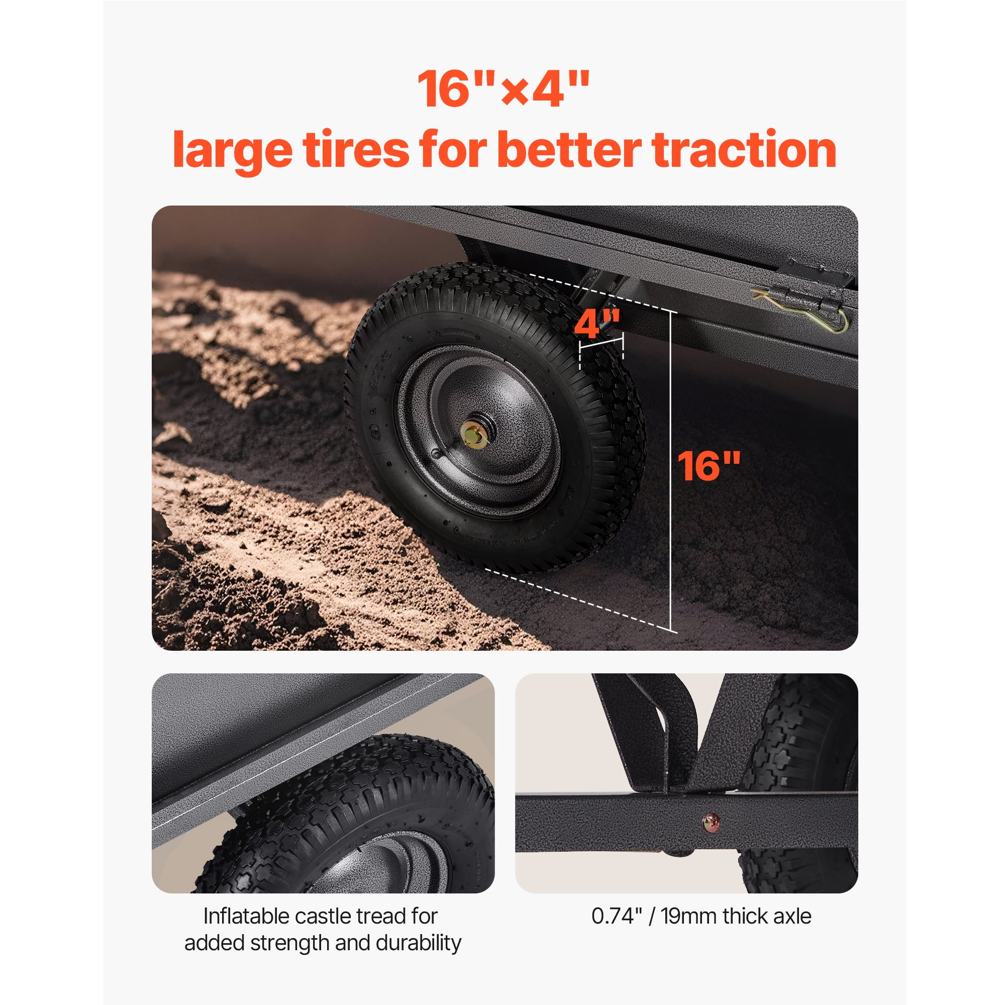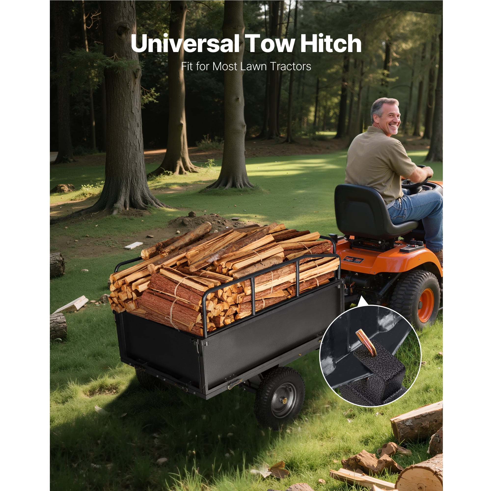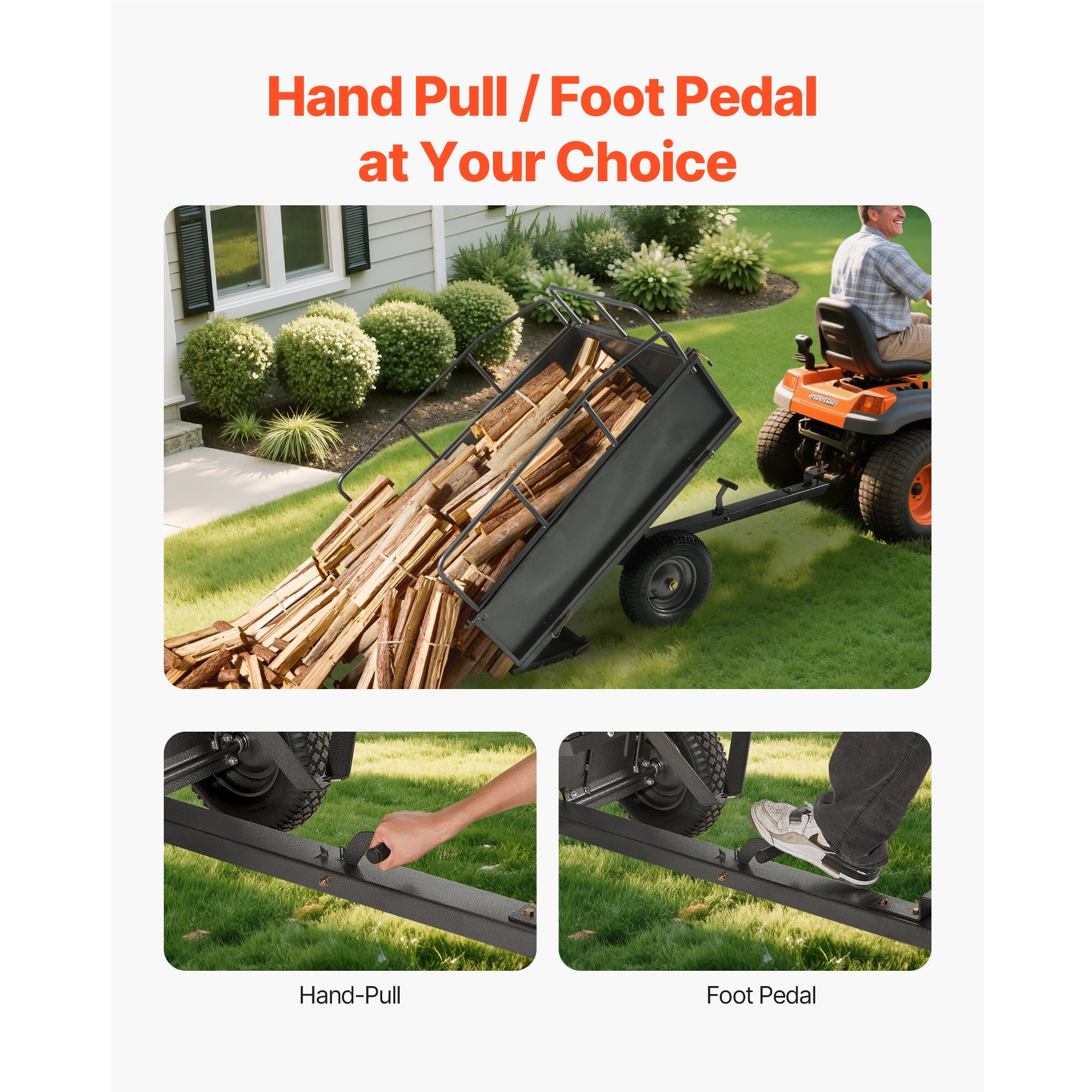 Wide Compatibility: Designed with a 0.47″/12mm pin, this garden trailer is suitable for a range of equipment such as tractors, ATVs, UTVs, and lawnmowers. It ensures quick and easy attachment, offering a practical solution to streamline hauling tasks and save time. Durable Construction: This yard trailer is designed with 1mm thick side panels and enhanced ribs for superior strength. The base is reinforced with 8 support ribs, increasing its load-bearing capacity and reducing the risk of deformation. Additionally, the hammer-tone paint finish has been upgraded for improved adhesion and long-lasting durability. Reliable Hauling Solution: Designed with a 600lbs load capacity and 17 cubic feet of storage, this ATV trailer is ideal for transporting garden debris, heavy materials such as soil, branches, and fertilizer. Its three-sided guardrail structure maximizes storage efficiency, minimizing trips and boosting productivity. Dual Control Options: This product features both hand-pull and foot-pedal dumping mechanisms, allowing users to select the method that best suits their needs. The hand-pull option provides greater precision for controlled unloading, while the foot-pedal option facilitates faster bulk unloading, enhancing efficiency and reducing effort. Designed for Challenging Surfaces: Equipped with 16″×4″ oversized pneumatic tires, this lawnmower utility trailer provides reliable grip and stability. It moves effortlessly over uneven terrains such as grass, mud, sand, and gravel, supported by a reinforced powder-coated axle for long-lasting performance.