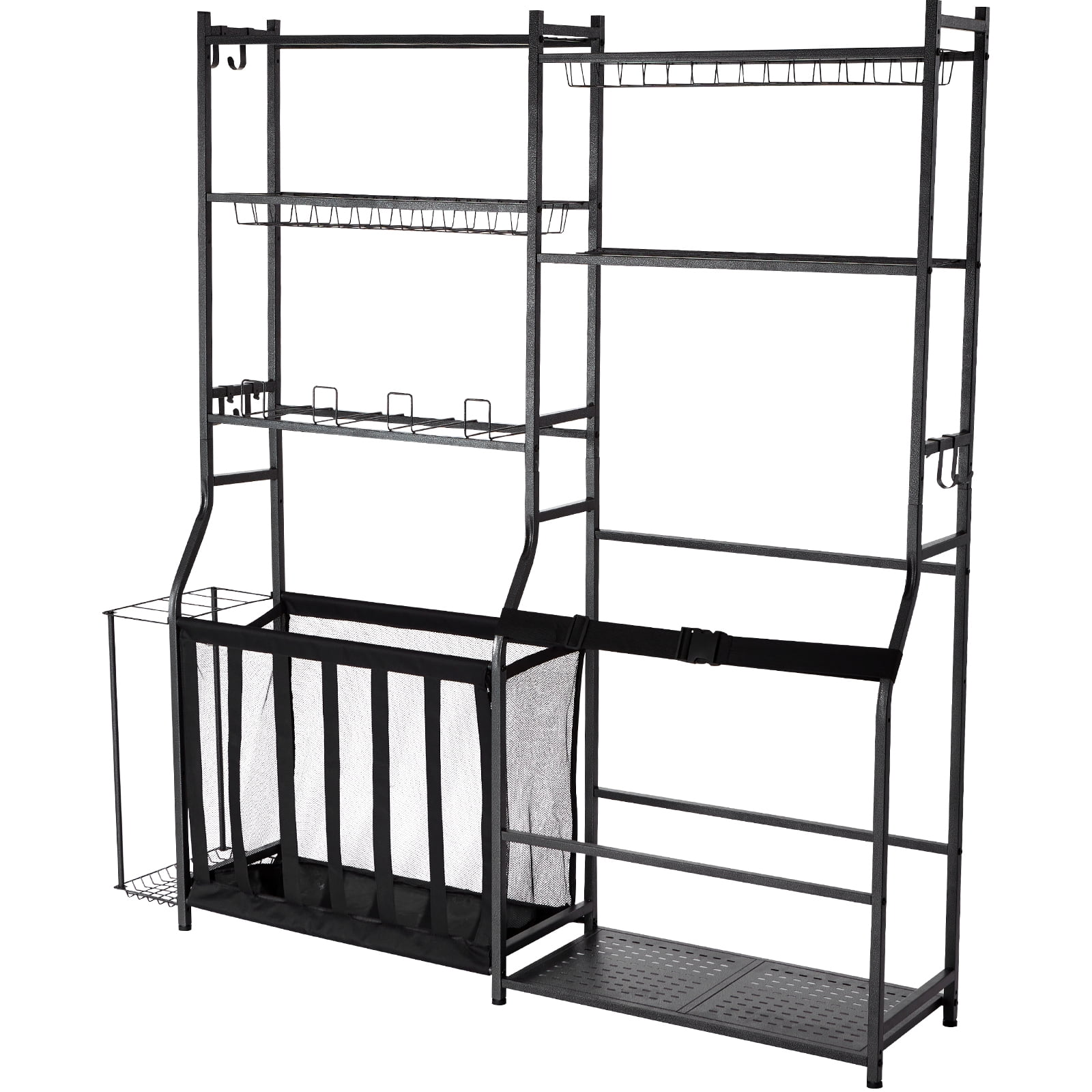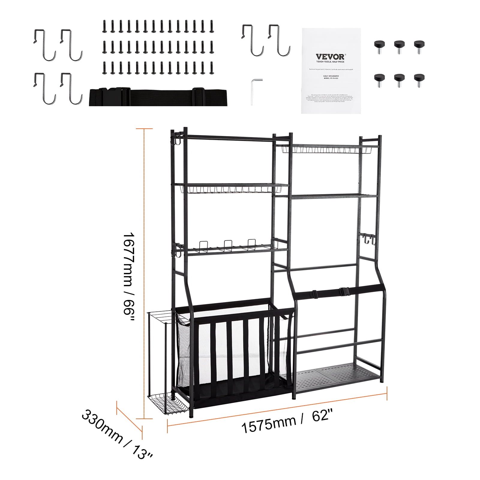 Product Description Multifunctional Sports Equipment Garage Organizer Dedicated to providing sports enthusiasts with storage solutions for their equipment, aiming to achieve an effortless indoor and outdoor organizing experience. Ideal for every physical trainer, professional coach, and anyone organizing sports equipment, offering the best solutions. Multifunctional This sports garage organizer comes with a variety of accessories. All these storage accessories help to keep your sports equipment organized, ensuring your items are neatly arranged and truly saving space. Humanized Design The detachable hooks expand the storage space and options; the added side rack allows for easy placement of various rackets and bats. Elastic bands maximize the use of the ball storage box’s space. The sports storage cart features six adjustable feet for easy height adjustment. Sturdy and Durable Material This sports gear storage organizer is made from heavy-duty powder-coated steel frames and heavy metal wire mesh, durable and wear-resistant for many years of use. Scratch-resistant textured paint, waterproof, rustproof, and resistant to scratches, ensuring a longer-lasting storage solution. Suitable for More Settings This practical sports equipment is perfect for organizing items in gyms, schools, and any sports venues, easily keeping your space tidy and organized. Easy to Install Its simple structure and instructions make this garage toy storage organizer easy to install, with all necessary accessories included, offering straightforward and efficient assembly. Adjustable Feet Featuring adjustable feet for easy height adjustment. Fixed style are more stable. Keep the storage cart safe, and balance even on uneven surfaces, allowing you to fully enjoy the joy of exercise. Specifications Item Model Number: RF-RY-032 Main Material: Q235 Product Weight: 13.8 kg / 30.42 lbs Product Dimensions (LxWxH): 1575x330x1677 mm / 62x13x66 inches Package Content 1 x Sports Equipment Garage Organizer 1 x Set of Accessories