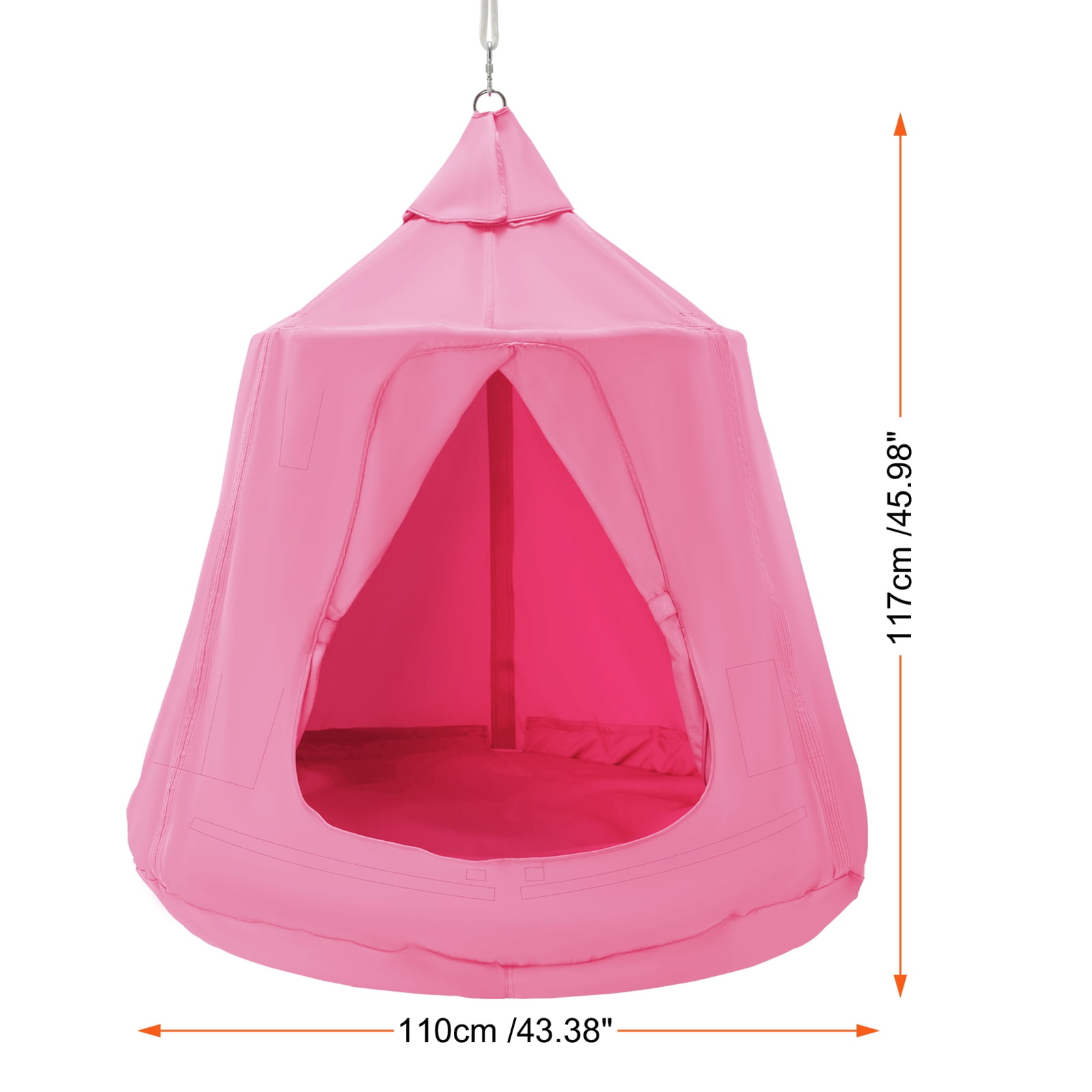 Product Description Swing into Comfort and Joy with KFFKFF Hanging Tree Tent With a remarkable weight capacity of 330 lbs, our hanging tent swing offers a secure haven for both kids and adults. Reinforced with multi-stitched seams at the top and sturdy hanging rings, this hammock ensures stability and peace of mind, whether indoors or outdoors. Waterproof Design KFFKFF’s ceiling swing hammock provides a comfortable resting space whether on rainy or sunny days. The upgraded double-layer waterproof top with the UV-resistant 600D Oxford fabric ensures a dry and enjoyable experience. Side windows keep fresh air circulation. Spacious Comfort This comfortable tree tent is equipped with a thick, removable inflatable cushion. It also boasts 5 interior pockets for storing personal items, keeping your space tidy. The built-in LED dreamy lights create a magical ambiance for your kids to revel in. Simple Installation The included large air pump simplifies setup, ideal for solo assembly. Just secure the circular ceiling with screws, insert sponge-shaping tubes and the inflatable cushion, hang the tent, and adjust the height – no extra tools are required! Versatile Application The 4.92ft/1.5m extended suspension rope allows flexible setup in various locations. Whether it’s on a hammock stand, a tree branch, or a wooden or concrete ceiling, it adapts easily. With expansion bolts and woodworking screws, the setup is both stable and straightforward. Elevate Playtime This durable 600D Oxford fabric hanging tent swing won’t stretch, tear, or fade, perfect for indoors and outdoors. With a 1.5m adjustable suspension rope, 5 interior pockets, and enchanting LED lights, it offers comfort and magic. Suitable for up to 3 kids or one adult, it’s effortlessly installed, letting your kids enjoy carefree moments. Complete Accessories We have prepared a comprehensive set of installation accessories, eliminating the need for separate purchases. We ensure that each component is intact and complete, making installation and use convenient for you. Specifications Item Model Number: SW134-TZ-10 Color: Pink Hanging Tree Tent Material: 600D Waterproof UV-Resistant Oxford Fabric Weight Capacity: 150 kg/330 lbs Closed State: Fully Enclosed Product Size: ø110x110x117cm/ø43.38×43.38×45.98 in Product Weight: 6.6kg/14.55 lbs Package Content 1 x User Manual 1 x Inflatable Cushion 1 x Air Pump 1 x Adjustable Rope 3 x Top Tubes 4 x Bottom Tubes 4 x Foam Tubes 1 x LED Light 1 x Mounting Plate 4 x Expansion Bolts 4 x Wood Screws 2 x Spring Hooks