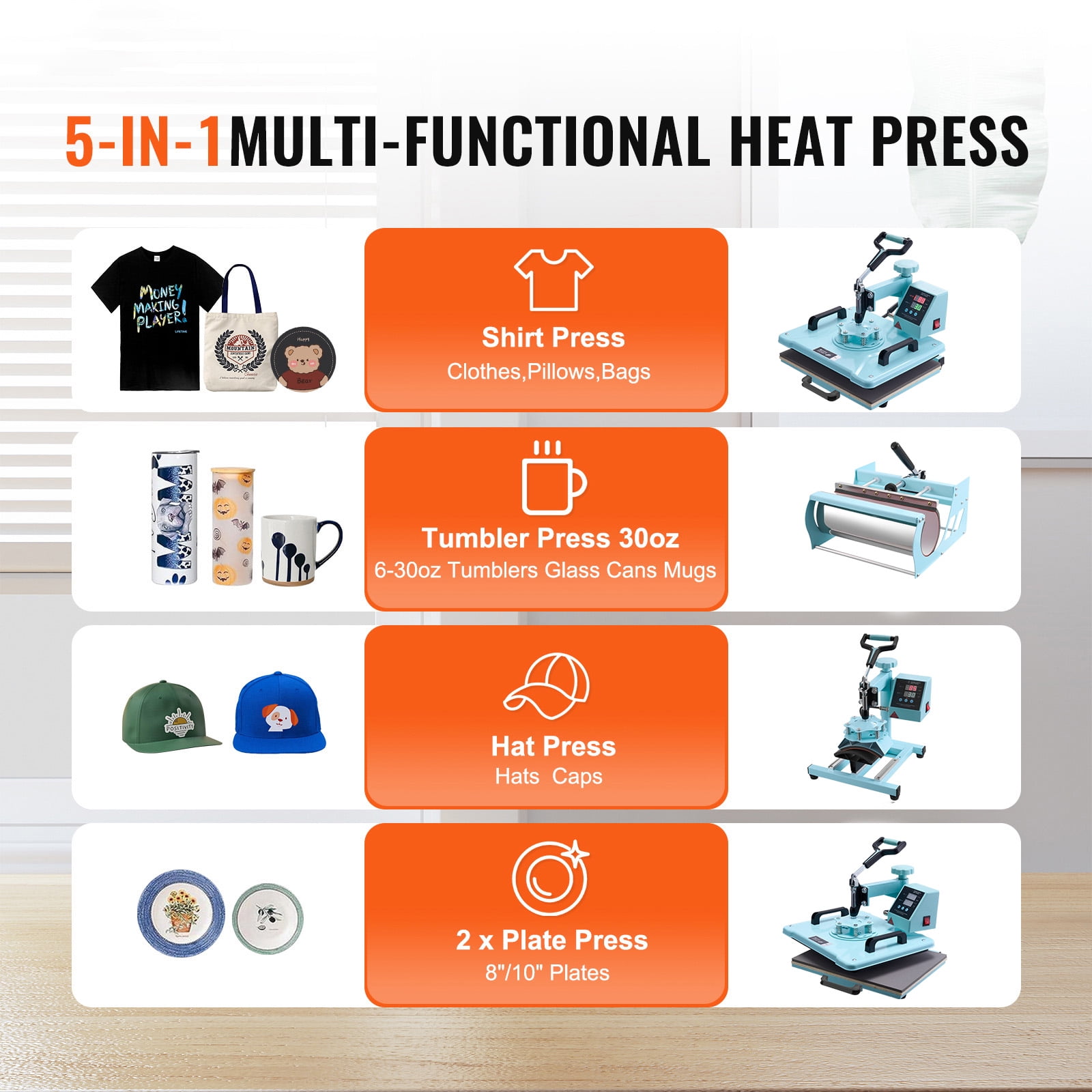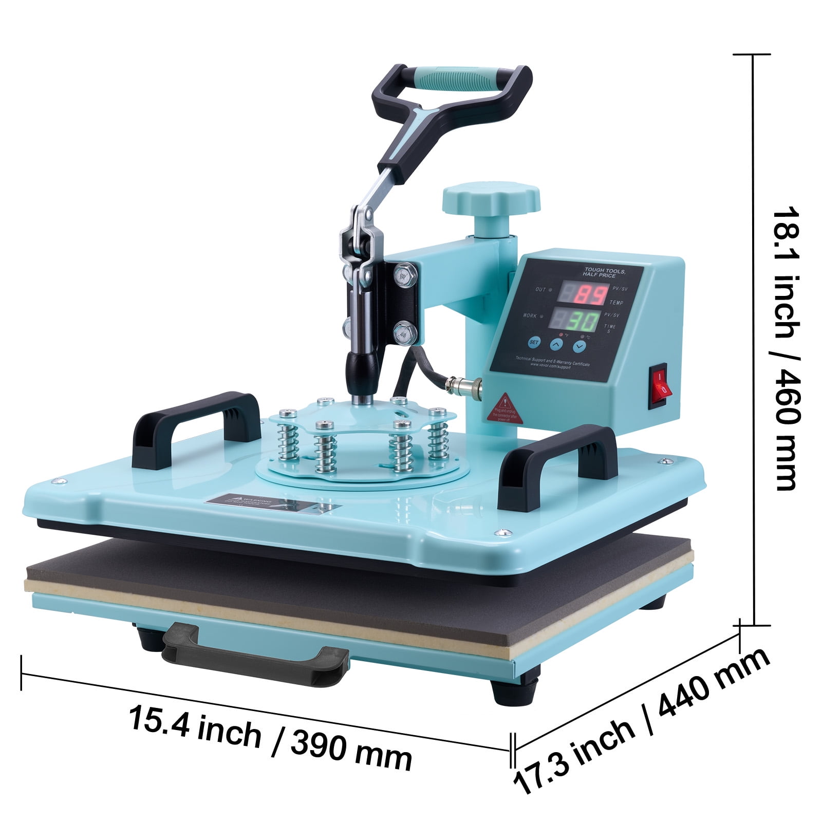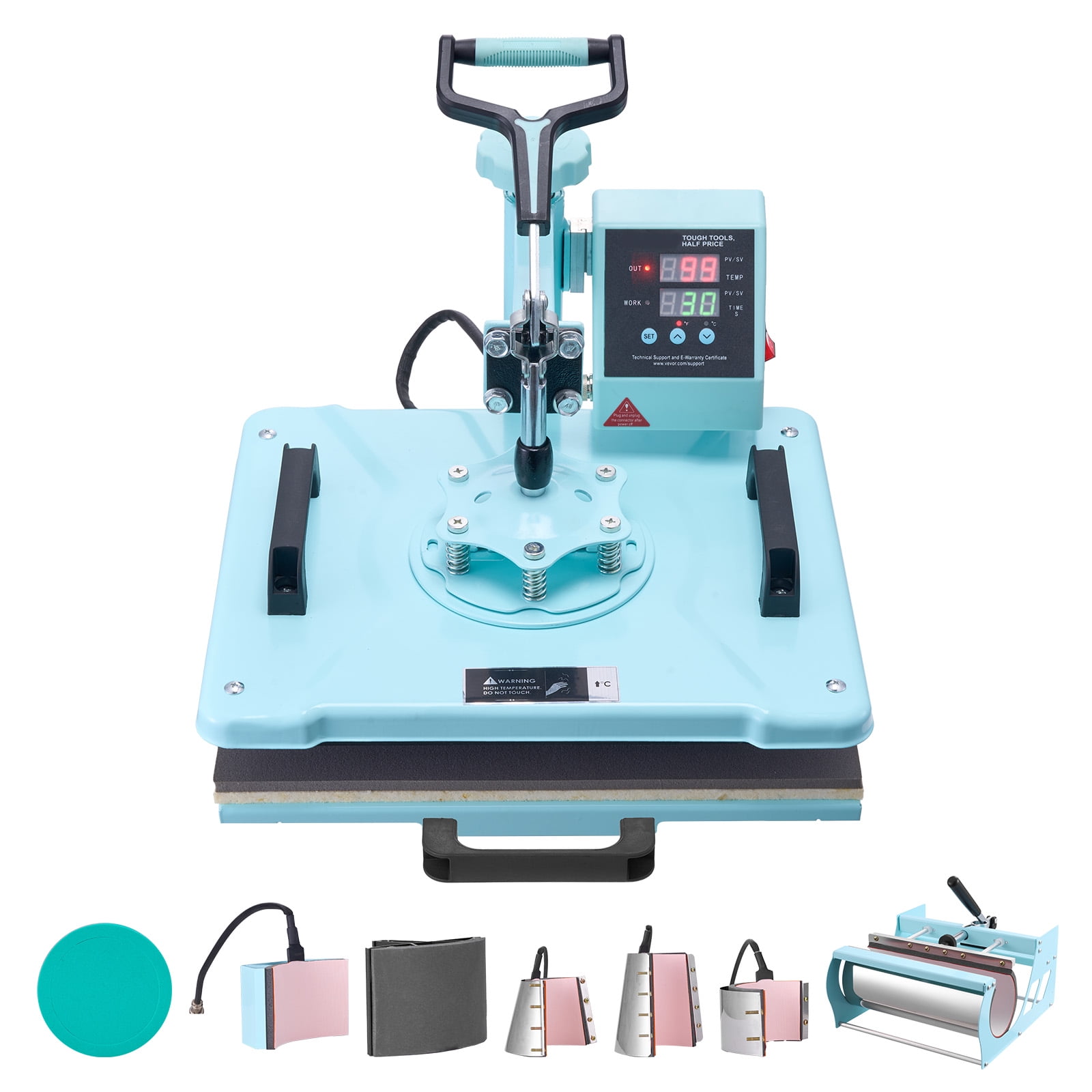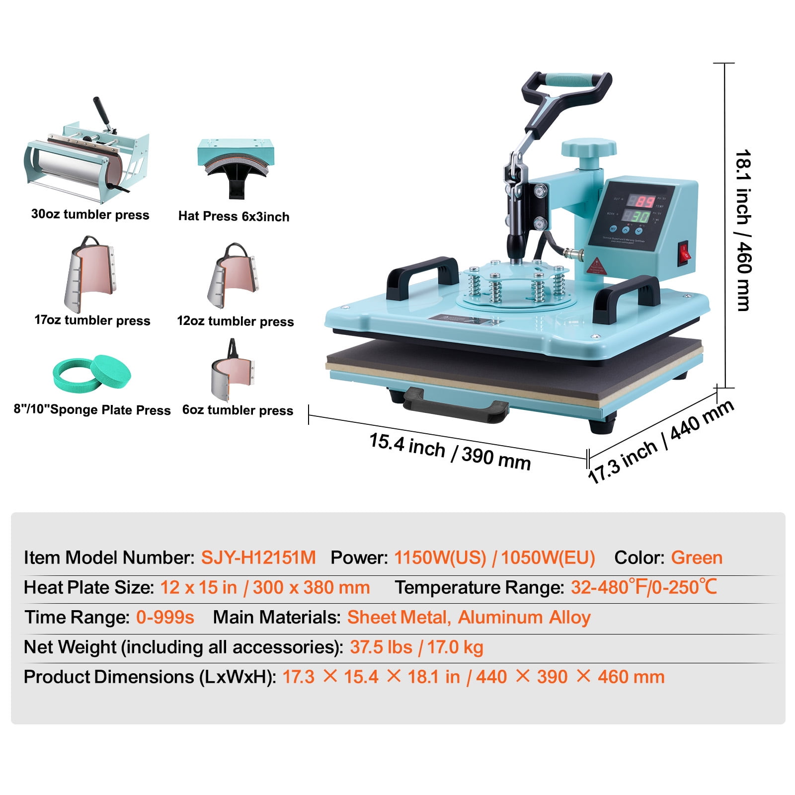 Product Description Unleash Your Creativity with the Ultimate Personalization Machine! Introducing the KFFKFF multifunctional heat press – your ultimate creative companion! With its wide range of attachments, this innovative machine effortlessly brings your designs to life on various surfaces, including T-shirts, pillowcases, hats, mugs, and more. The large 30oz mug attachment allows you to produce two mugs simultaneously, maximizing productivity. Versatile Heat Press Machine Experience the ultimate versatility with our state-of-the-art heat press machine. With a wide range of attachments, you can effortlessly transfer stunning designs onto T-shirts, pillowcases, hats, mugs, and ceramic plates, unlocking endless creative possibilities. Whether you’re creating personalized gifts or embarking on exciting DIY projects, this machine has got you covered. Enhanced Efficiency and Safety Our heat press machine now comes with an upgraded 30oz large tumbler press attachment, allowing you to work more efficiently. It can hold two standard-sized mugs, saving you time and effort. Additionally, the pull-out drawer design enhances safety by preventing burns when placing and removing items, ensuring a worry-free experience. Advanced Dual Tube Heating Technology Experience superior ironing results and faster operation with our heat transfer machine featuring dual tube heating technology. This innovative design ensures even heat distribution, resulting in consistent and efficient outcomes every time. Enjoy a more uniform temperature distribution and stable heating, taking your projects to the next level. Thoughtful User-Friendly Design Our heat press machine boasts a sleek and stylish color scheme that complements any decor style. The 360° swing-away arm allows for easy movement, preventing accidental contact with the heating plate. We’ve incorporated user-friendly details to provide a more convenient, safe, and comfortable experience, so you can focus on unleashing your creativity. Effortless Operation for Beginners Designed with simplicity in mind, our heat press machine offers easy parameter settings. Adjust the pressure, temperature, and time to suit different materials and design needs, ensuring flawless transfers every time. Once the pressing is complete, the pull-out drawer allows you to retrieve your creations without the fear of burns, making it perfect for beginners. Comfortable and Secure Rubber Handle Experience comfort and safety with our heat press machine’s non-slip rubber handle. The soft-touch handle reduces hand fatigue, allowing for extended use without discomfort. Its anti-slip feature ensures a secure grip during movement, providing peace of mind while using the machine. Specifications Item Model Number: SJY-H12151M Color: Green Heat Plate Size: 12 x 15 in / 300 x 380 mm Power: 1150W(US) / 1050W(AU/EU) Temperature Range: 32-480℉/0-250℃ Time Range: 0-999s Main Materials: Sheet Metal, Aluminum Alloy Net Weight (including all accessories): 37.5 lbs / 17.0 kg Package Content 1 x Heat Press Machine 4 x 6oz/12oz/17oz/30oz Tumbler Press 1 x Hat Press 2 x 8″/10″ Plate Press 1 x User Manual
