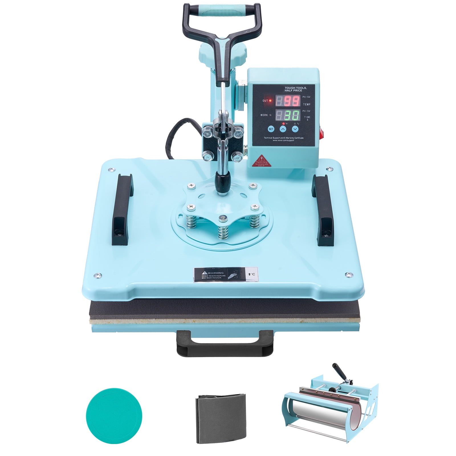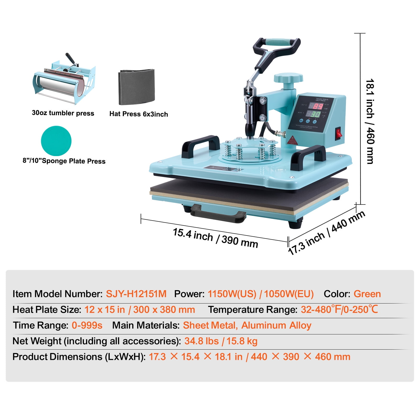 Product Description Unleash Your Creativity with the Ultimate Personalization Machine! Introducing the multifunctional heat press – your ultimate creative companion! With its wide range of attachments, this machine effortlessly brings your designs to life on various surfaces such as T-shirts, pillowcases, hats, mugs, and more. The innovative 30oz large mug attachment allows you to produce two mugs simultaneously, boosting productivity like never before. Experience peace of mind with its safety anti-scald design and enjoy precise control over your transfers with the advanced digital control feature. Whether you’re a beginner or a seasoned pro, this user-friendly machine will make turning your creative ideas into reality a breeze! Versatile Heat Press Machine Introducing the Multifunctional Heat Press, a game-changer in the world of crafting and personalization. With its wide range of attachments, this heat press allows you to effortlessly transfer stunning designs onto various surfaces, including T-shirts, pillowcases, hats, mugs, and ceramic plates. Unleash your unlimited creativity and make personalized gifts or craft unique DIY projects with ease. Enhanced Efficiency and Safety Experience a more efficient workflow with the upgraded KFFKFF heat press. The 30oz large tumbler press attachment can hold two standard-sized mugs, saving you time and effort. Our heat press machine features a pull-out drawer design, ensuring enhanced safety by preventing burns when placing and removing items. Advanced Dual Tube Heating Technology Revolutionize your ironing results with the KFFKFF heat transfer machine. Featuring dual tube heating technology, this innovative design ensures a more even distribution of heat. Say goodbye to uneven ironing and hello to consistent and efficient outcomes every time. Experience faster results and enjoy stable heating throughout the process. Thoughtful User-Friendly Design The KFFKFF heat press machine not only delivers exceptional performance but also boasts a stylish color scheme that complements any decor style. The 360° swing-away arm allows for easy movement, preventing accidental contact with the heating plate. We’ve taken care of every detail to provide you with a more convenient, safe, and comfortable experience. Easy Operation for Beginners Designed with beginners in mind, the KFFKFF heat press machine offers simple parameter settings. Adjust the pressure, temperature, and time to suit different materials and design needs, ensuring flawless transfers every time. After pressing, the pull-out drawer allows you to retrieve your creations without worrying about burns. Comfortable and Secure The KFFKFF heat press machine features a non-slip rubber handle that is soft to the touch, reducing hand fatigue during use. The handle is designed to prevent slipping, ensuring your safety while operating the heat press. Enjoy peace of mind and a comfortable grip throughout your crafting sessions. Specifications Item Model Number: SJY-H12151M Color: Green Heat Plate Size: 12 x 15 in / 300 x 380 mm Power: 1150W(US) / 1050W(AU/EU) Temperature Range: 32-480℉/0-250℃ Time Range: 0-999s Main Materials: Sheet Metal, Aluminum Alloy Net Weight (including all accessories): 34.8 lbs / 15.8 kg Package Content 1 x Heat Press Machine 1 x Tumbler Press 1 x Hat Press 2 x 8″/10″ Plate Press 1 x User Manual
