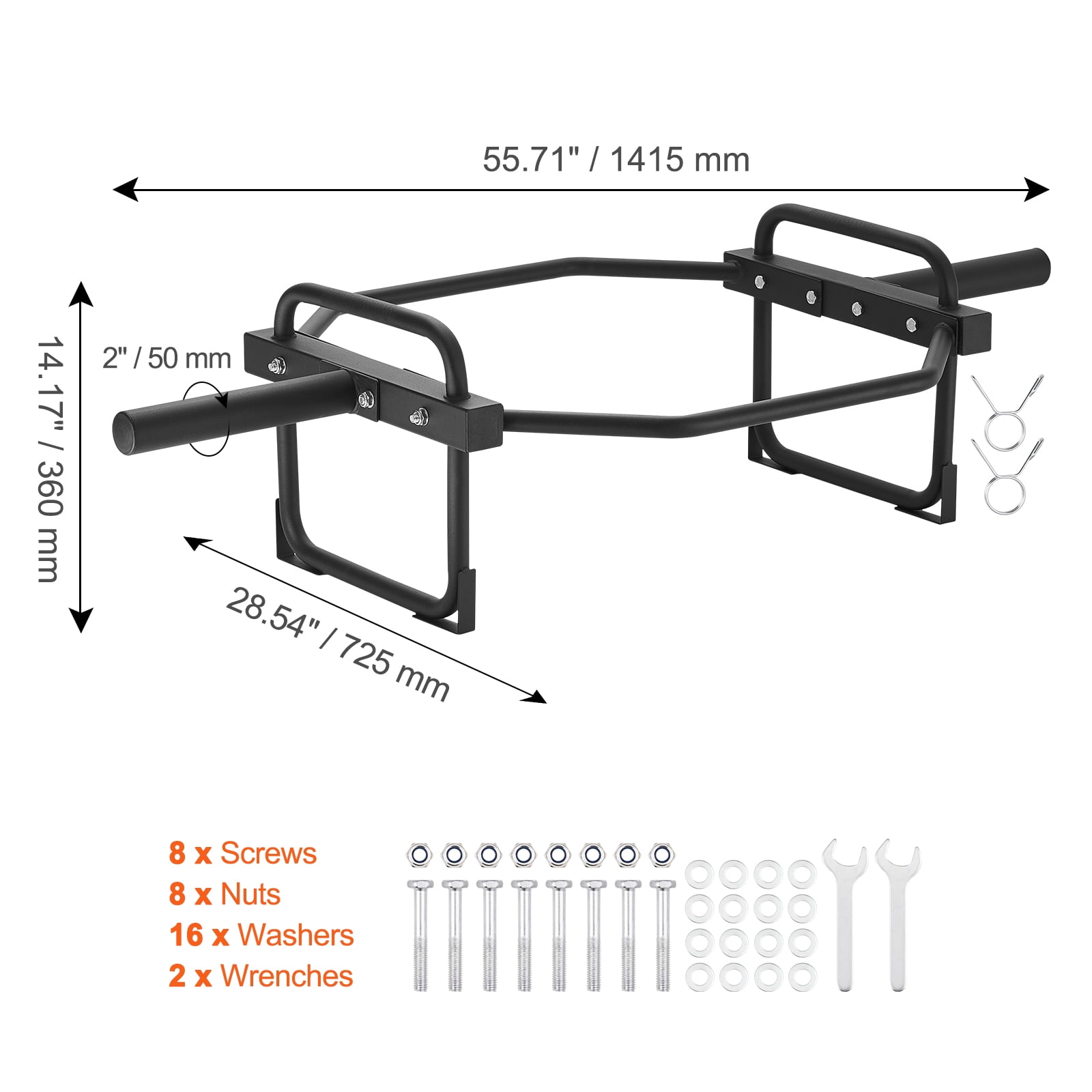 Product Description Trap Bar This trap bar is a fitness equipment designed for your workouts, and it protects your shoulders and upper body during training. It allows you to comfortably exercise your glute muscles while also targeting your thighs and hamstrings. Whether you have injuries or not, it will be a valuable supplementary training tool in your arsenal. It offers comprehensive workouts for major muscle groups like the chest, legs, and back, helping you sculpt your ideal muscles! Superb Weight Capacity Our trap bar is meticulously crafted with seamless welding technology to support weights of up to 1500 pounds, helping you achieve the perfect fitness lines. Full-Body Muscle Workout This versatile training equipment allows you to target all major muscle groups in your body, including the chest, abdomen, back, thighs, calves, forearms, neck, and shoulders, ensuring balanced development throughout your body. 2-Foot Barbell Shaft Our bar easily accommodates standard weight plates available in the market. Even beginners can operate it effortlessly, ensuring safe and effective squat training. Balanced Strength Training You can add extra weight to each end to increase the difficulty and effectiveness of your workouts, making your training more diverse. Equipped with safety clips, ensuring the stability and reliability of weight plates, allowing you to focus on deadlifts and squats. Space-Saving Design Our squat equipment is thoughtfully designed to meet your training needs while occupying minimal space. You can start exercising anytime, anywhere, creating a healthy and comfortable personal space for yourself. Durable Structure Made from thick steel and utilizing seamless welding technology, our squat equipment is built to last, ensuring long-term use. Specifications Item Model Number: YQ-003 Middle Bar Diameter: 25mm Total Length: 1415 mm Dumbbell Bar Diameter: Compatible with 2-inch weight plates Maximum Weight Capacity: 500 pounds / 225 kg Product Weight: 19.84 pounds / 9 kg Product Dimensions: 55.71 x 28.54 x 14.17 inches / 1415 x 725 x 360 mm Packaging Dimensions: 29.33 x 16.34 x 5.12 inches / 745 x 415 x 130 mm Package Content 1 x Trap Bar 8 x Screws 8 x Nuts 16 x Washers 2 x Wrenches