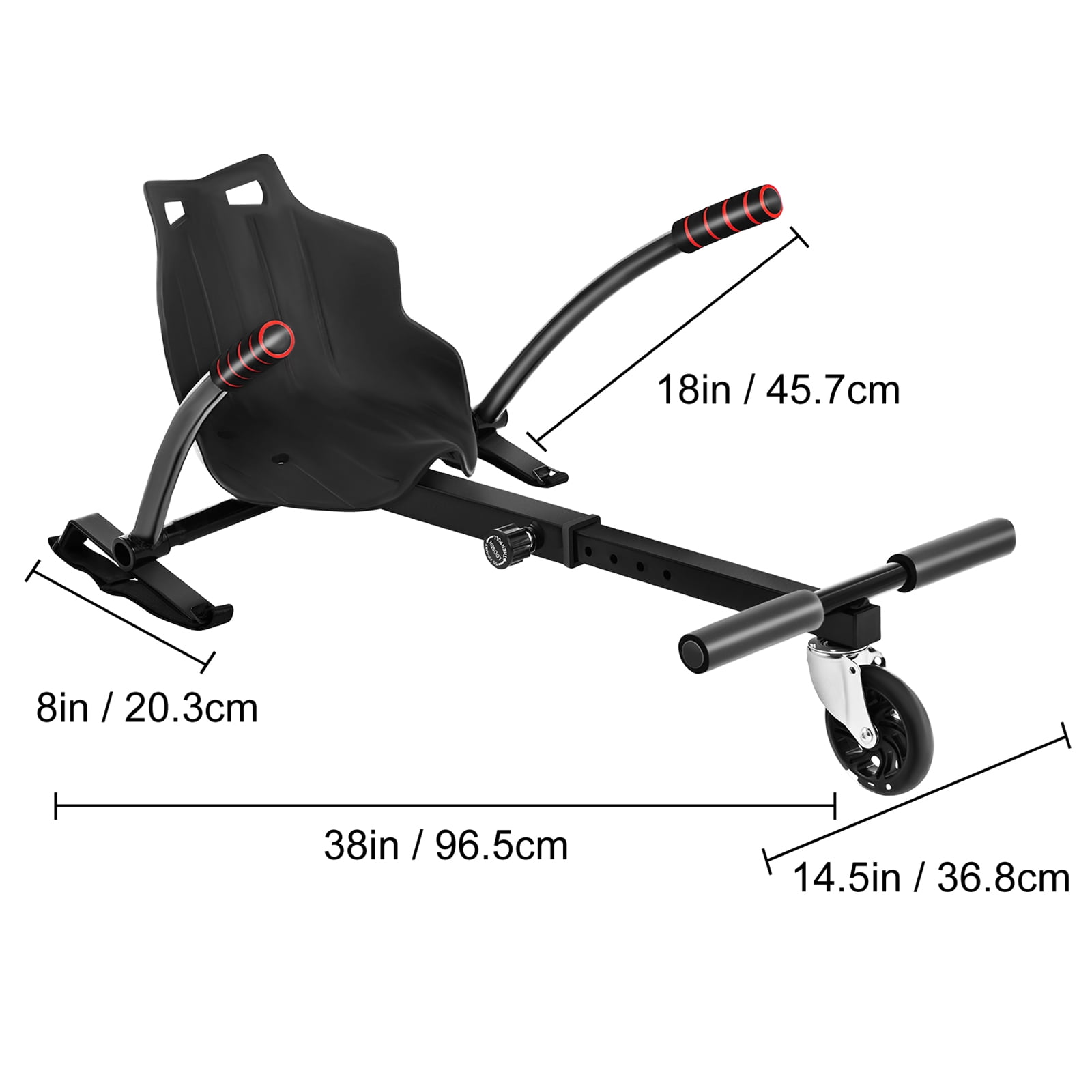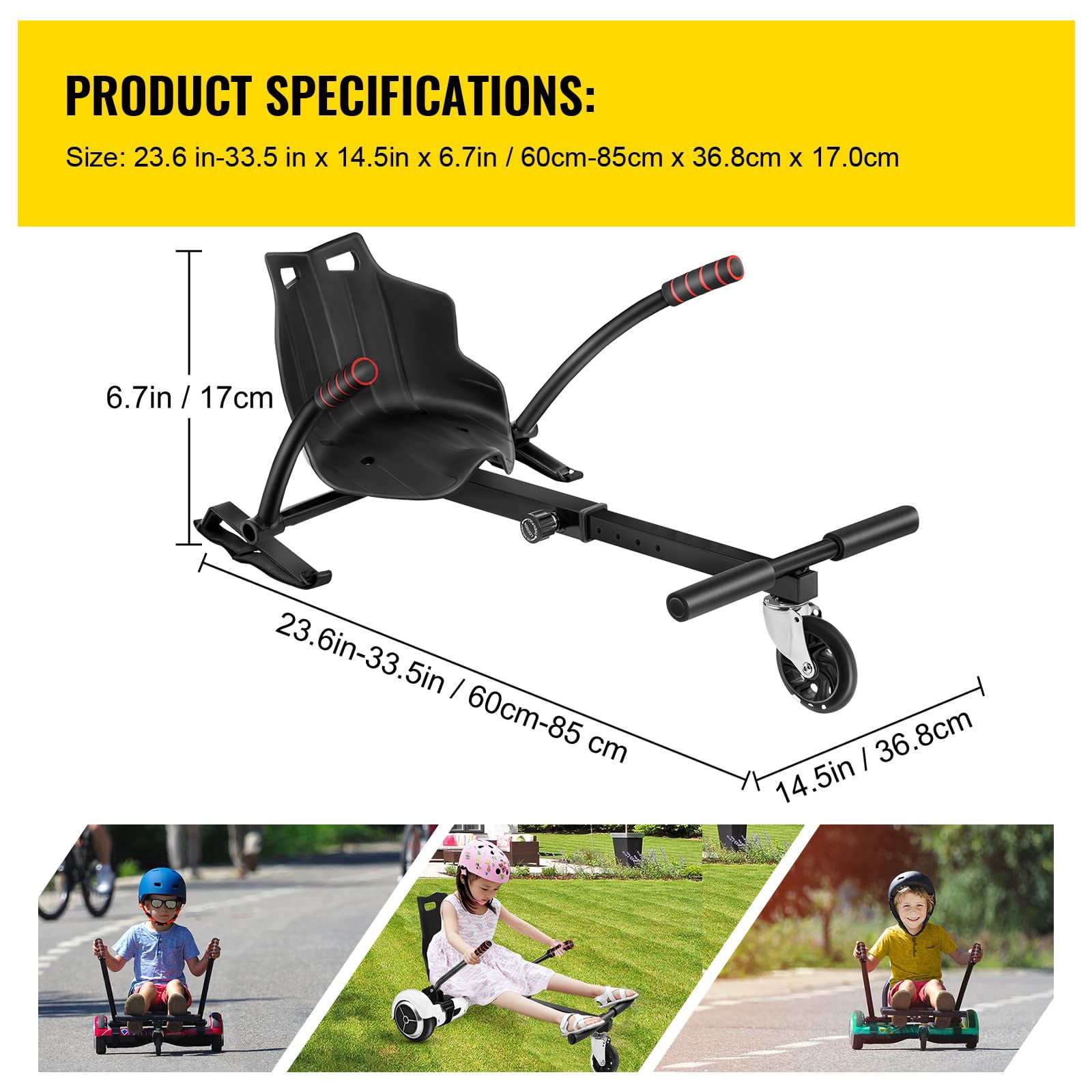 Product Description KFFKFF Hoverboard Seat Attachment Experience the thrill of outdoor adventures with the KFFKFF Hoverboard Seat Attachment. Designed to fit 6.5″, 8″, and 10″ hoverboards, this attachment is perfect for riders of all ages, from 4 to 65 years old. With a maximum weight capacity of 220 lbs, it ensures a secure and comfortable ride for everyone.The adjustable length of 23.6″-33.5″ allows you to customize the seat attachment according to your preference, providing optimal comfort and control. Whether you’re cruising through the neighborhood or exploring new terrains, this hoverboard seat attachment guarantees a smooth and exciting ride.Equipped with a 360° wheel, you can effortlessly maneuver in any direction, giving you full control over your hoverboard. It offers a thrilling and immersive experience, making it an ideal gift for kids and adults alike.Not only does the KFFKFF Hoverboard Seat Attachment provide endless fun, but it also ensures safety. Its sturdy construction and secure fitting mechanism ensure a reliable and stable ride, giving you peace of mind while enjoying your outdoor time with family and friends.Upgrade your hoverboard experience with the KFFKFF Hoverboard Seat Attachment. Get ready for unforgettable adventures and create lasting memories with this must-have accessory. Enhanced Safety & Exciting Experience Experience the thrill of riding a go-kart while ensuring maximum safety with our KFFKFF kart accessories. These accessories provide a stable seated position, reducing the risk of serious injuries. Get ready for an exhilarating and enjoyable ride! Versatile Compatibility Our hoverboard seat attachment is designed to fit perfectly with 6.5″, 8″, and 10″ hoverboards. The durable straps and screws allow for easy adjustments and a secure fit. Customizable Length Enjoy a comfortable ride no matter your height. The adjustable length of our hoverboard attachments ranges from 23.6 to 33.5 inches, ensuring a perfect fit for individuals of different body heights. Robust & Reliable Construction Experience the durability and stability of our KFFKFF kart kit. Crafted with high-quality materials, this kart kit is built to withstand a weight of up to 220lbs. Whether you’re a kid or an adult, rest assured that it can handle your adventurous spirit. Effortless Assembly Setting up your hoverboard seat attachment has never been easier. Even for beginners, it takes just 5 minutes to assemble. Simply attach the two side handles, screw the seat to the frame, and secure the hoverboard with the provided straps. Unleash the Fun Elevate your hoverboard experience and create lasting memories with your loved ones. Our KFFKFF hoverboard seat attachment guarantees endless fun and joyful moments for you, your family, and your friends. Specifications Model: 2016HFFLPHCJ Fit for: 6.5″/8″/10″ hoverboards Bearing Weight: 220 lb (99.79 kg) Feature: LED Front Wheel Length: 23.6 in-33.5 in/60 cm-85 cm Width: 14.5 in/ 36.8 cm Handle Length: 18 in/45.7 cm Color: Black Weight: 15.9 lb (7.21 kg) Package Content 1 x Go Cart Seat (Hoverboard not included) 1 x Manual
