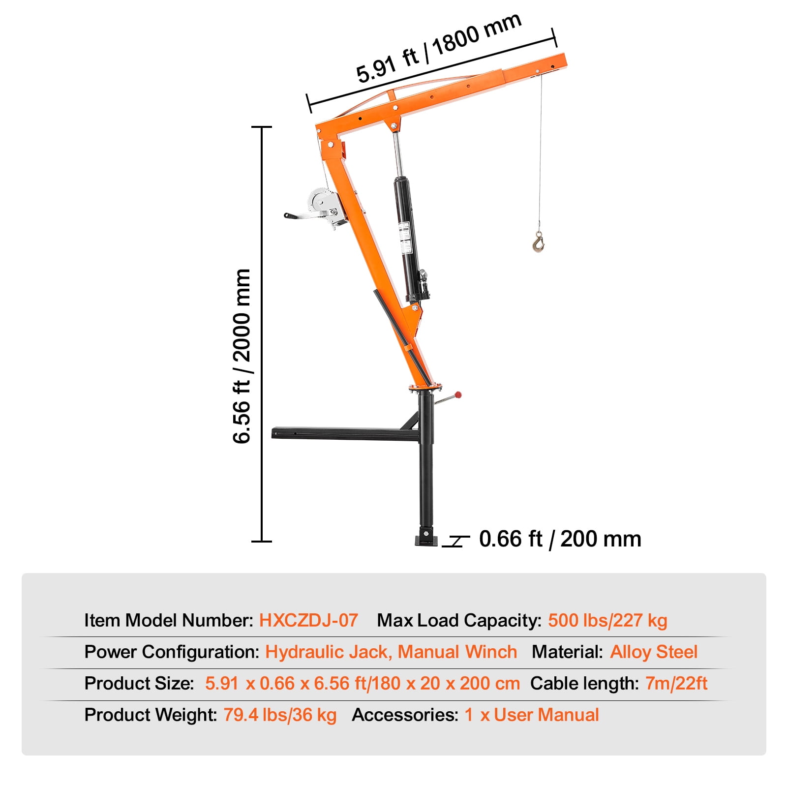 Product Description KFFKFF Pickup Truck Crane Experience the ultimate in cargo lifting capabilities with our KFFKFF truck crane. Designed for maximum flexibility and efficiency, this crane features a manual drive that allows for quick and easy operation. With its wide operating range, it is the perfect solution for a variety of tasks including logistics, rescues, engineering projects, fieldwork, and more. Our crane offers powerful load capacity, ensuring that you can tackle even the toughest lifting jobs with ease. The effortless manual control allows for precise positioning and movement, while the flexible telescoping feature provides added reach and versatility. With 360° swivel control, you have complete freedom to maneuver and position your cargo exactly where you need it. Crafted with durability in mind, our crane is built to withstand the rigors of heavy-duty use, ensuring long-lasting performance. Trust in the reliability and strength of KFFKFF for all your lifting needs. Reliable Load Capacity The KFFKFF truck crane is expertly crafted using durable and robust materials, ensuring a reliable load capacity. Experience a stable and solid lift for even your heaviest loads. Convenient Manual Control No access to a power outlet? No worries! The KFFKFF truck bed crane offers manual control, allowing you to operate it freely, anytime and anywhere. It’s ready to take on any lifting challenge in any environment. Adaptable and Versatile With its multi-stage adjustable jib crane, the KFFKFF truck crane can easily adapt to various heights and angles. Boost your efficiency with pinpoint precision, as it caters to every scene and demand. Long-lasting Durability Crafted from high-strength and corrosion-resistant alloy steel, the KFFKFF pick up crane ensures exceptional performance even in the toughest conditions. It stands strong for years to come, providing you with a reliable lifting solution. Portable and User-Friendly Design Experience ultimate convenience with the KFFKFF foldable crane for trucks. Its compact and foldable design allows for easy transportation and minimal space usage. Whether it’s a short trip or a long journey, this crane seamlessly integrates with your vehicle. Versatile Range of Applications From construction sites and factories to on-board lifting, the KFFKFF pickup truck hoist crane is your go-to tool. It handles engines, wood, and workshop equipment with ease, making outdoor adventures more enjoyable and hassle-free. Specifications Item Model Number: HXCZDJ-07 Max Load Capacity: 500 lbs/227 kg Power Configuration: Hydraulic Jack, 1000 lbs Manual Winch Material: Alloy Steel Product Weight: 79.4 lbs/36 kg Product Size: 5.91 x 0.66 x 6.56 ft/180 x 20 x 200 cm Cable Length: 22 ft/7 m Package Content 1 x Truck Crane