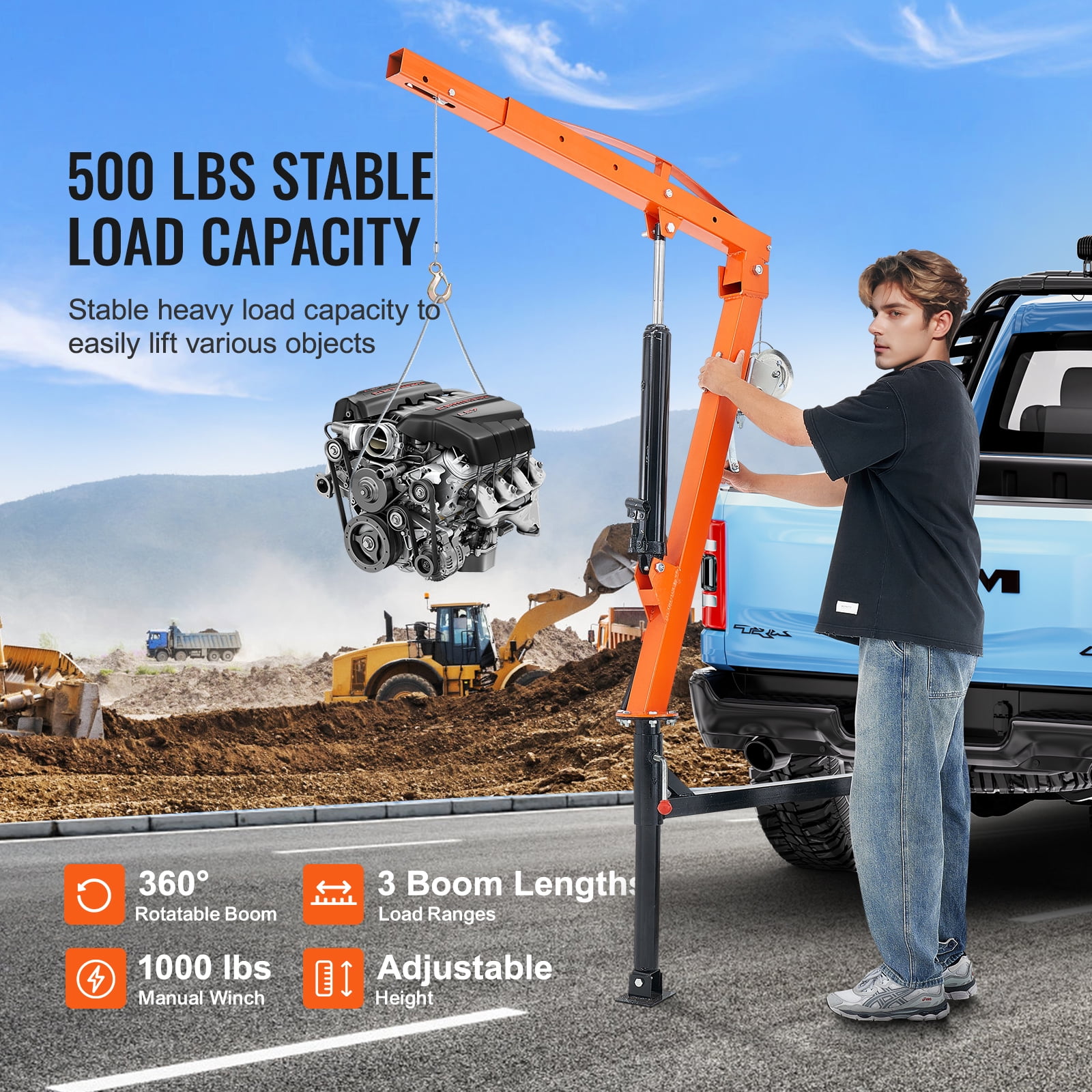 KFFKFF truck crane has a powerful load capacity of up to 500 lbs, thanks to its tough and high-strength alloy steel construction. It can handle weight challenges even in extreme operating conditions. Experience effortless manual control with the hydraulic winch of our truck bed crane. No complex wiring required! It makes lifting a breeze, perfect for vehicle rescue or cargo handling with minimal effort. Ready for any spontaneous or urgent tasks on the go! The boom of our jib crane offers flexible telescoping with a range of 36.22-48.8-55.1 in/0.92-1.24-1.4 m. With 3-level telescoping, it can adapt to any height or weight, seamlessly fitting into various vehicles and scenarios. Enjoy 360° swivel control with our pick-up crane. It allows for quick turns and precise positioning without the need to shift your vehicle or load. Boost efficiency and convenience at every turn! Our crane for truck is sturdy and durable, crafted from durable alloy steel and coated with a baking finish. It can withstand harsh environments, ensuring a sleek, weather-resistant, and corrosion-free design. It will keep looking great and working hard for years to come.