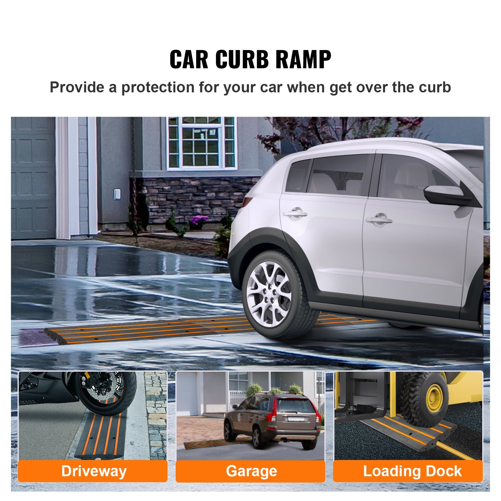 KFFKFF Curb Ramp with Channel: Size: 48.1″ L x 16″ W x 2.6″ H/122 x 40.5 x 6.5 cm. Facilitates easy and damage-free passage of motor vehicles over curbs or elevated sidewalks. Can be permanently installed in high-traffic areas to enhance safety in driveways, parking lots, and more. Channel size: 2.2″ W x 1.4″ H/5.5 x 3.5 cm. Features cable protection and water drainage. Max. 33069 lbs Capacity Rubber: Constructed with durable rubber that is recycled, wear-proof, and weather-proof. Ensures long-lasting usage in various outdoor conditions. Industrial-level rubber construction supports up to 33069 lbs of loading. Suitable for standard vehicles like SUVs, vans, mobile wheelchairs, motorcycles, bikes, scooters, and hand trucks. User-friendly Detail for Security: Surface equipped with non-slip texture strips for smooth and stable passage of vehicles. Bottom designed for shock absorption, controlling traffic speed without causing damage. Reflective black+yellow color provides high visibility, ensuring drivers and passer-by slow down even in low light environments. Full Accessory for Installation: Easy and cost-effective assembly of the curb ramp. Pre-drilled holes and mounting screws included. Can be used as a temporary device for children’s play areas or permanently installed on gravel, asphalt, and concrete roads to prevent theft or movement. Please measure your driveway curb ramp before choosing our product. Indoor & Outdoor Scenario: Versatile curbside bridge ramp suitable for both indoor and outdoor usage. Ideal for public places like playgrounds, venues, sporting events, exhibition halls, homes, garages, driveways, loading docks, and more.