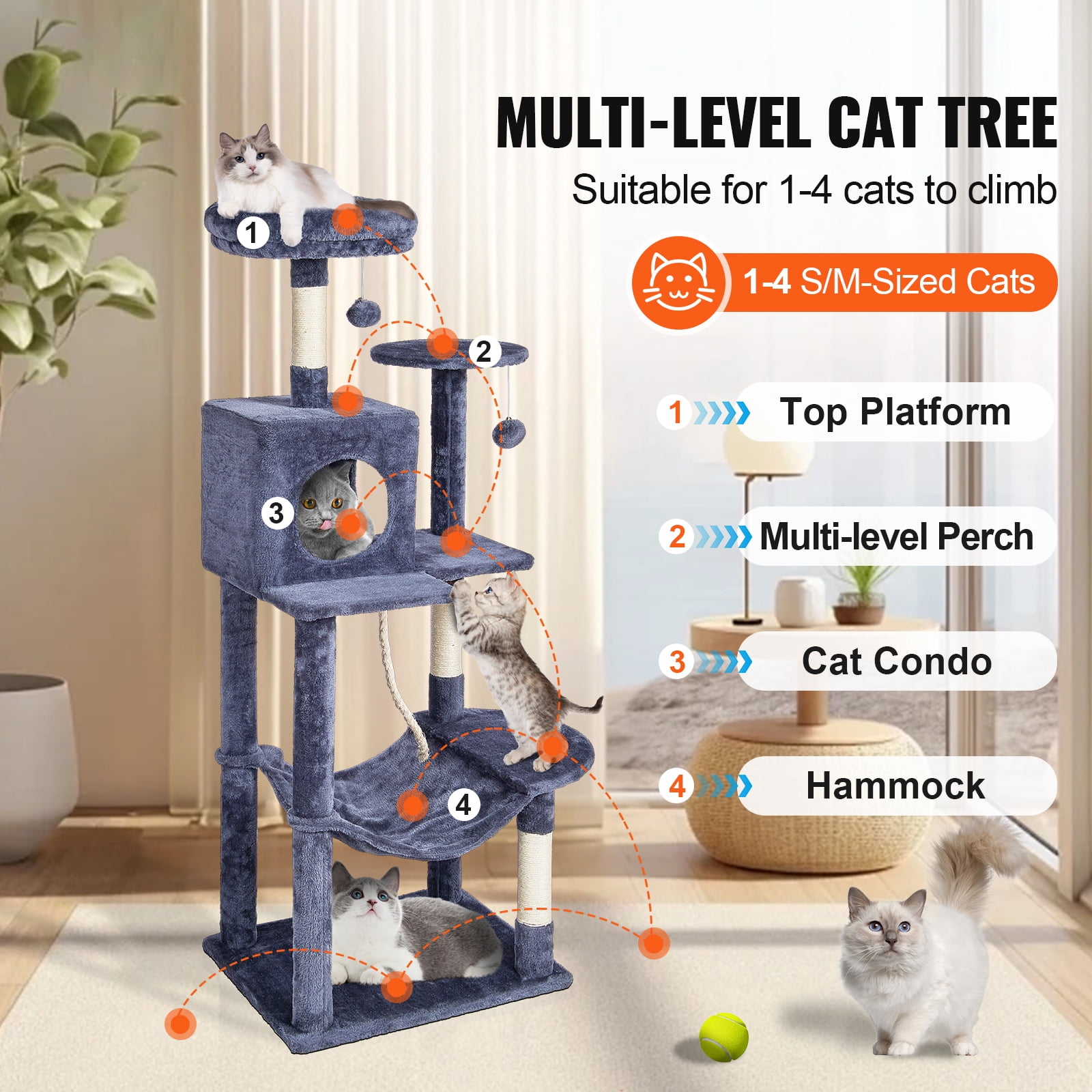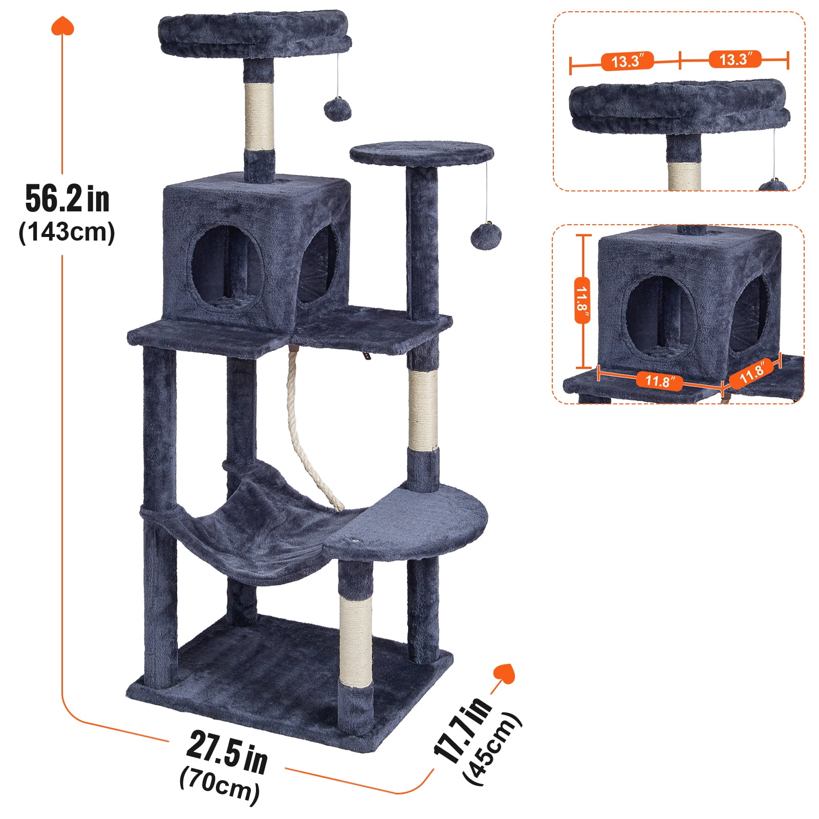 KFFKFF Cat Activity Center: This multi-level cat tree is designed for 1-4 small to medium-sized cats. It allows cats to climb and explore, satisfying their natural instincts. Cozy Resting Haven: Our cat tower features 2 spacious cat condos, a top perch, and a comfortable hammock, providing a private and secure resting environment for your feline friends. Multiple platforms allow cats to choose their preferred spots for play and rest. The soft plush surfaces are gentle on their skin and claws, ensuring a cozy lounging experience. Engaging Playtime for Cats: The hanging ball toys and spring balls on the cat scratching tree are designed to attract cats’ attention and stimulate their playfulness. The sisal-wrapped scratching posts allow cats to stretch and exercise, keeping them active, relieving boredom and stress, and preventing furniture damage. Effortless Installation: Our cat tree for indoor cats comes with pre-drilled holes and detailed assembly instructions, making installation a breeze. All necessary screws, bolts, wrenches, and expansion screw kits are included. Even first-time users of pet furniture can easily set it up, saving time and effort. Safe and Stable: Crafted from P2 grade particle board, this cat house ensures excellent stability with its wide base and thickened sisal poles. It also includes an anti-toppling strap for wall fixation, preventing tipping and ensuring the safety of your cats. Suitable for various locations such as living rooms, bedrooms, balconies, courtyards, as well as pet stores, veterinary clinics, and grooming salons.
