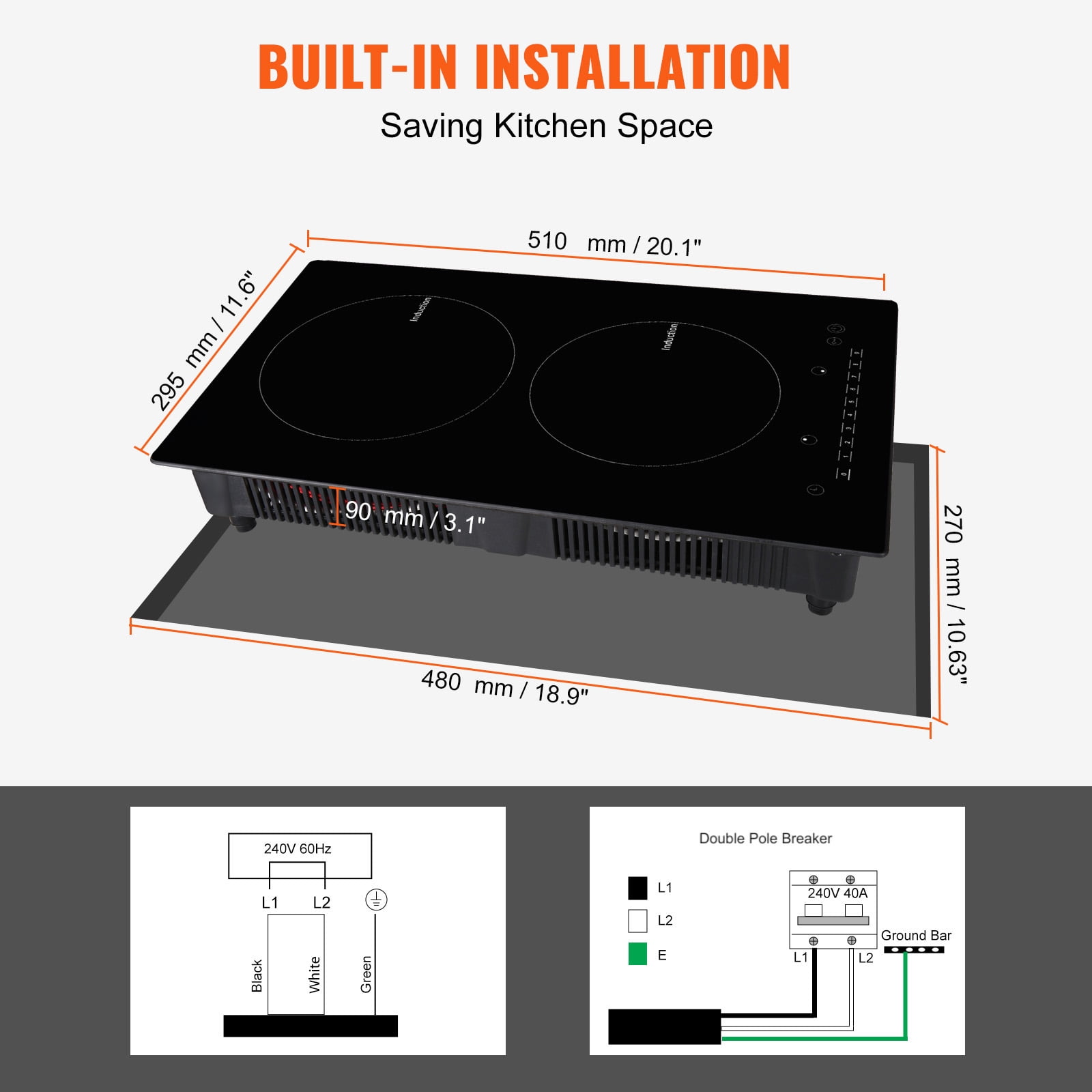 Compact and Convenient: The KFFKFF induction cooker is designed to be portable, making it easy to use in any kitchen. With 9 heat settings, you can easily stew, fry, simmer, steam, boil, and grill your favorite dishes. The powerful 1800W output ensures quick heating, so you can enjoy your meals in no time. Easy-to-Use Touch Control: This cooker is compatible with a variety of high-temperature cookware, such as cast iron and stainless steel. It allows you to cook on 2 burners simultaneously, increasing efficiency and minimizing heat loss. Precise Heat Adjustment: The touch-sensitive panel of the KFFKFF induction cooker offers high sensitivity, allowing you to easily adjust the heat to your desired level. Each cooking zone can be controlled independently, and it also includes a timer function (1-99 minutes) and a pause button for added flexibility and convenience in the kitchen. Safety First: The KFFKFF induction cooker prioritizes your safety with 5 built-in safety functions. These include automatic shut-off, spill-proof design, child safety lock, residual heat indication, and temperature protection. It is perfect for pregnant women and the elderly, ensuring peace of mind while cooking. Sleek and Space-Saving: The KFFKFF induction cooker is designed for built-in installation, saving valuable kitchen space. Its embedded design features round edges with no sharp corners, providing both style and safety. It is suitable for voltage ranging from 110-120V 50/60Hz.