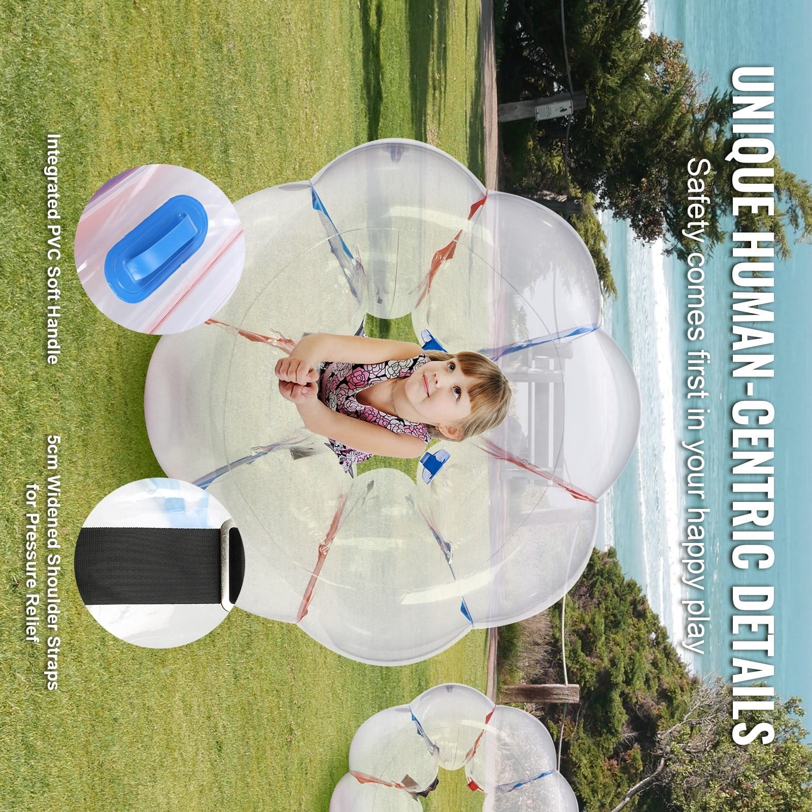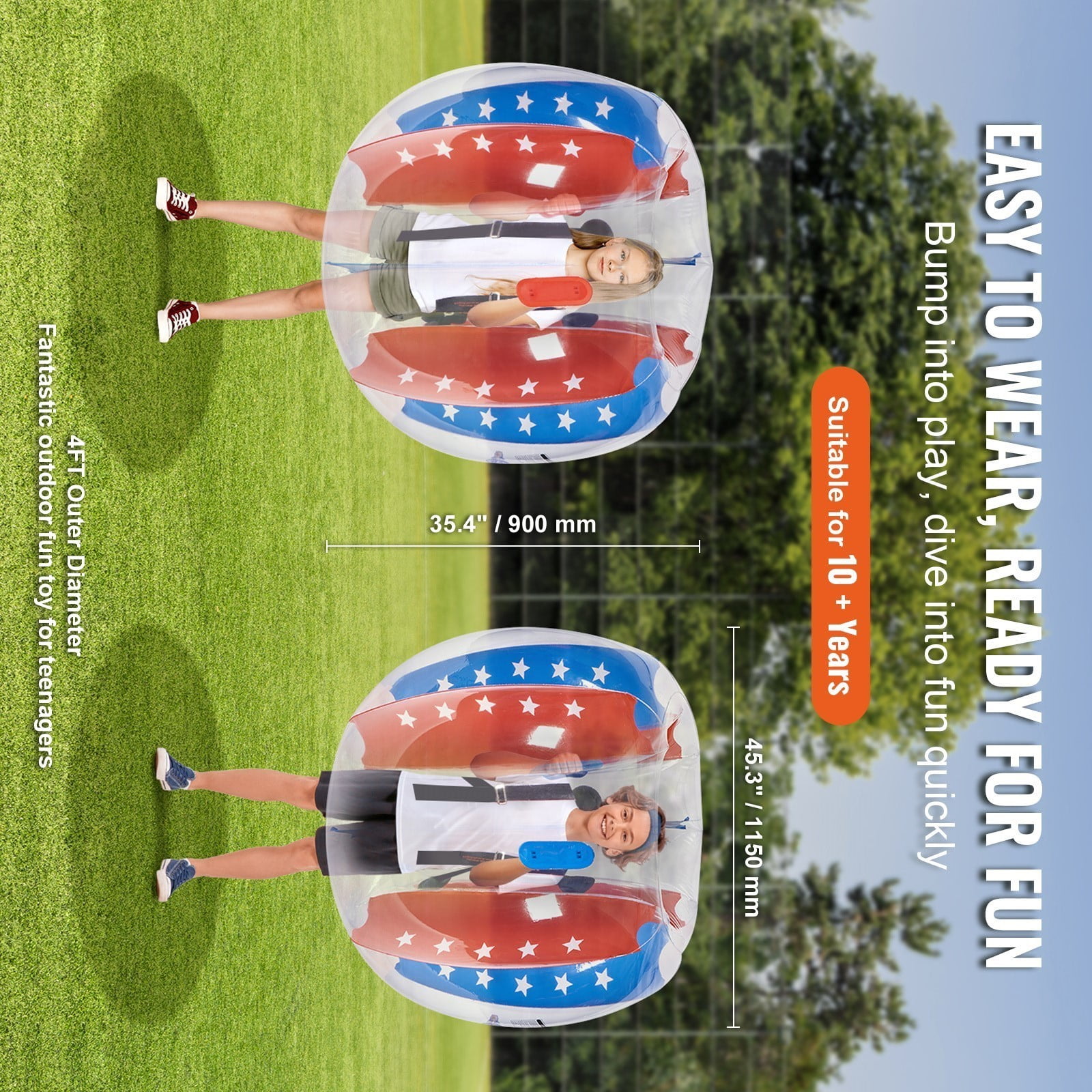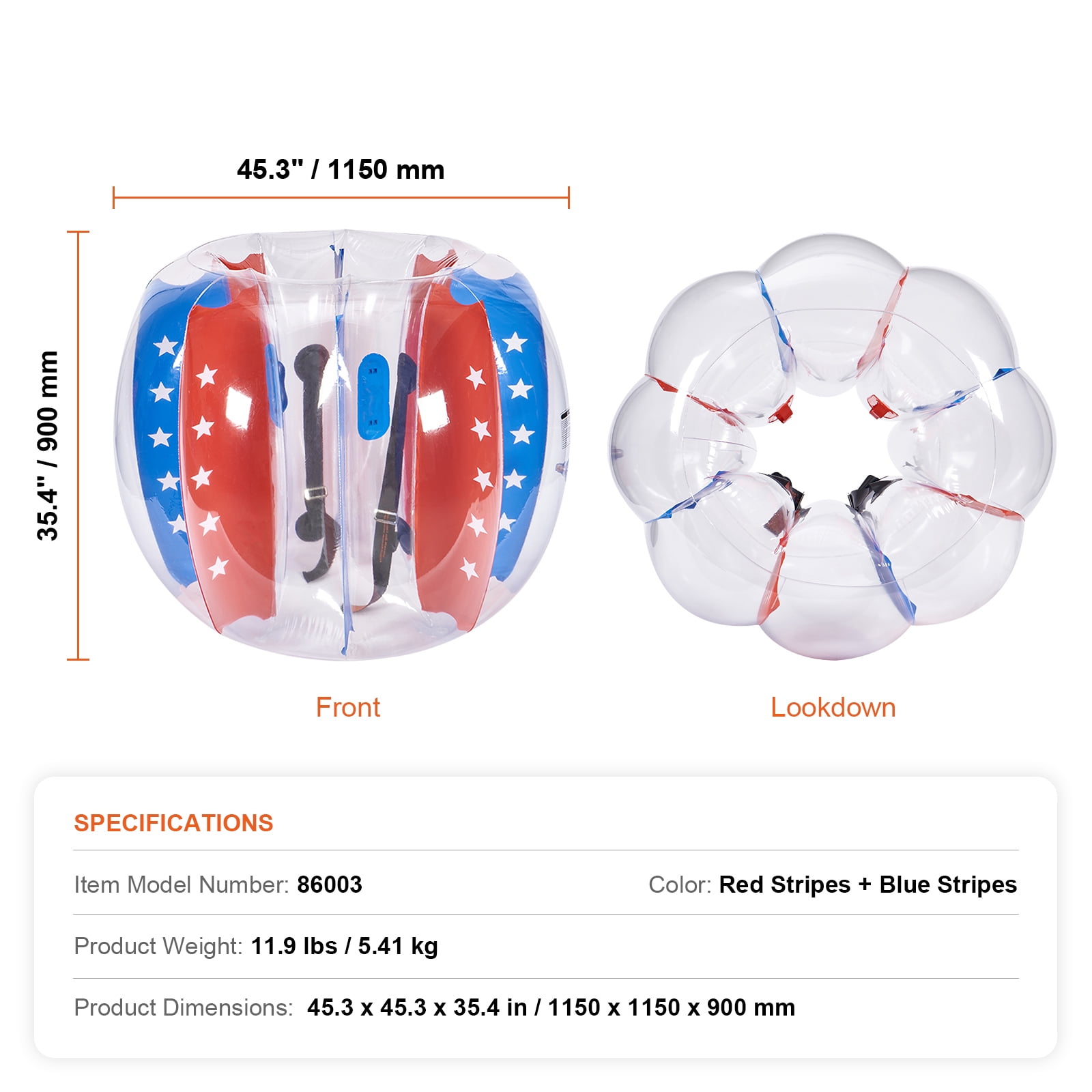 Product Description KFFKFF Inflatable Bumper Balls Unleash the ultimate fun with KFFKFF 2PCS inflatable bumper balls. Crafted from 0.3mm thick, explosion-proof PVC, our 4FT outer diameter bumper balls are designed for ultimate durability and safety. Get ready to bump into excitement and create unforgettable moments with KFFKFF bubble soccer balls! Security Comes First We’ve got safety covered with thickened PVC material, integrated soft handle, widened adjustable shoulder strap for comfortable fit, elastic polyester rope, advanced valve with tight sealing. Rest assured, our bumper bopper toys are built for both secure and enduring play. Easy and Convenient Our meticulously designed bumper balls, with easy-to-wear features, offer you great convenience for game time. Choose our bumper balls now, and enjoy the joy with friends! Simple Setup for Endless Entertainment Simple to use, each set includes a detailed instruction manual and 2 repair patches. The process is straightforward: simply unfold the product, unscrew the large inflation valve, inflate with an air pump (not included), and quickly tighten the valve once it’s fully inflated to start the game. Unforgettable Fun Bumper ball games are a fantastic way to enjoy fun times with family and friends. They’re suitable for party, family gatherings, friend meet-ups, corporate team-building, or outdoor activities, but also bring joyful memories to everyone involved. Easy Storage In just a few minutes, the bumper balls can be deflated and then rolled up into a compact size for easy transportation and storage. They can be conveniently moved and stowed in a bag, trunk, or suitcase, allowing you to kick off an exciting bumper game anytime, anywhere. High Quality Material Made from 0.3mm PVC, the material is durable, odorless, waterproof, resistant to deformation, and boasts excellent seam integrity. It is thickened for enhanced burst resistance, ensuring safety and reliability, and designed for long-term use. Specifications Item Model Number: 86003 Color: Red Stripes + Blue Stripes Product Weight: 11.9 lbs / 5.41 kg Product Dimensions: 45.3 x 45.3 x 35.4 in / 1150 x 1150 x 900 mm Package Content 1 x Instruction Manual 2 x Repair Patches