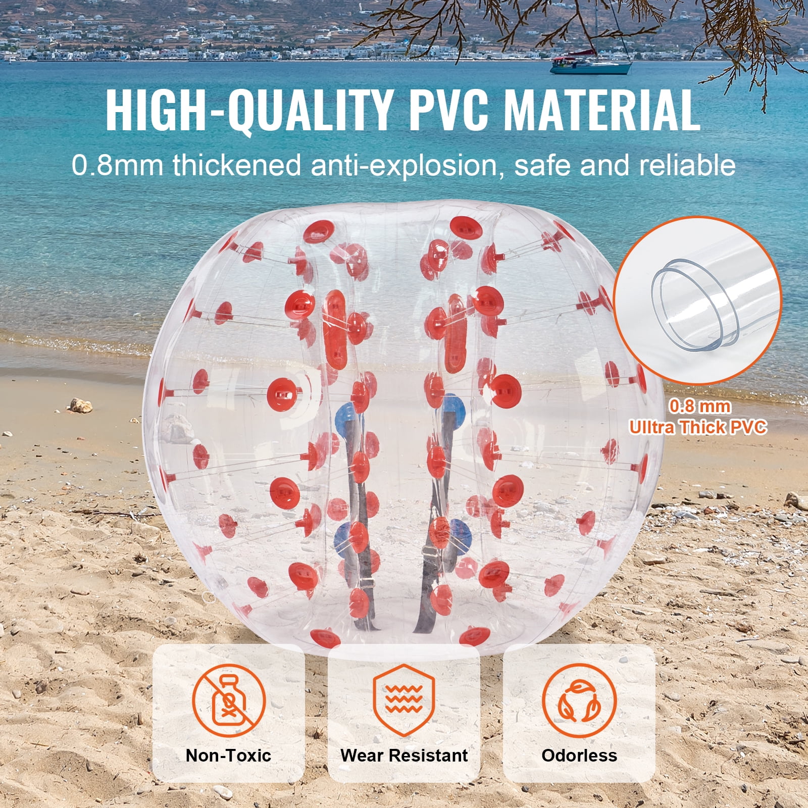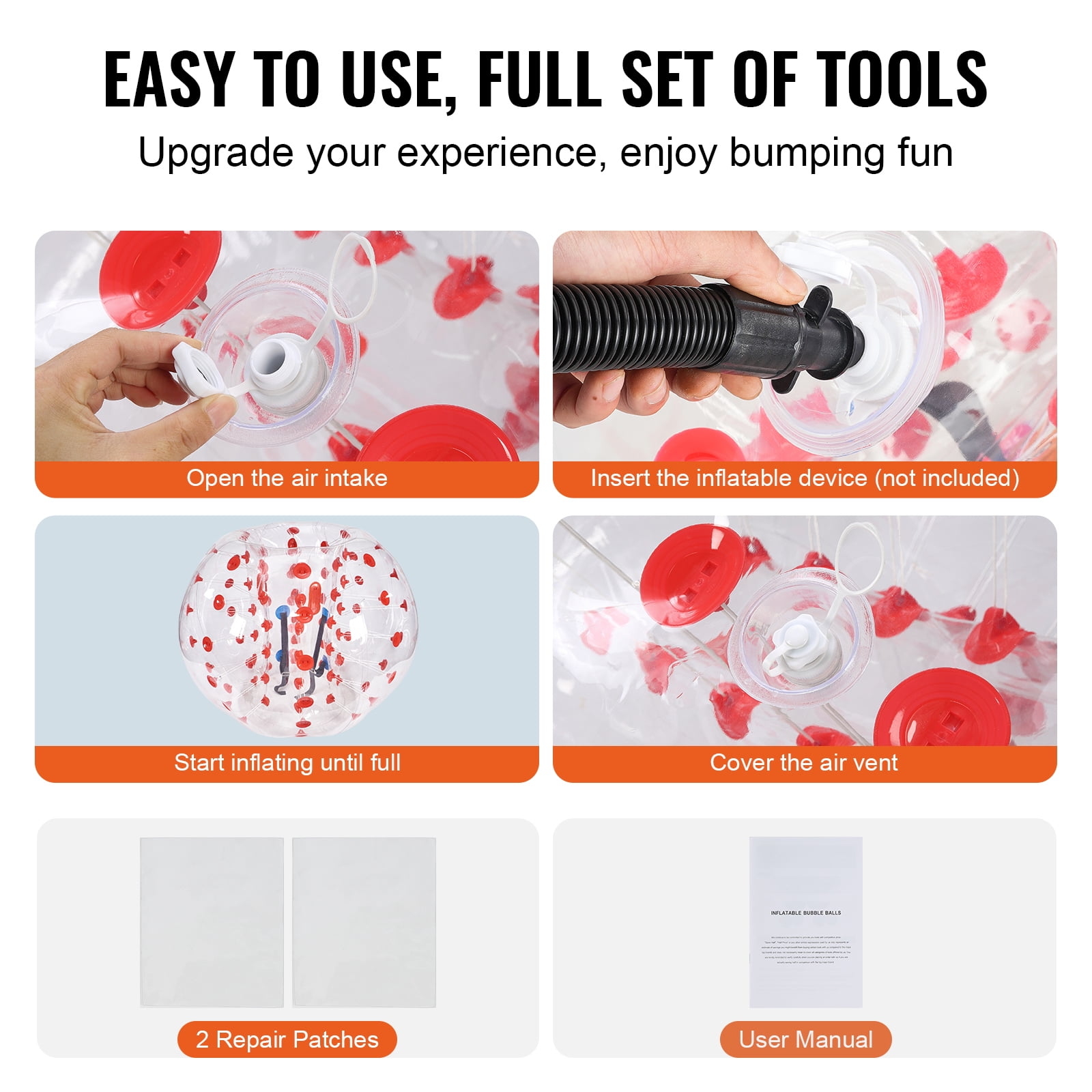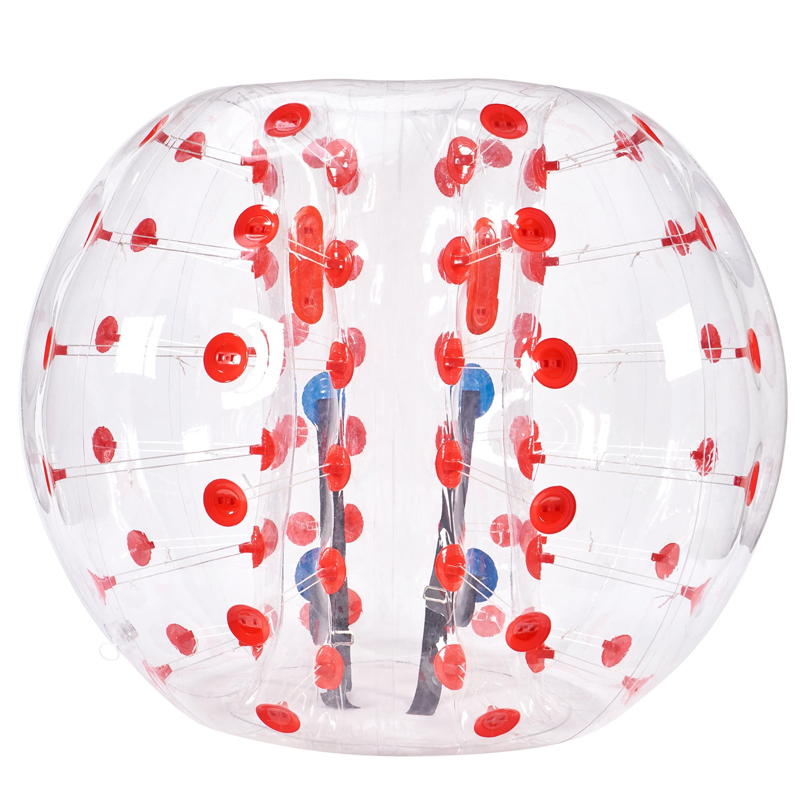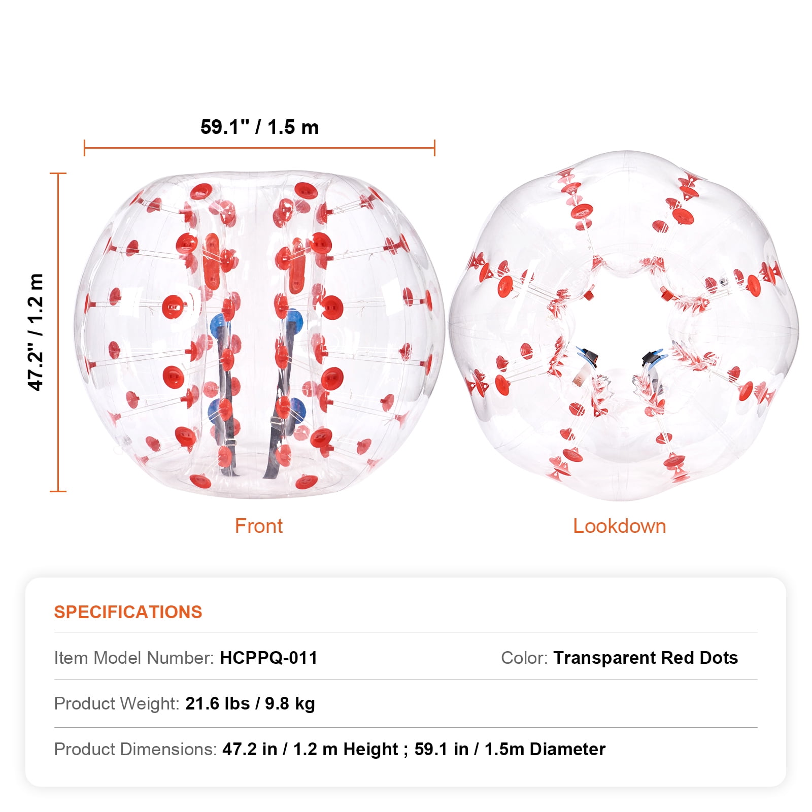 Product Description KFFKFF Inflatable Bumper Balls Unleash the ultimate fun with KFFKFF inflatable bumper balls. Crafted from 0.8mm thickened, explosion-proof PVC, our 5FT outer diameter bumper balls are designed for ultimate durability and safety. Get ready to bump into excitement and create unforgettable moments with KFFKFF bubble soccer balls! Security Comes First We’ve got safety covered with thickened PVC material, integrated soft handle, widened adjustable shoulder strap for comfortable fit, elastic polyester rope, advanced valve with tight sealing. Rest assured, our bumper bopper toys are built for both secure and enduring play. Easy and Convenient Our meticulously designed bumper balls, with easy-to-wear features, offer you great convenience for game time. Choose our bumper balls now, and enjoy the joy with friends! Simple Setup for Endless Entertainment Simple to use, each set includes a detailed instruction manual and 2 repair patches. The process is straightforward: simply unfold the product, unscrew the large inflation valve, inflate with an air pump (not included), and quickly tighten the valve once it’s fully inflated to start the game. Unforgettable Fun Bumper ball games are a fantastic way to enjoy fun times with family and friends. They’re suitable for party, family gatherings, friend meet-ups, corporate team-building, or outdoor activities, but also bring joyful memories to everyone involved. Easy Storage In just a few minutes, the bumper balls can be deflated and then rolled up into a compact size for easy transportation and storage. They can be conveniently moved and stowed in a bag, trunk, or suitcase, allowing you to kick off an exciting bumper game anytime, anywhere. High Quality Material Made from 0.8mm thickened PVC, the material is durable, odorless, waterproof, resistant to deformation, and boasts excellent seam integrity. It is thickened for enhanced burst resistance, ensuring safety and reliability, and designed for long-term use. Specifications Item Model Number: HCPPQ-011 Color: Transparent Red Dots Product Weight: 21.6 lbs / 9.8 kg Product Dimensions: 59.1 in/ 1.5 m Diameter ; 47.2 in/ 1.2 m Height Package Content 1 x Instruction Manual 2 x Repair Patches